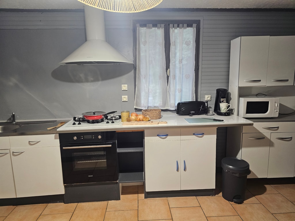 🍽️ Voll ausgestattete Küche mit Kühlschrank, Mikrowelle, Kochfeld und komplettem Geschirr