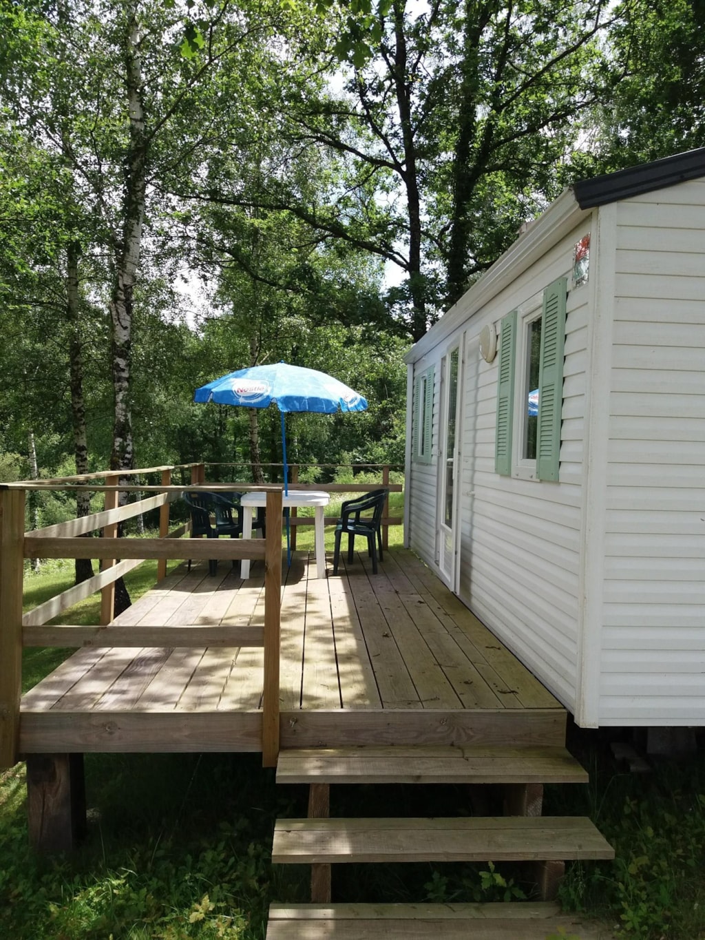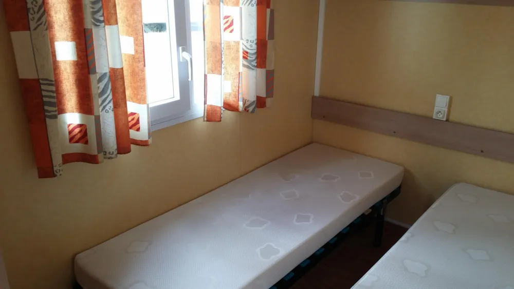 Mobil home Sunroller sans sanitaires -2 chambres (1 avec lit 140 x 190 et la 2ème 2 lits côte à côte 80 x 190), salon, cuisine équipée (gaz, frigo, micro-ondes, vaisselle). Belle terrasse extérieure non couverte avec salon de jardin - Le bloc sanitaire du camping est à votre disposition à proximité - Excellent rapport qualité /prix