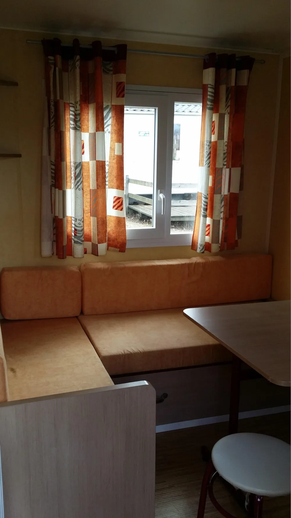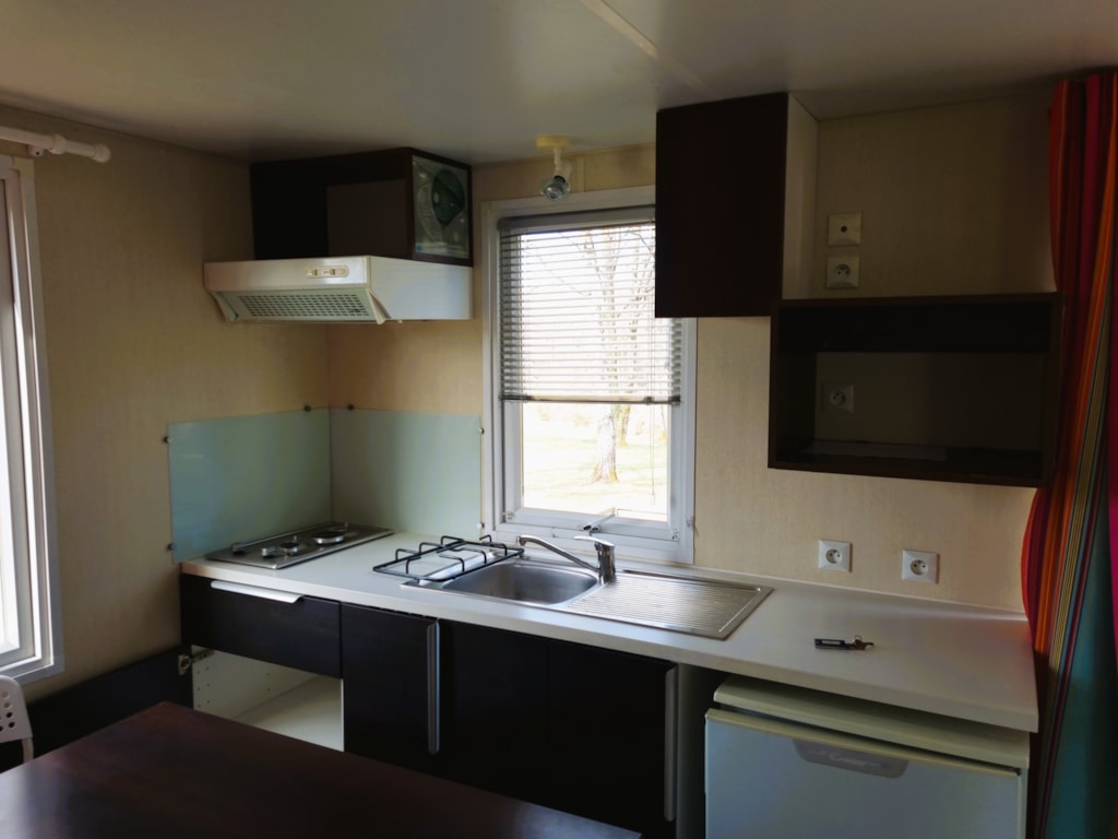 Mobil home 2 chambres (1 avec lit 140 x 190 et la 2ème 2 lits côte à côte 80 x 190) salon, cuisine équipée (gaz, frigo, micro-ondes, vaisselle), salle de bain, WC séparés. Belle terrasse extérieure non couverte avec salon de jardin
