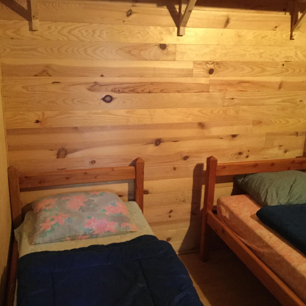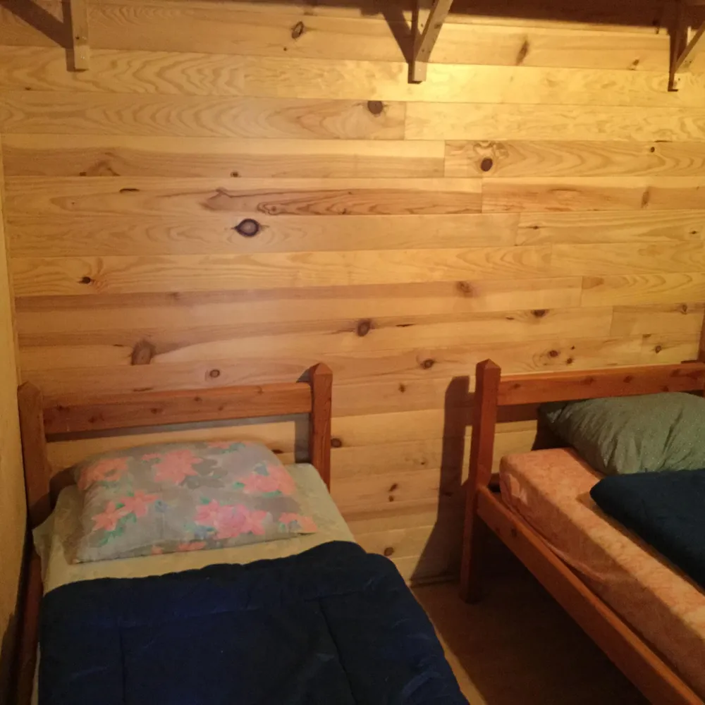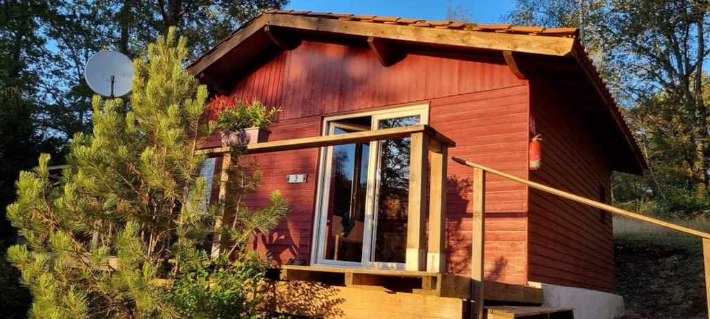 Chalet sans sanitaires -2 chambres (1 avec lit 140 x 190 et la 2ème 2 lits côte à côte 80 x 190), salon, cuisine équipée (gaz, frigo, micro-ondes, vaisselle). Belle terrasse extérieure couverte avec salon de jardin – ces locatifs surplombent l’étang – emplacement idéal pour les pêcheurs. Le bloc sanitaires est à votre disposition à proximité