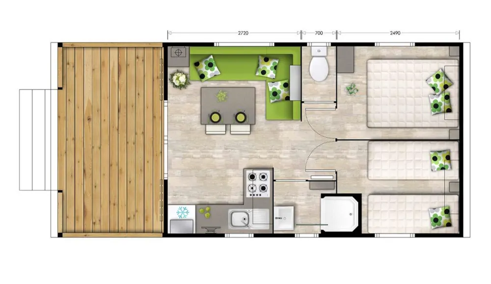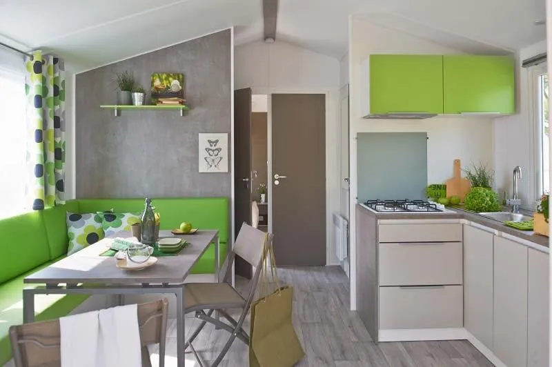 Domaine Périgord Vacances bietet zwei Mobilheimreihen an, damit jede Familie, je nach Budget, das finden kann, was sie sucht. Diese 32 m² großen Unterkünfte für 5 Personen sind alle identisch eingerichtet und verfügen über ein Doppelzimmer und ein Dreibettzimmer, ein Badezimmer, ein separates WC und eine Wohnküche. Draußen wurden großzügige Terrassen auf 9 m² angelegt und überdacht, auf denen Sie geschützt vor schlechtem Wetter oder der Sonne Ihre Mahlzeiten einnehmen, beim Gesang der Vögel ein Nickerchen machen und auf Ihrem Liegestuhl entspannen können.