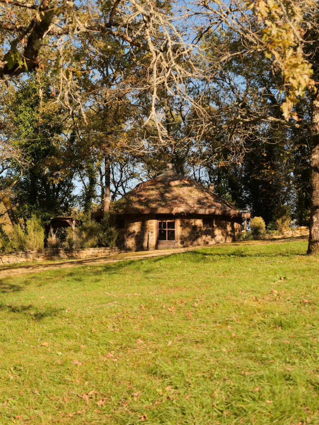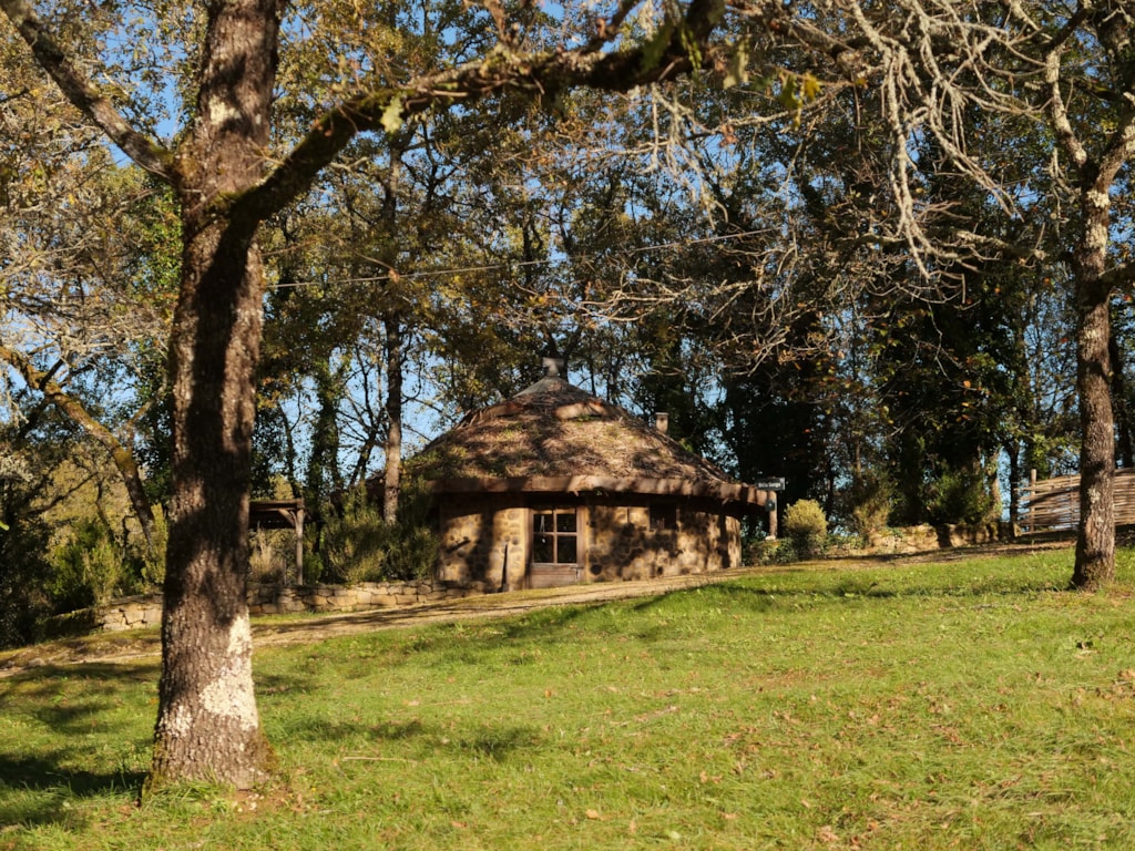 Kleine runde Hütte, komplett aus Périgord-Holz (Holz vom Grundstück und von einem Fachmann behandelt). Es verfügt über eine Kapazität von 3 Betten (Doppelbett und ein Einzelbett im Obergeschoss), erweiterbar auf 5 Betten (Schlafsofa). Küchenbereich, Badezimmer inklusive und durch eine Trennwand getrennt, mit italienischer Dusche (Flusskiesel).