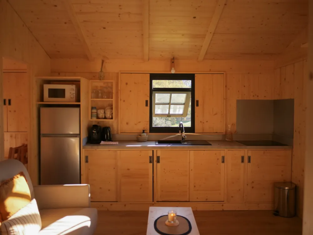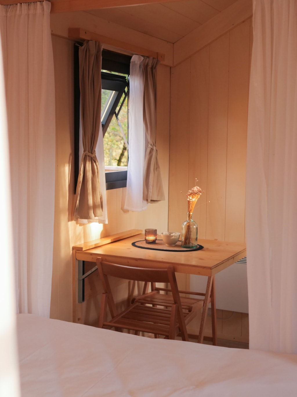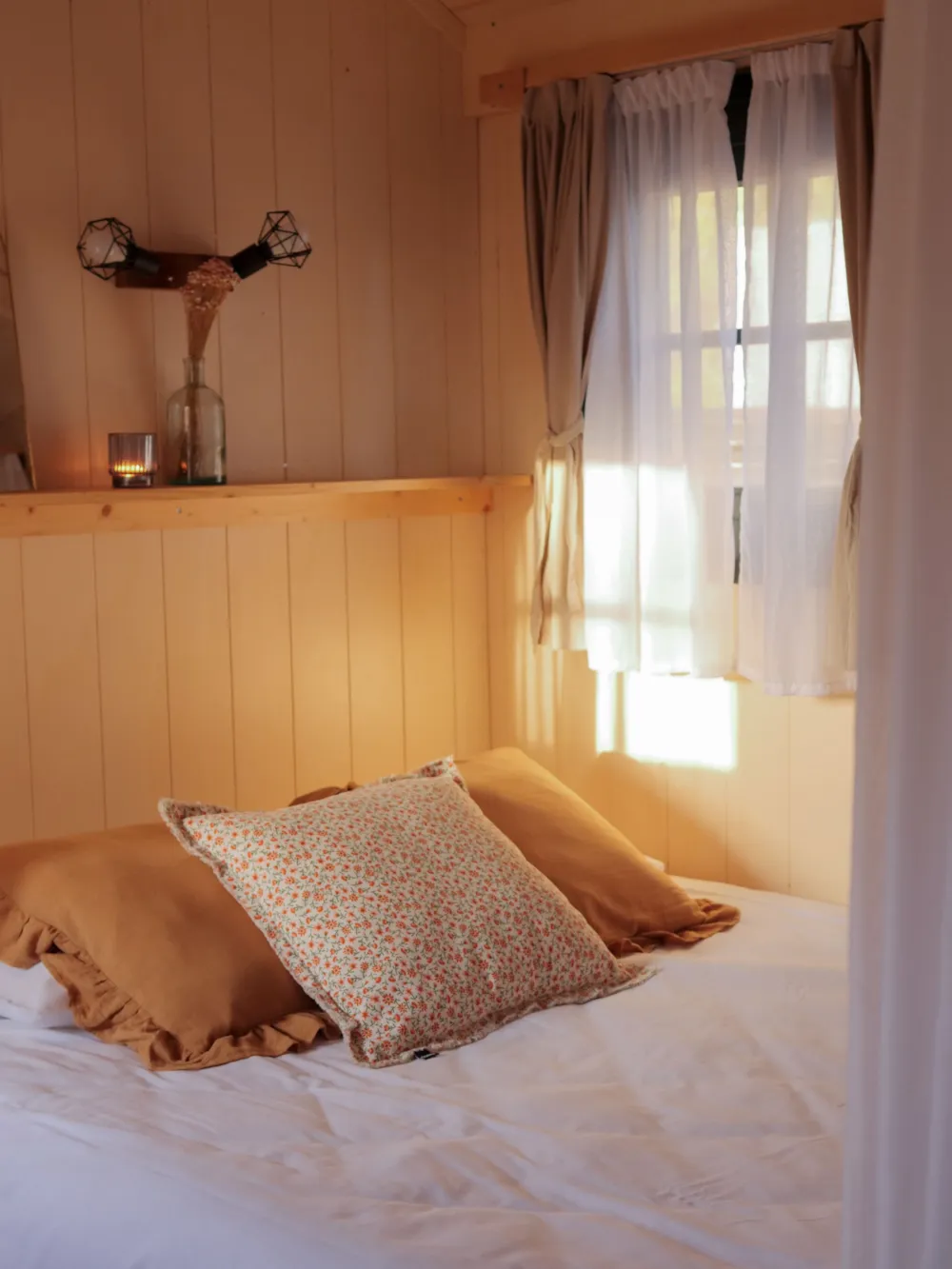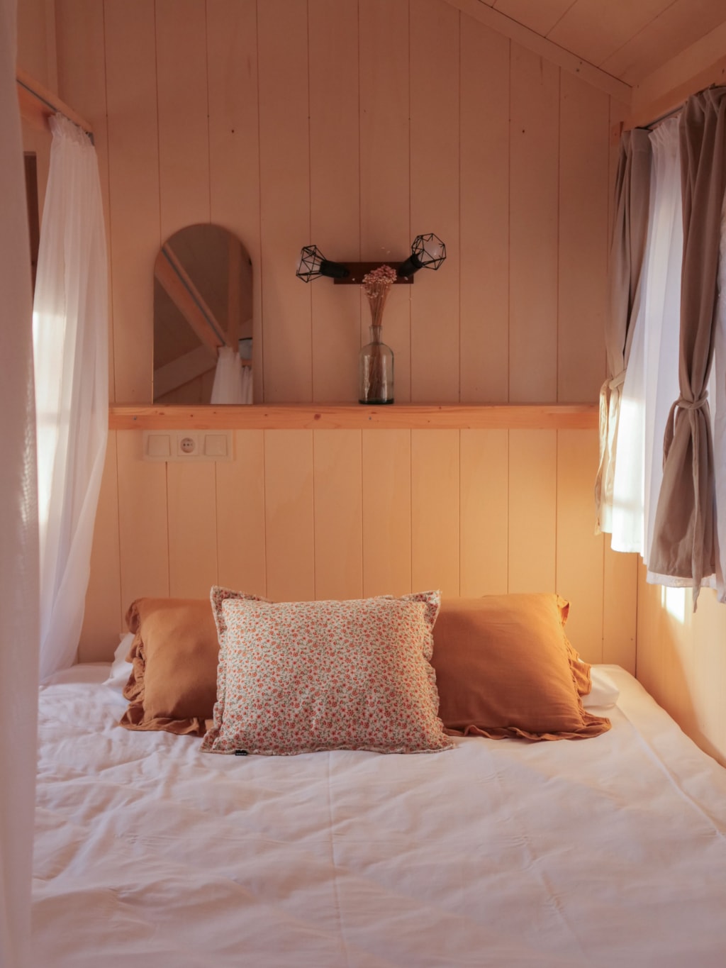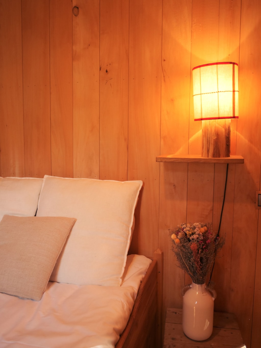 Intern haben wir an alles gedacht, damit Sie lange oder kurze Aufenthalte verbringen können. Ihnen steht eine kleine Küche zur Verfügung, ein separates Badezimmer mit WC, Dusche und kleinem Waschbecken und natürlich im Hauptraum ein großes Bett für 2 Personen, umgeben von feinen Vorhängen, damit Sie sich wie in einem echten Kokon fühlen.