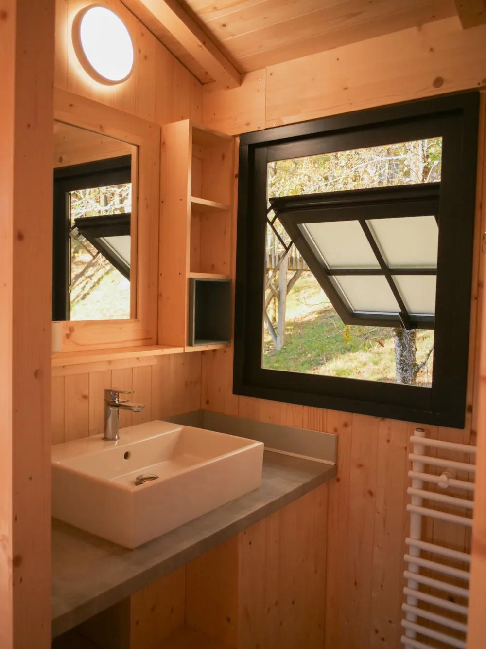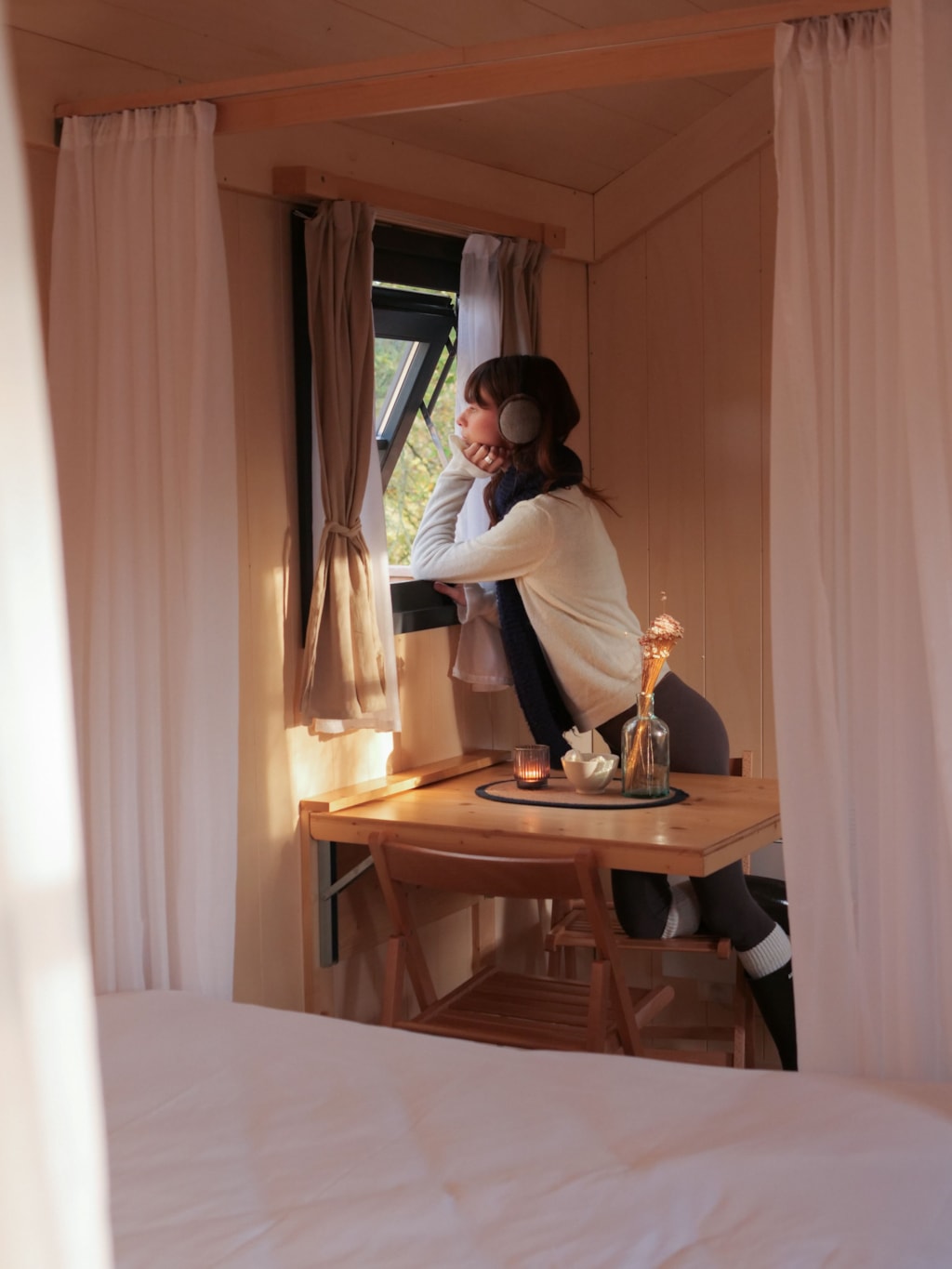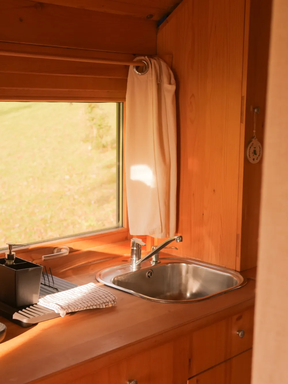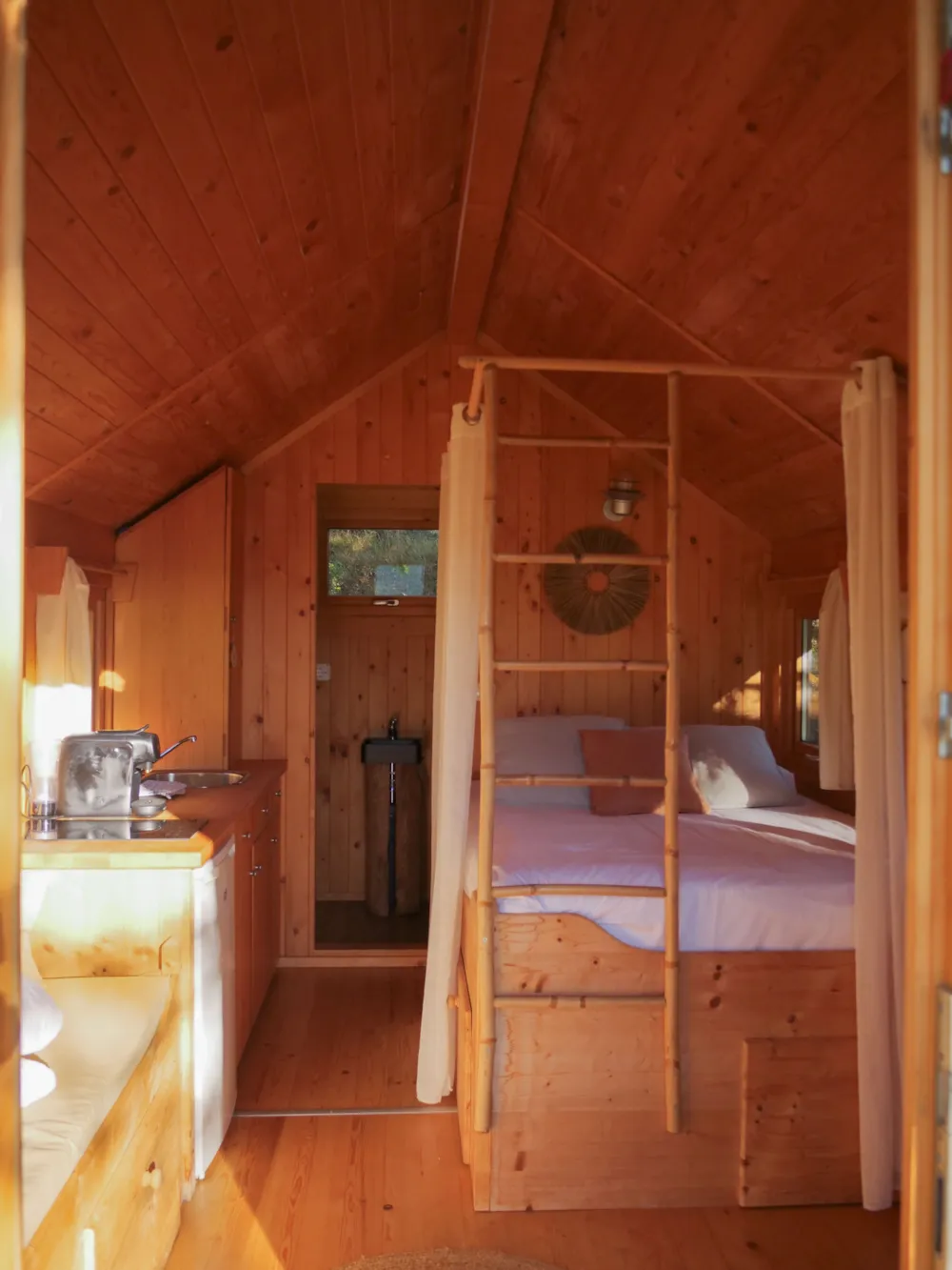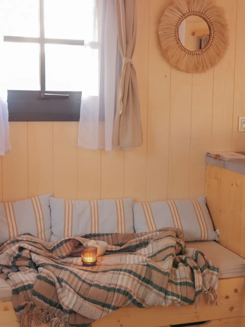 Intern haben wir an alles gedacht, damit Sie lange oder kurze Aufenthalte verbringen können. Ihnen steht eine kleine Küche zur Verfügung, ein separates Badezimmer mit WC, Dusche und kleinem Waschbecken und natürlich im Hauptraum ein großes Bett für 2 Personen, umgeben von feinen Vorhängen, damit Sie sich wie in einem echten Kokon fühlen.