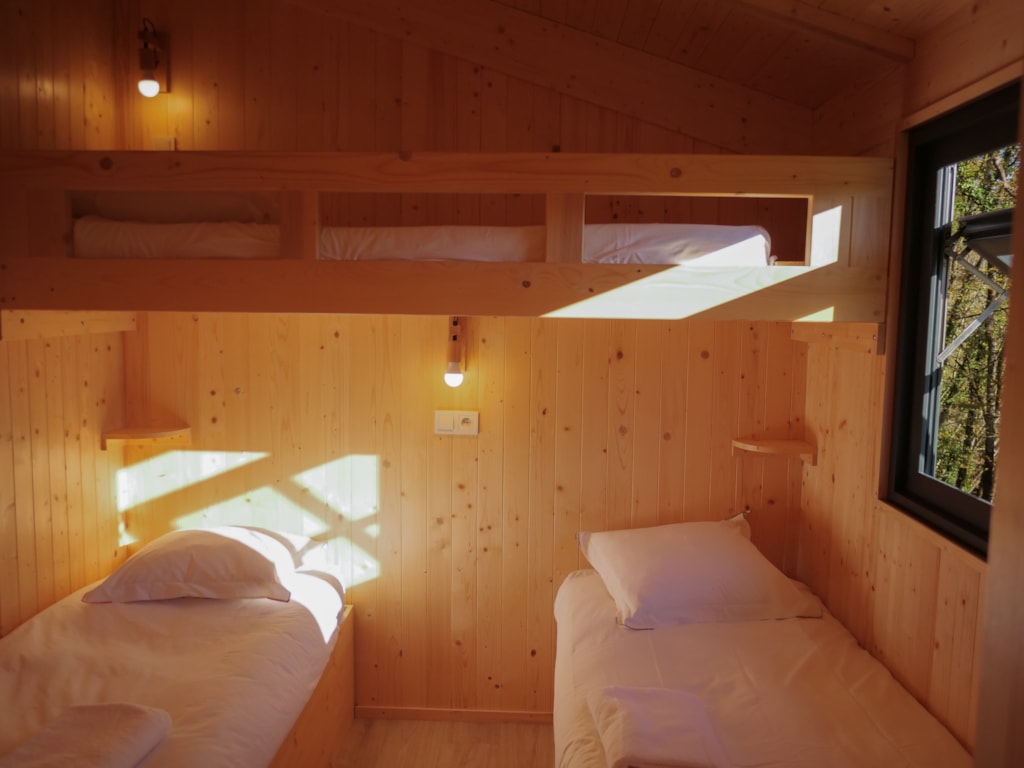 Es ist innen geräumig und verfügt über ein voll ausgestattetes Wohnzimmer/Küche, private Badezimmer, ein Schlafzimmer für Erwachsene mit einem Doppelbett und ein Kinderzimmer mit zwei Betten und einem Hängebett. Diese Hütte verfügt auch über eine große Terrasse, auf der Sie wunderbar entspannen oder Ihre Mahlzeiten einnehmen können.
