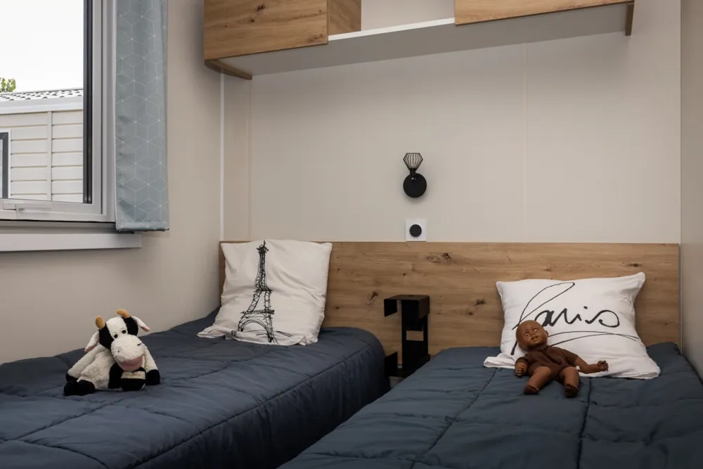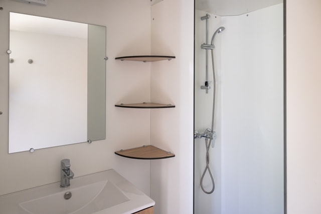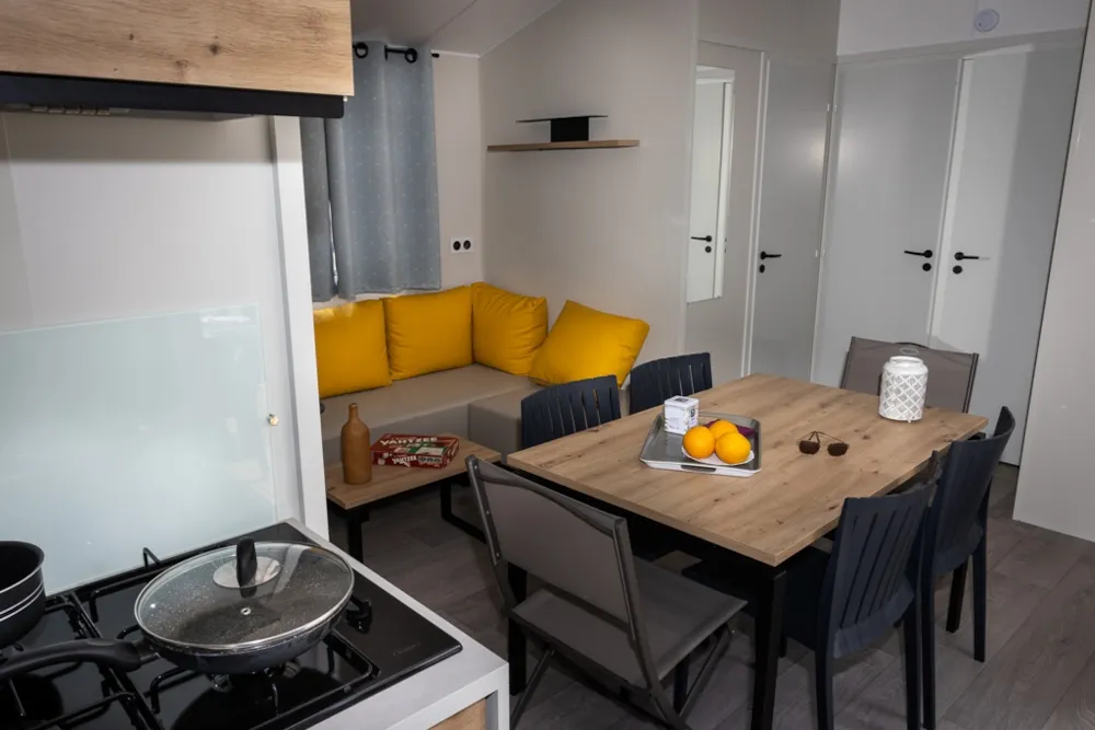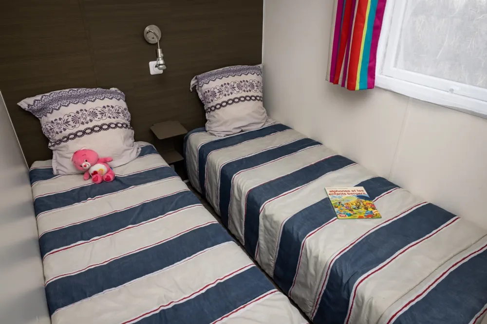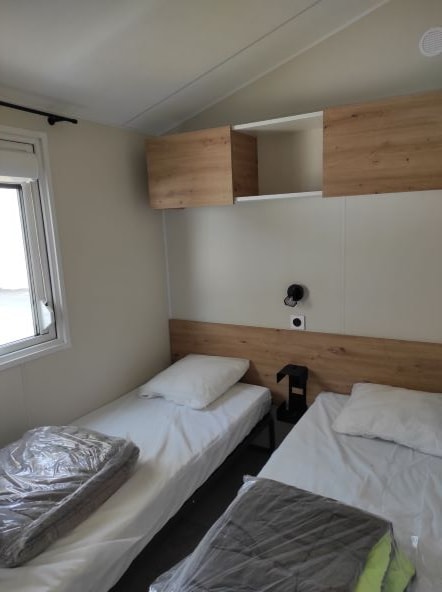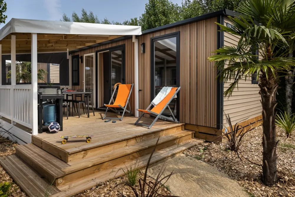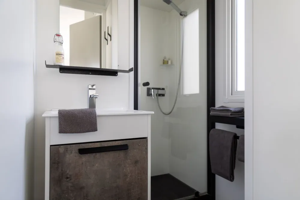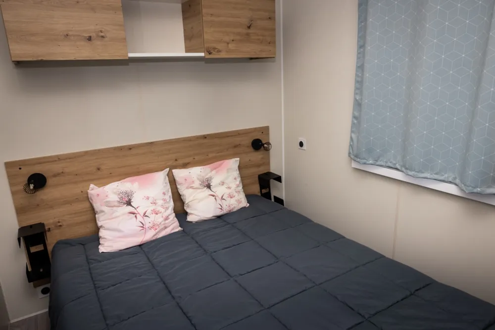 Mobile home PMR specifically designed and adapted for people with reduced mobility and their families. It is equipped with an access ramp and a large covered terrace of 15m2. Its very spacious living room allows for a fluid circulation. Equipped kitchen and living area with sofa bed. Bathroom with an extra large shower with 1m wide sliding doors. 2 bedrooms with storage space