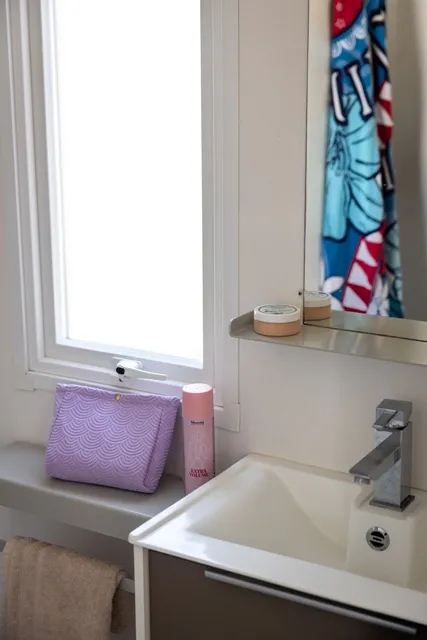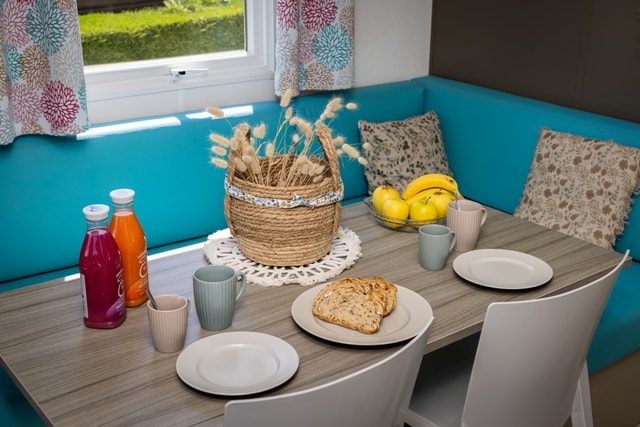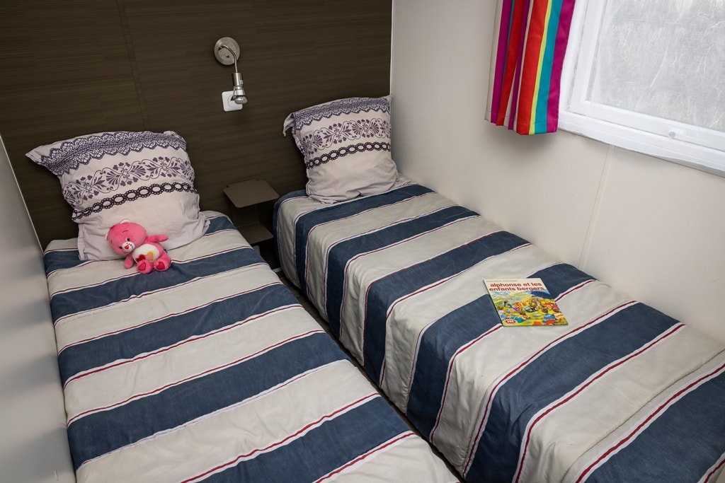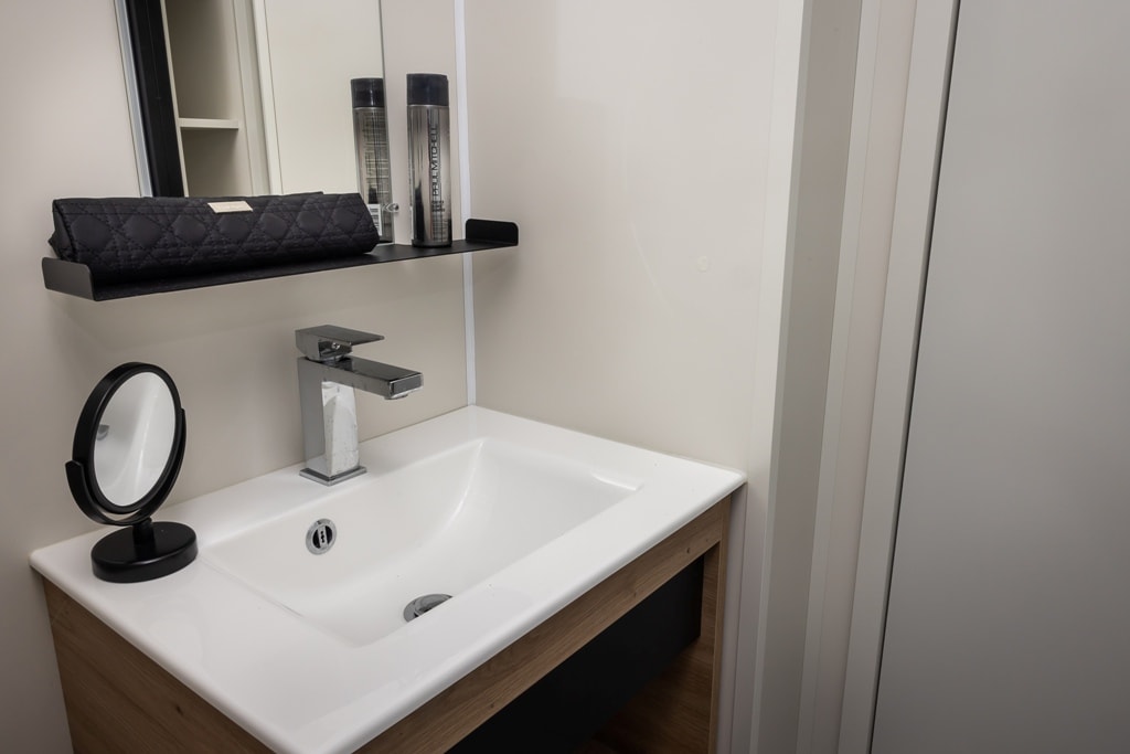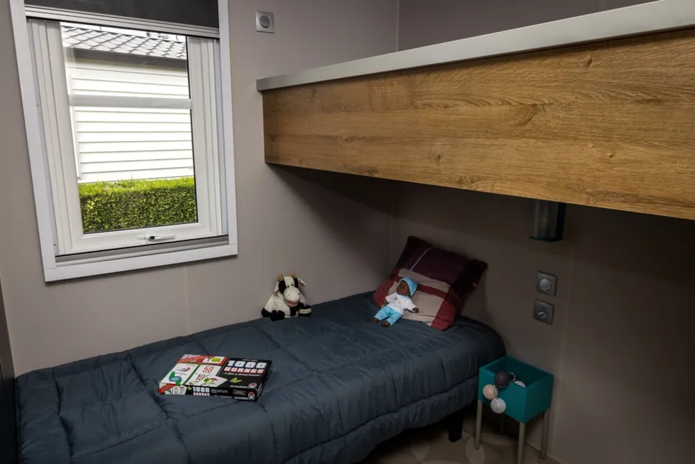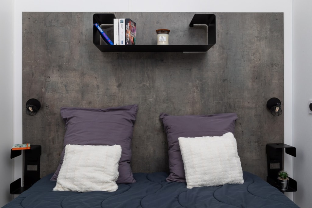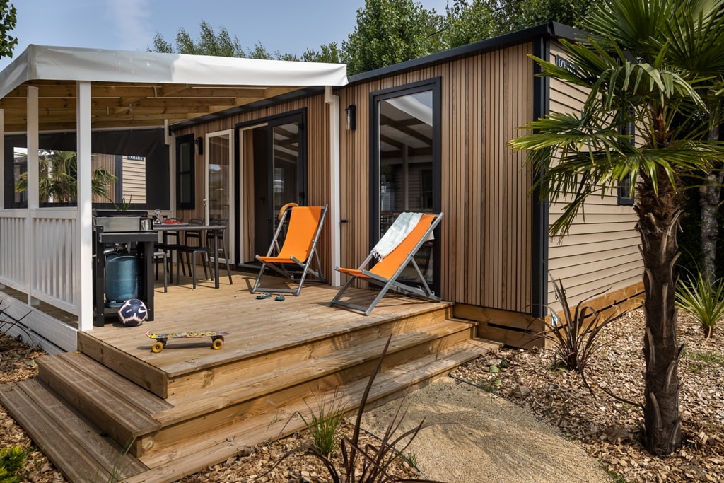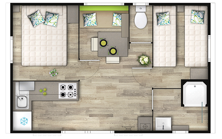 Mobile home PMR specifically designed and adapted for people with reduced mobility and their families. It is equipped with an access ramp and a large covered terrace of 15m2. Its very spacious living room allows for a fluid circulation. Equipped kitchen and living area with sofa bed. Bathroom with an extra large shower with 1m wide sliding doors. 2 bedrooms with storage space
