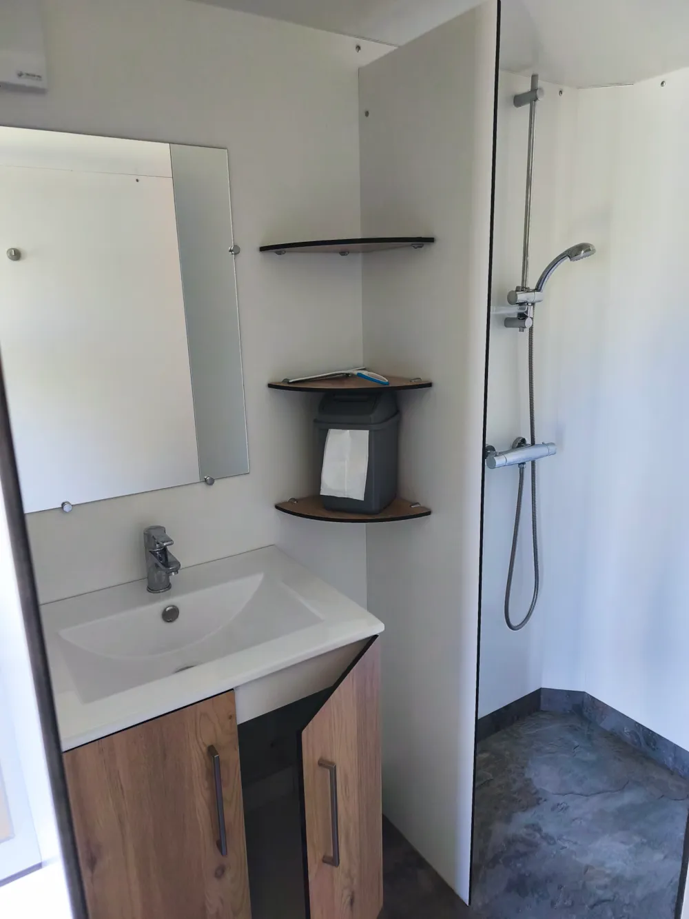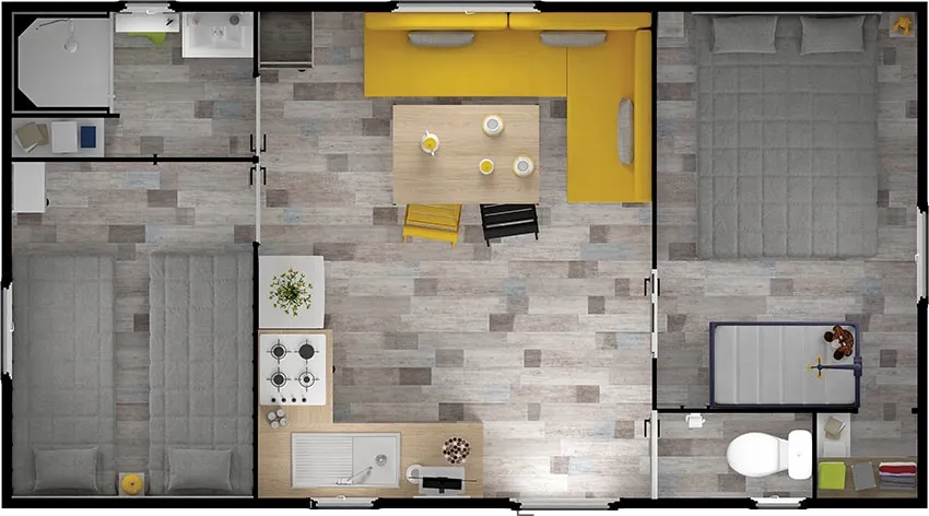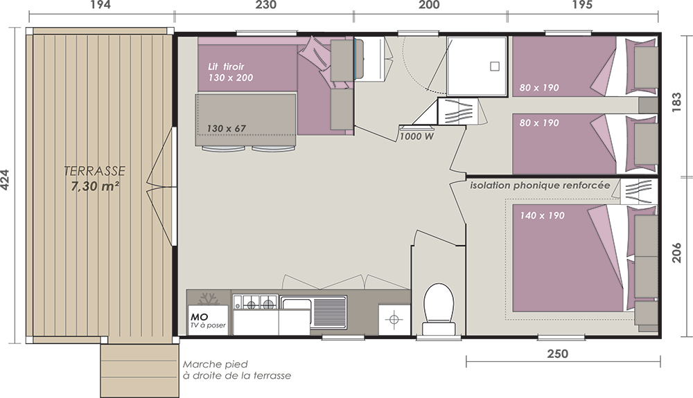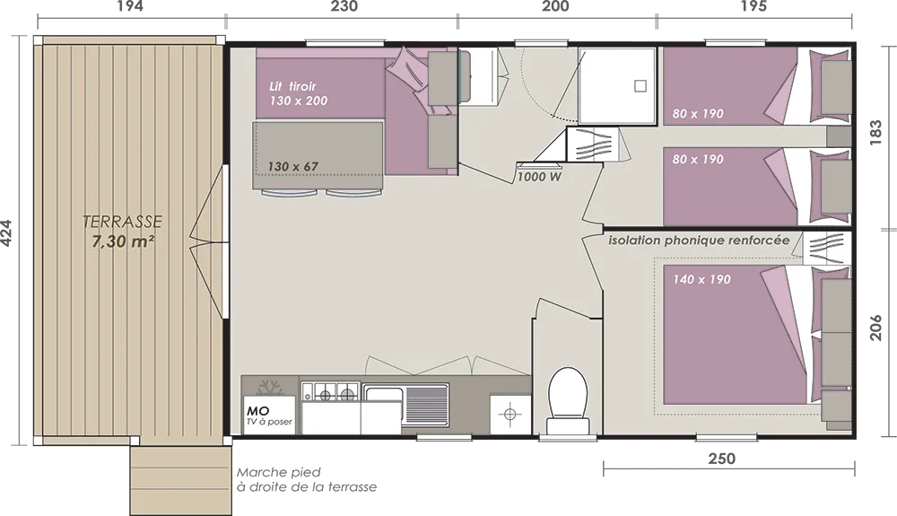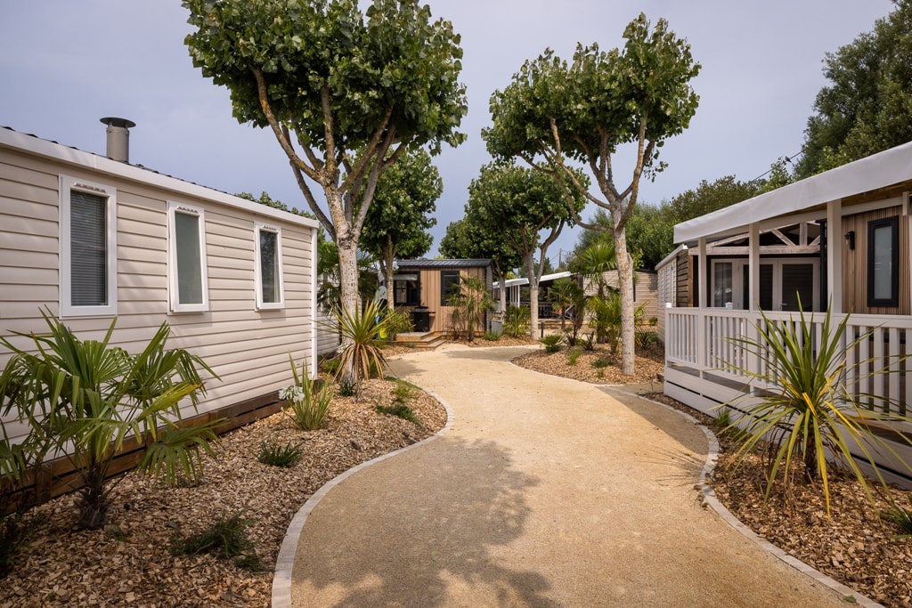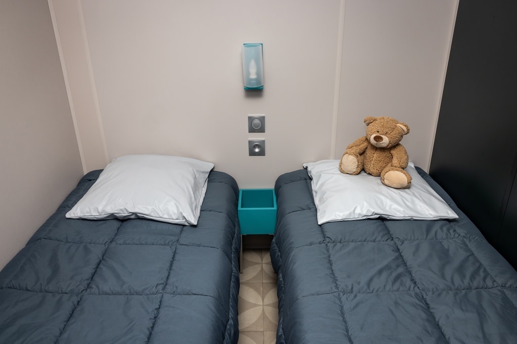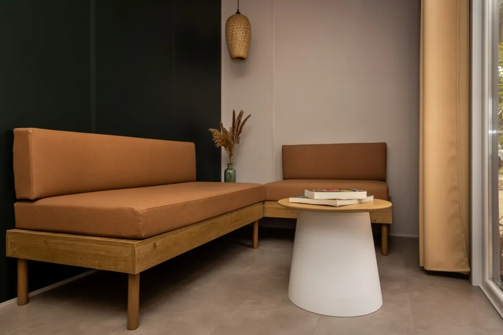 Mobile home PMR specifically designed and adapted for people with reduced mobility and their families. It is equipped with an access ramp and a large covered terrace of 15m2. Its very spacious living room allows for a fluid circulation. Equipped kitchen and living area with sofa bed. Bathroom with an extra large shower with 1m wide sliding doors. 2 bedrooms with storage space