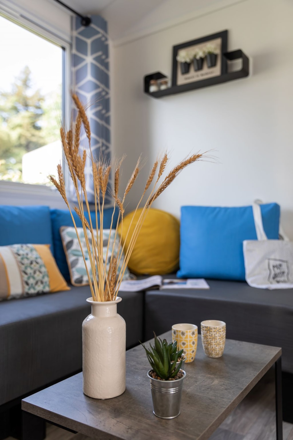 Mobilheim 9. März Zimmer. Sehr gut ausgestattet und ideal für 6 Personen, ist das Wohnzimmer geräumig, schön und hat viel Stauraum mit Küche, bad, separates WC. Mit einem schönen Hälfte überdachte Holzterrasse .