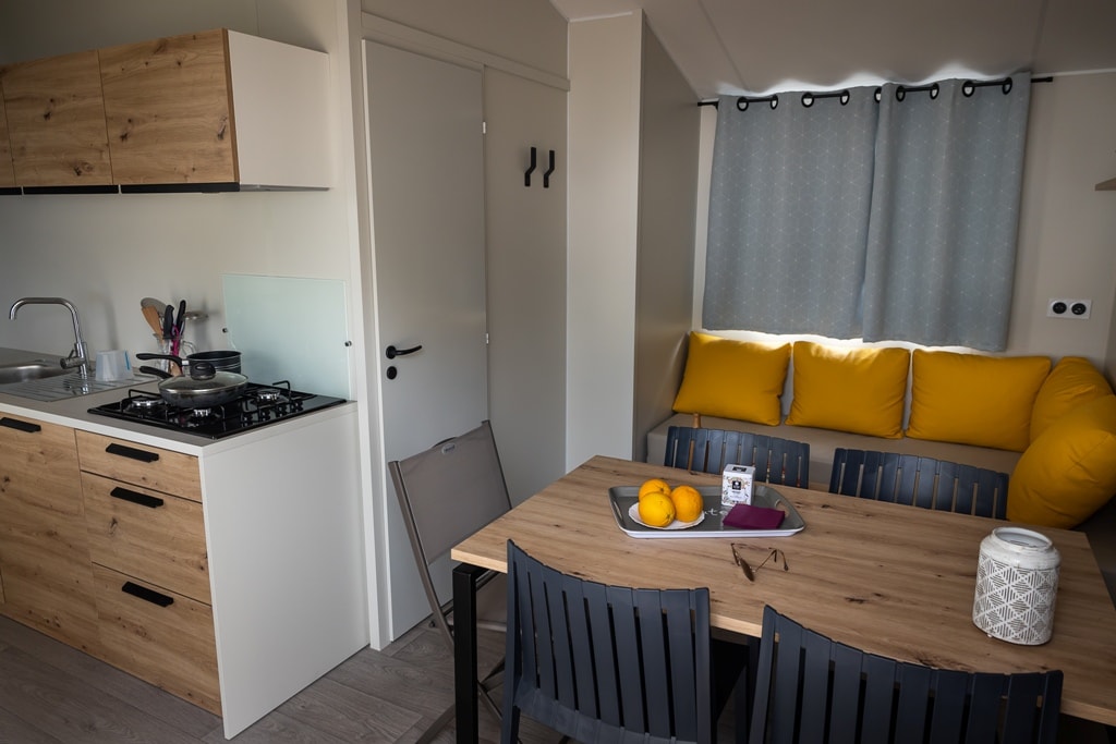 Mobilheim mit gemütlichem Raum, Wohnzimmer mit Bettbank und ausgestatteter Küche. 2 Schlafzimmer mit ein 140 cm Bett und zwei 80 cm Betten, Badezimmer und WC. Mit einer halbüberdachten Holzterrasse, Gartenmöbeln und Liegestühlen. Ideal für keine familie ! Höhe der Buchungsgebühren: 22