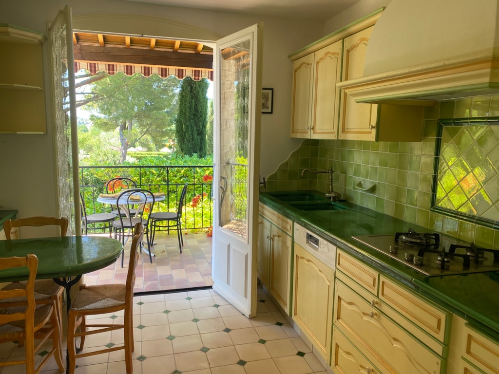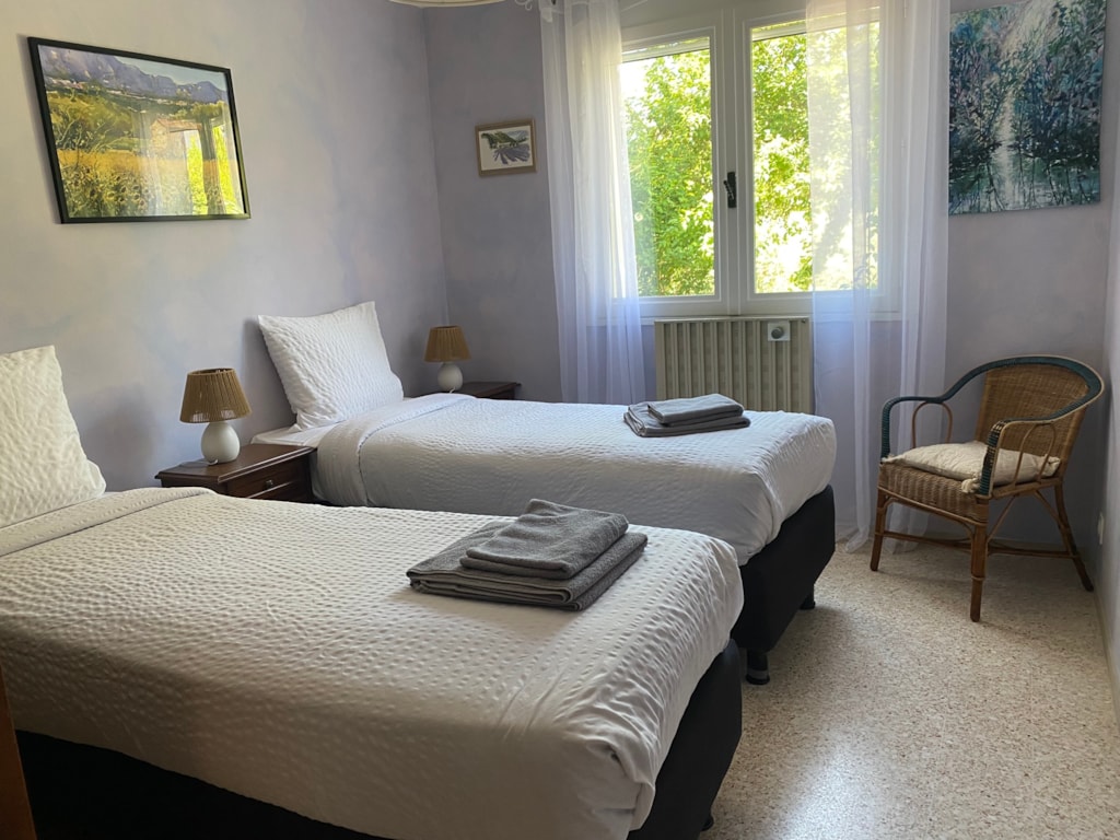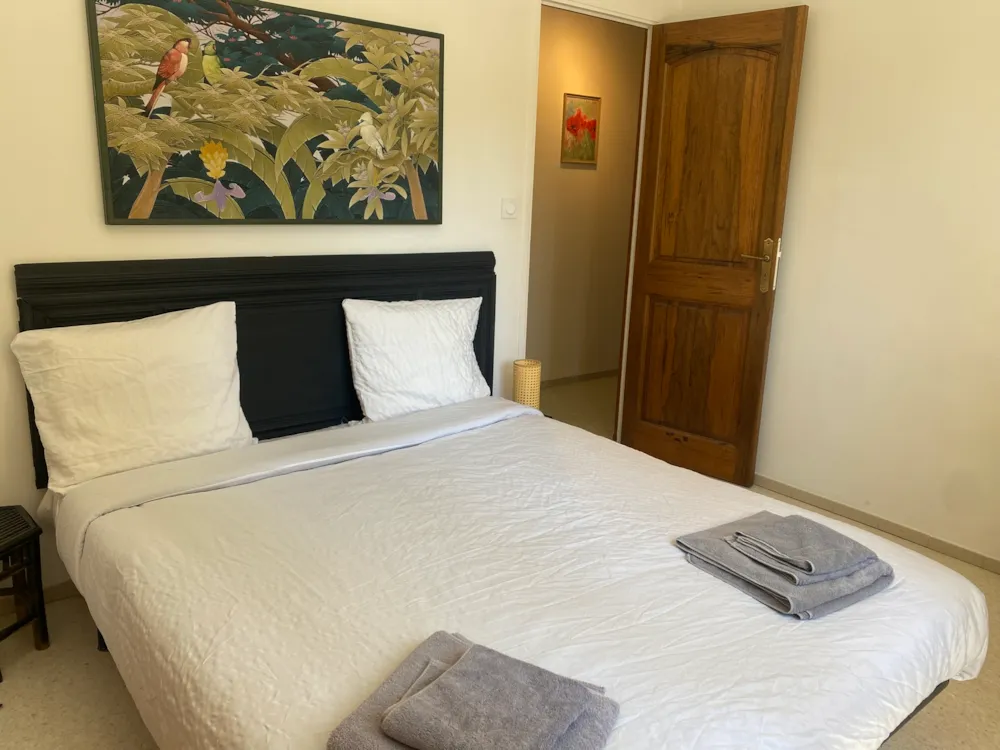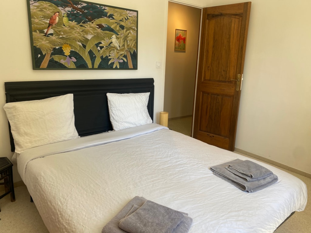 1 Zimmer mit Doppelbett (140 x 190). 1 Zimmer mit 2 Einzelbetten (70 x 190). Wohnzimmer mit Essecke, Kochnische ausgestattet mit Kühlschrank/Gefrierschrank und Mikrowellenherd. Bad (Dusche, Waschbecken), separates WC. TV und Klimagerät. Überdachte Holzterrasse mit Gartenmöbeln und 2 Sonnenliegen.