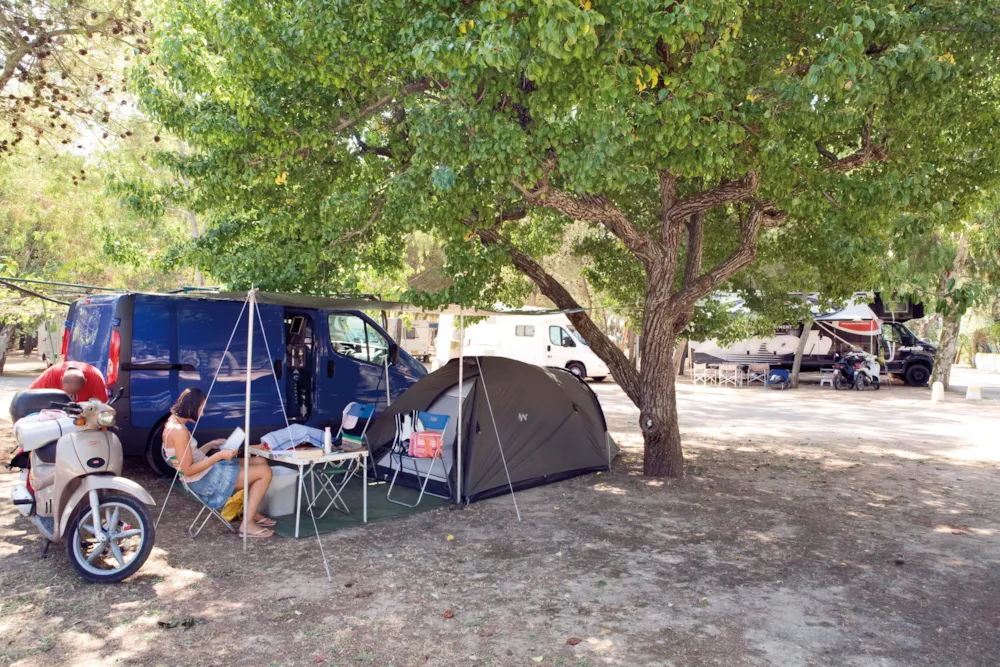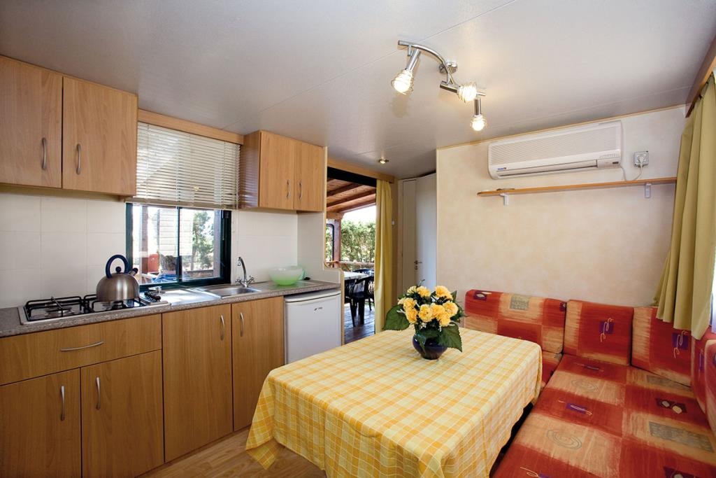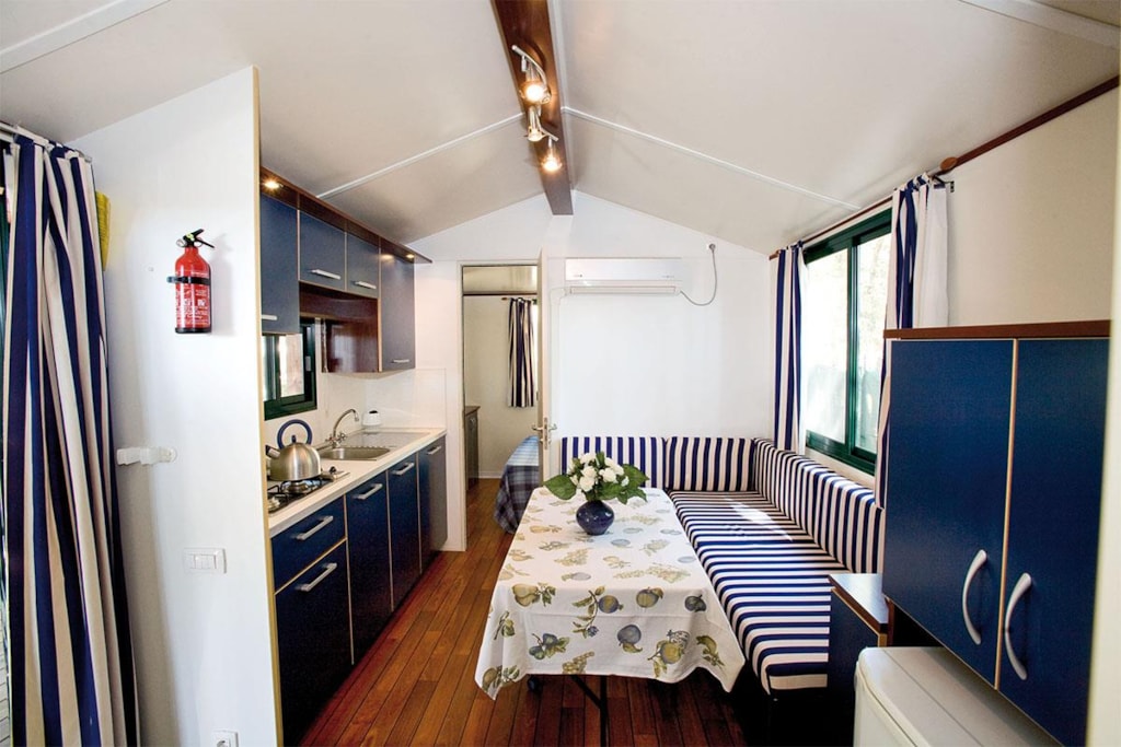 Die Mobilheime für 2 Personen bestehen aus einem Doppel- oder Zweibettzimmer, einem Badezimmer und einer Holzveranda im Freien mit einer Küchenzeile.