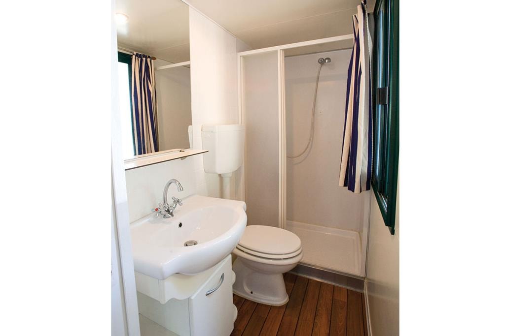 Die Mobilheime für 2 Personen bestehen aus einem Schlafzimmer mit Doppelbett oder zwei Einzelbetten, einem Badezimmer und einer Holzveranda im Freien mit einer Küchenzeile.