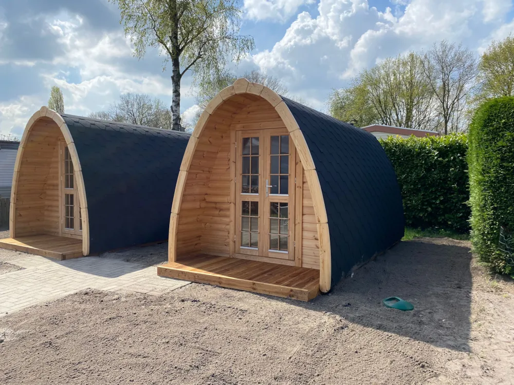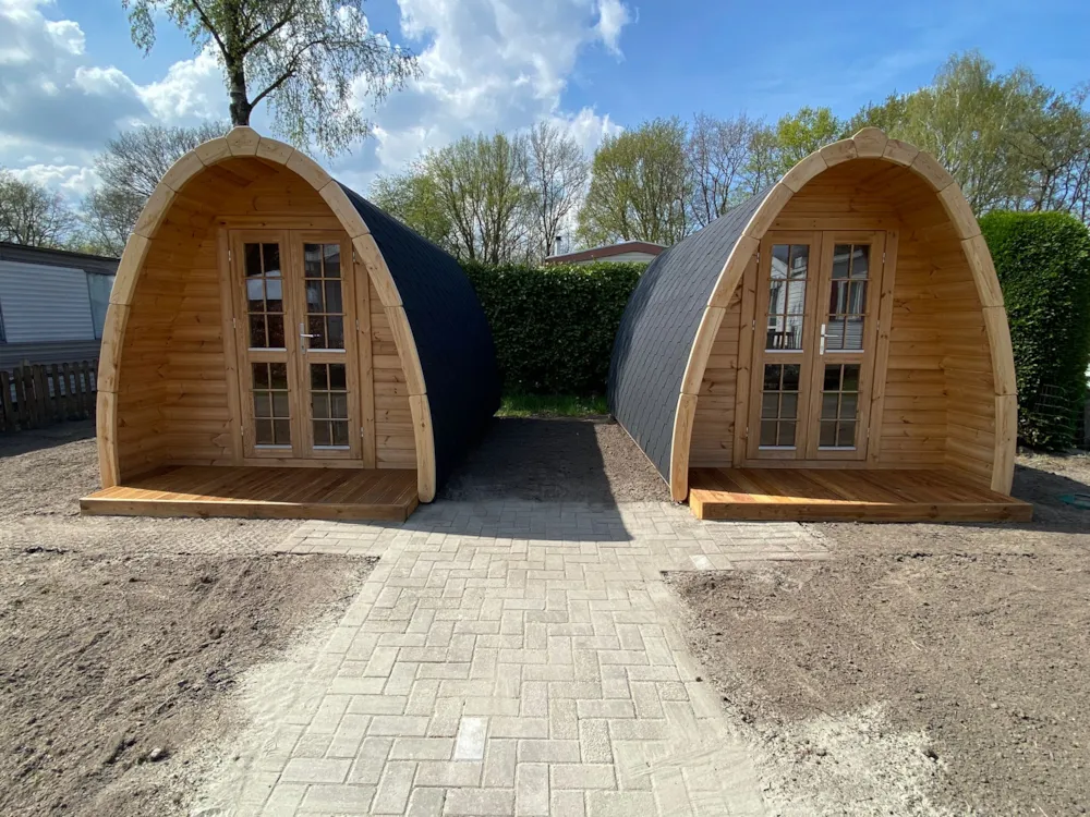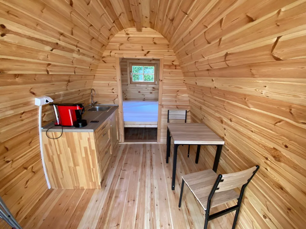 Trekkerspod met slaapplaats voor 2 personen, wastafel, inrichting met bestek en servies aanwezig, zitje en koffiezetappartaat. Sanitair in de nabijheid