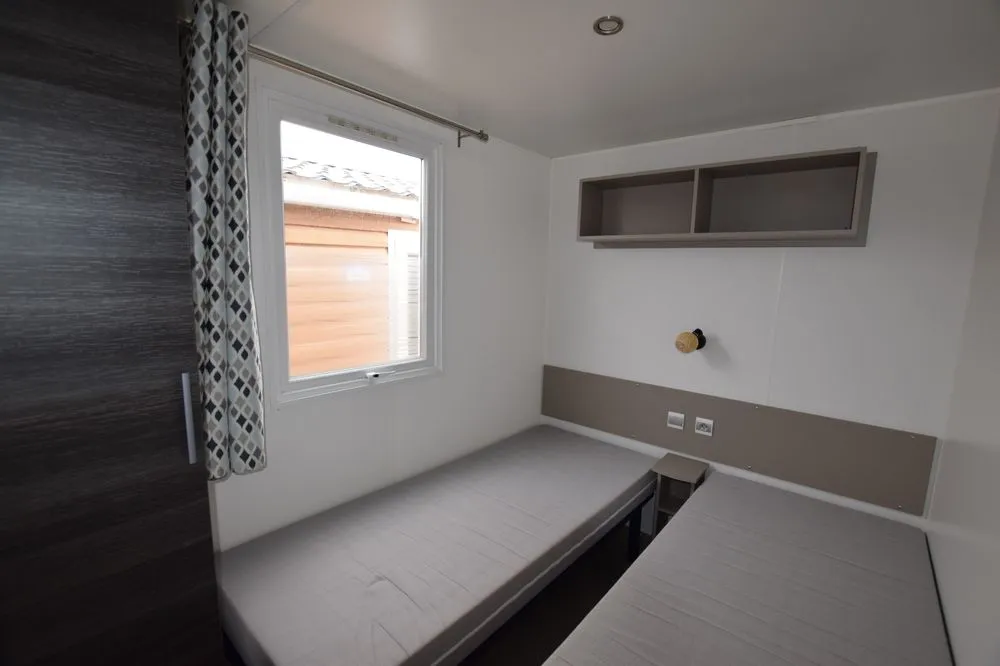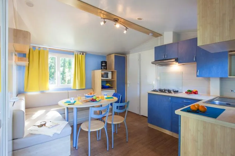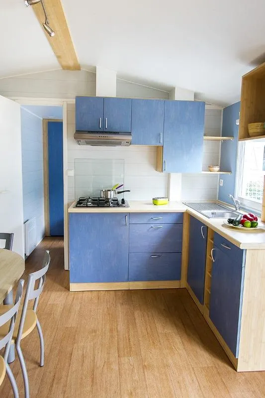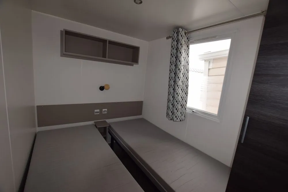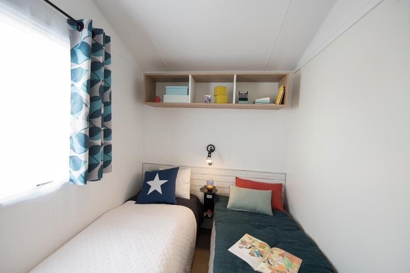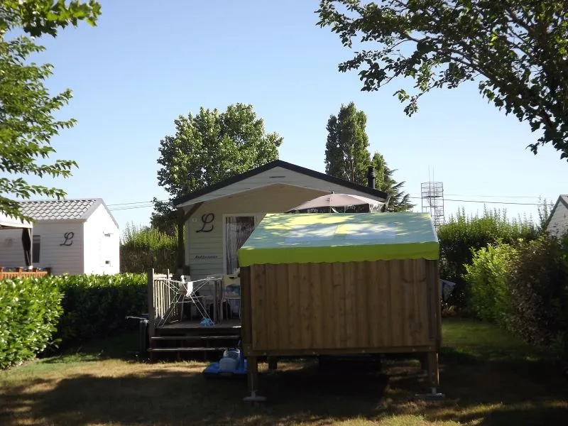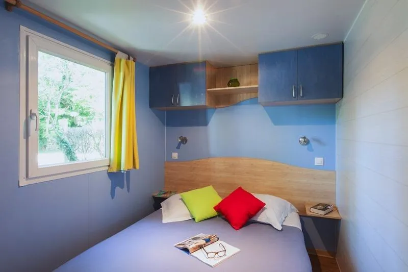1 modèle KALEDA 872 35m² - 4 PERS. : 1 chambre avec un lit double + 1 chambre de 2 lits simple, coin cuisine, séjour, 1 salle d'eau et 1 WC séparé. Il faudra penser à apporter les produits d'entretien, le papier toilette, le linge de cuisine, le linge de lit (draps + taies oreillers). Pour tous nos campeurs, les accès à la piscine, au parc de jeux, au parcours aquatique, au lac de baignade et à l'étang de pêche sont gratuits. Le camping et le Parc de Loisirs se trouvent l'un en face de l'autre mais sont séparés par une petite route communale très peu fréquentée.