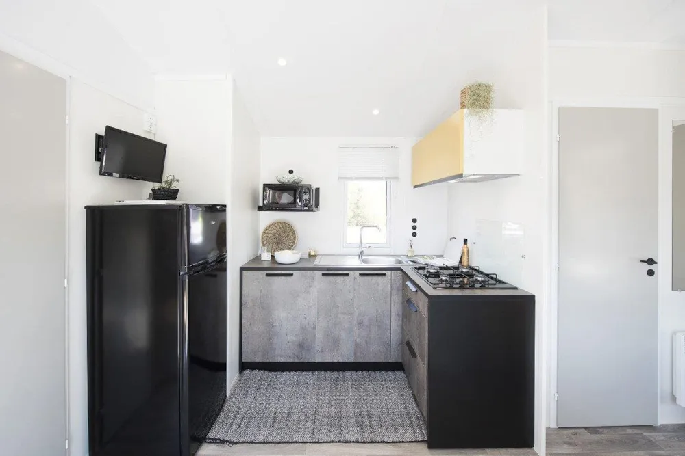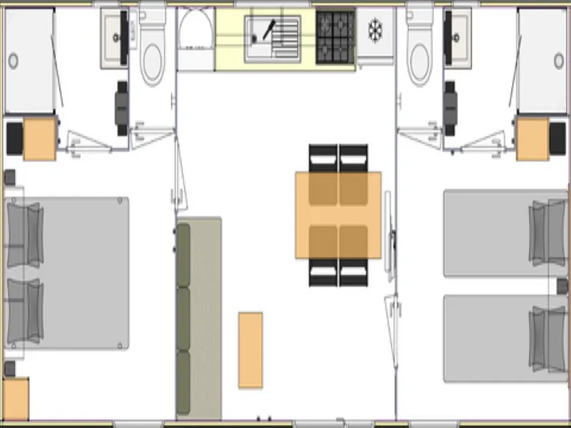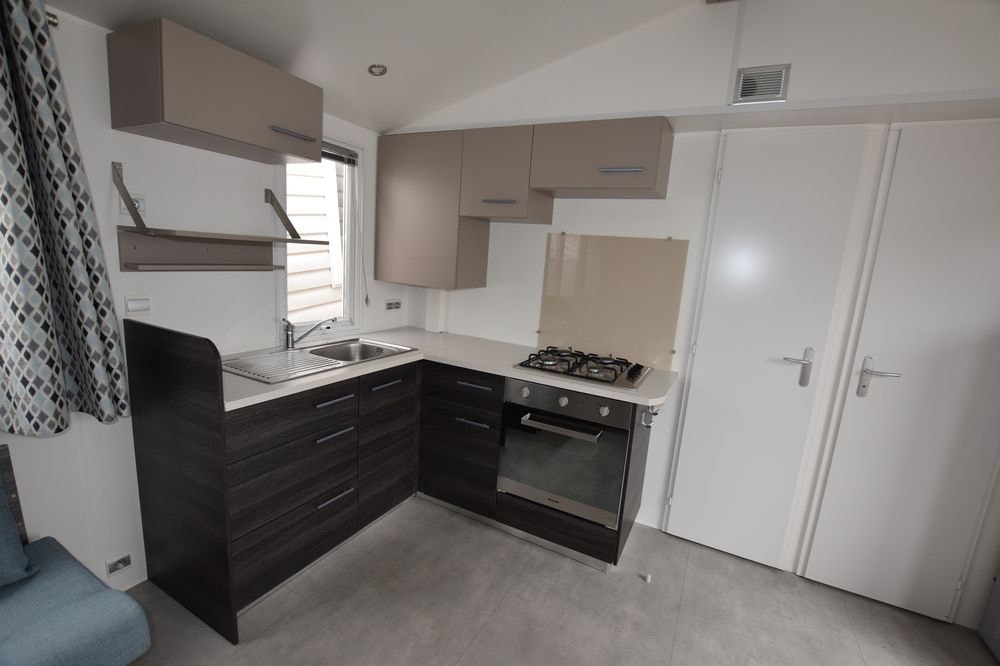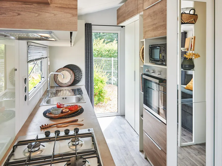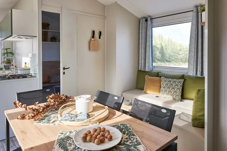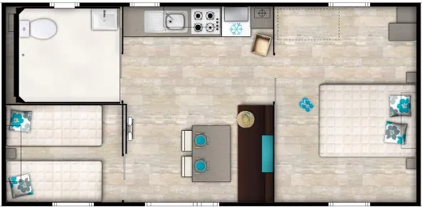 1 modèle KALEDA 872 35m² - 4 PERS. : 1 chambre avec un lit double + 1 chambre de 2 lits simple, coin cuisine, séjour, 1 salle d'eau et 1 WC séparé. Il faudra penser à apporter les produits d'entretien, le papier toilette, le linge de cuisine, le linge de lit (draps + taies oreillers). Pour tous nos campeurs, les accès à la piscine, au parc de jeux, au parcours aquatique, au lac de baignade et à l'étang de pêche sont gratuits. Le camping et le Parc de Loisirs se trouvent l'un en face de l'autre mais sont séparés par une petite route communale très peu fréquentée.