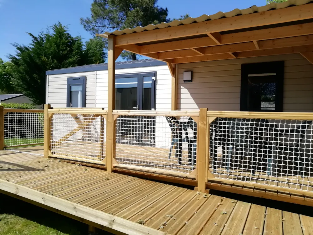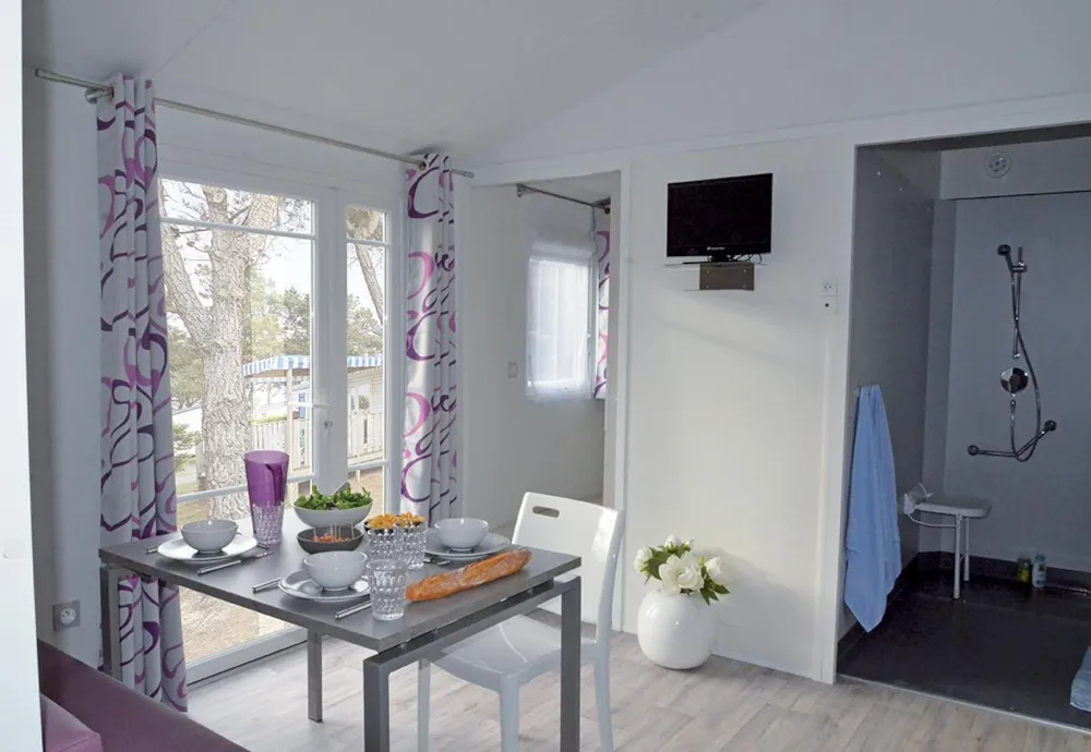 1 modèle IBIZA PMR 31m² - 4 PERS. : 1 chambre avec un lit double + 1 chambre de 2 lits simple, coin cuisine, séjour, 1 salle d'eau avec WC adaptés aux personnes à mobilité réduite. Il faudra penser à apporter les produits d'entretien, le papier toilette, le linge de cuisine, le linge de lit (draps + taies oreillers). Pour tous nos campeurs, les accès à la piscine, au parc de jeux, au parcours aquatique, au lac de baignade et à l'étang de pêche sont gratuits. Le camping et le Parc de Loisirs se trouvent l'un en face de l'autre mais sont séparés par une petite route communale très peu fréquentée.