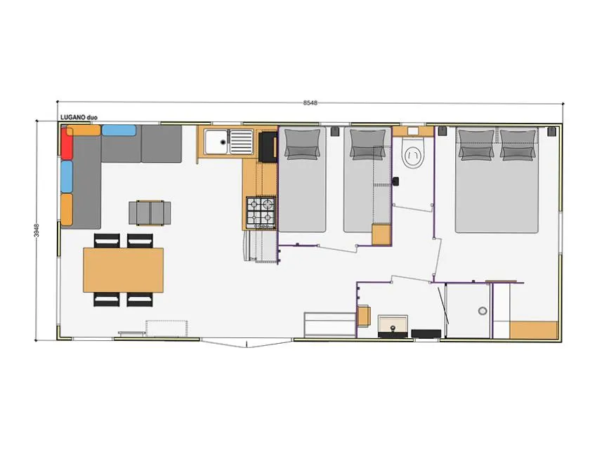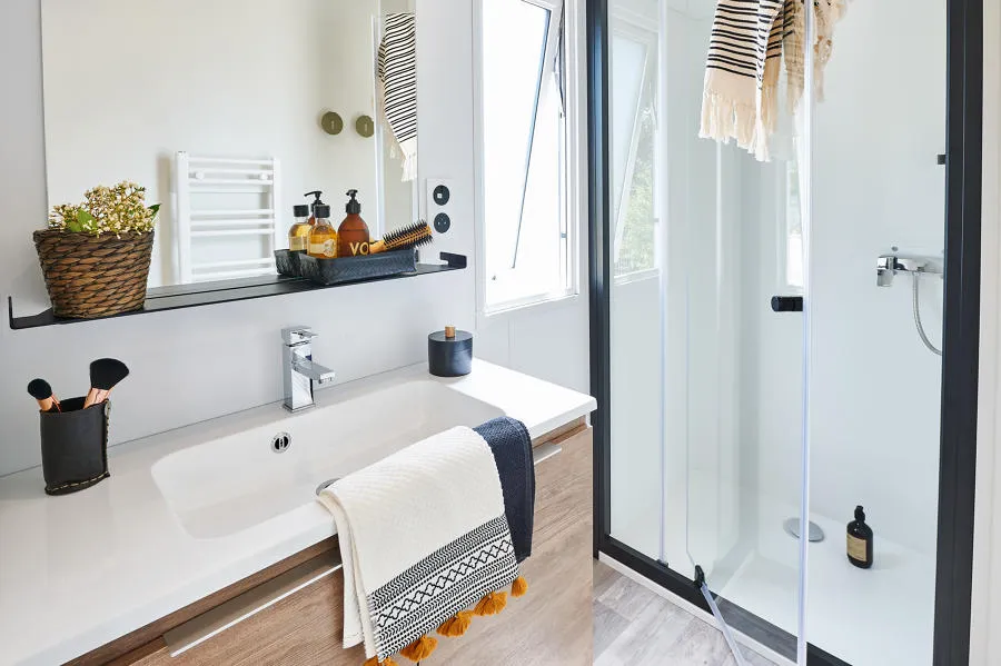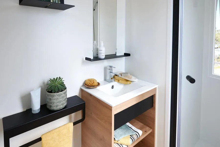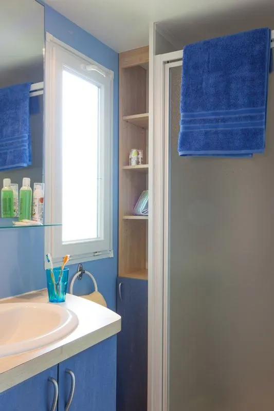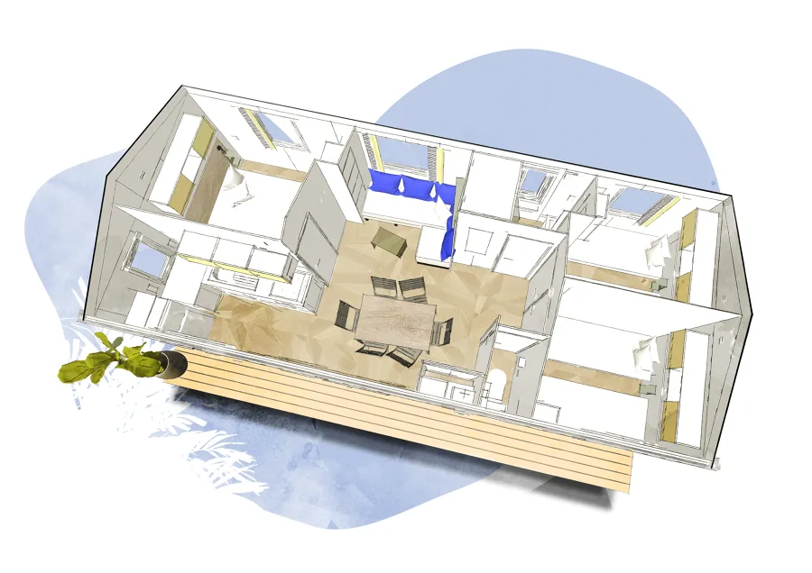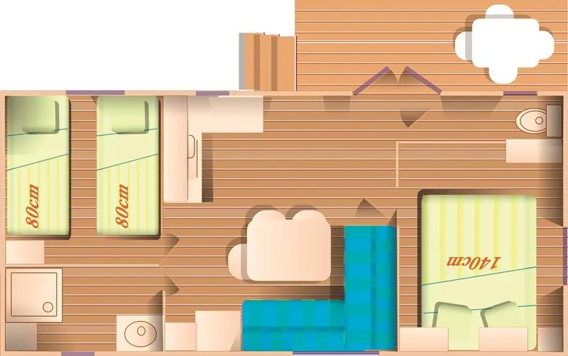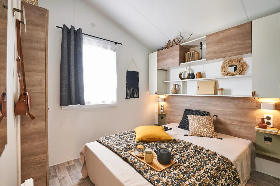 1 modèle BAHIA 873 35m² - 6PERS. : 1 chambre avec un lit double + 2 chambres de 2 lits simple, coin cuisine, séjour, 1 salle d'eau et 1 WC séparé. Il faudra penser à apporter les produits d'entretien, le papier toilette, le linge de cuisine, le linge de lit (draps + taies oreillers). Pour tous nos campeurs, les accès à la piscine, au parc de jeux, au parcours aquatique, au lac de baignade et à l'étang de pêche sont gratuits. Le camping et le Parc de Loisirs se trouvent l'un en face de l'autre mais sont séparés par une petite route communale très peu fréquentée.
