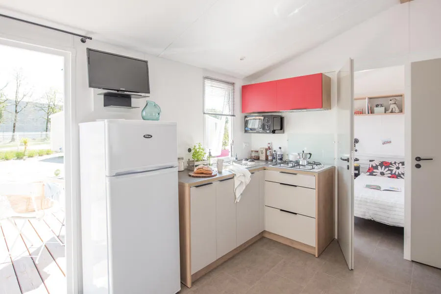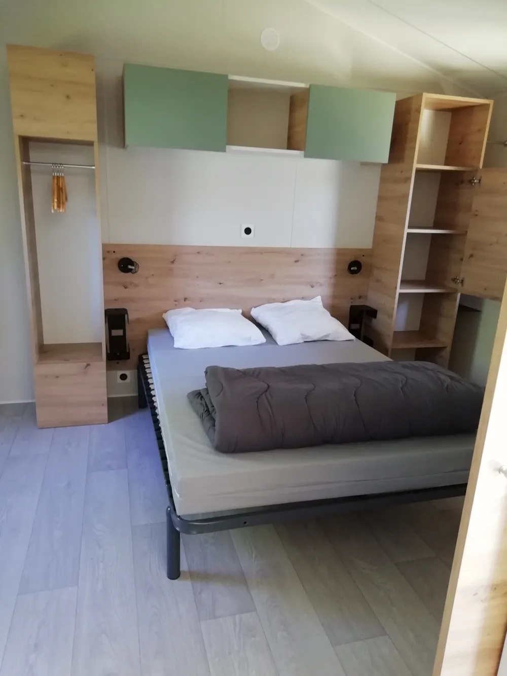 1 modèle VENEZIA 27m² - 4/5 PERS. : 1 chambre avec un lit double + 1 chambre de 3 lits simple, coin cuisine, séjour, 1 salle d'eau et 1 WC séparé. Il faudra penser à apporter les produits d'entretien, le papier toilette, le linge de cuisine, le linge de lit (draps + taies oreillers). Pour tous nos campeurs, les accès à la piscine, au parc de jeux, au parcours aquatique, au lac de baignade et à l'étang de pêche sont gratuits. Le camping et le Parc de Loisirs se trouvent l'un en face de l'autre mais sont séparés par une petite route communale très peu fréquentée.
