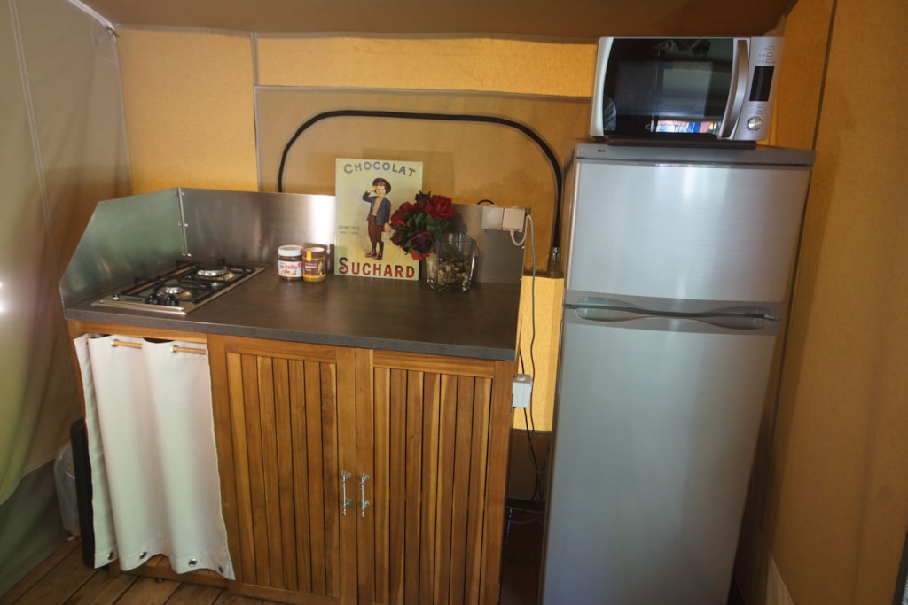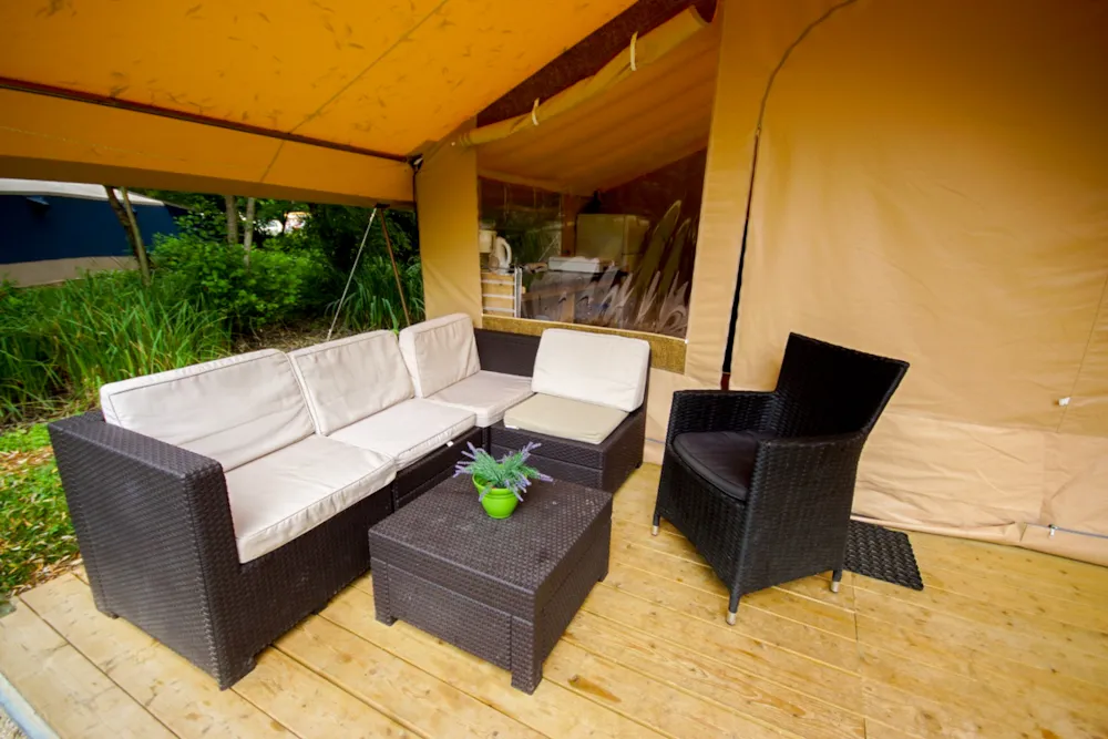 Modernes Lodge-Zelt mit fünf Schlafplätzen und Küche.