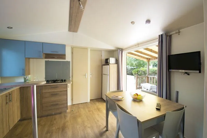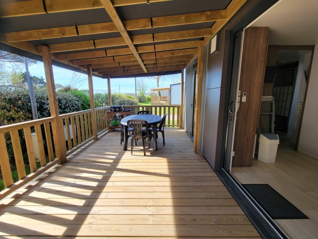 MH Quatro - 39m² - 8 persons 4 bedrooms Beds: 2 beds (140x190) + 2 beds (80x190) + trundle bed Equipped kitchenette: hob, fridge, microwave, coffee machine, dishwasher ... bathroom with shower, washbasin - WC TV Semi-covered wooden terrace
