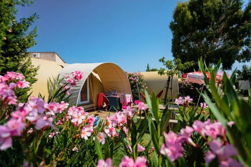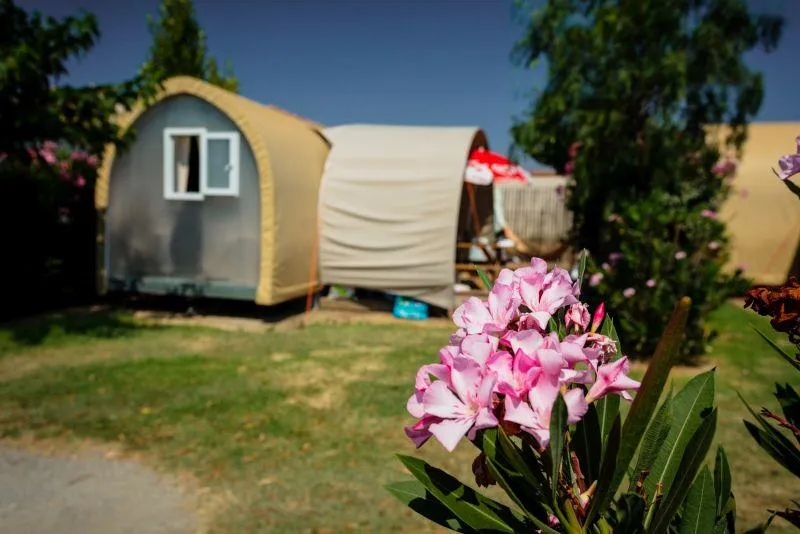 Coco Lodge (unusual accommodation) - 16m² - 4 pers. 2 bedrooms Beds: 1 bed (140x190) + 2 beds (80x190) Equipped kitchenette: hob, fridge, microwave, coffee machine Semi-covered terrace
