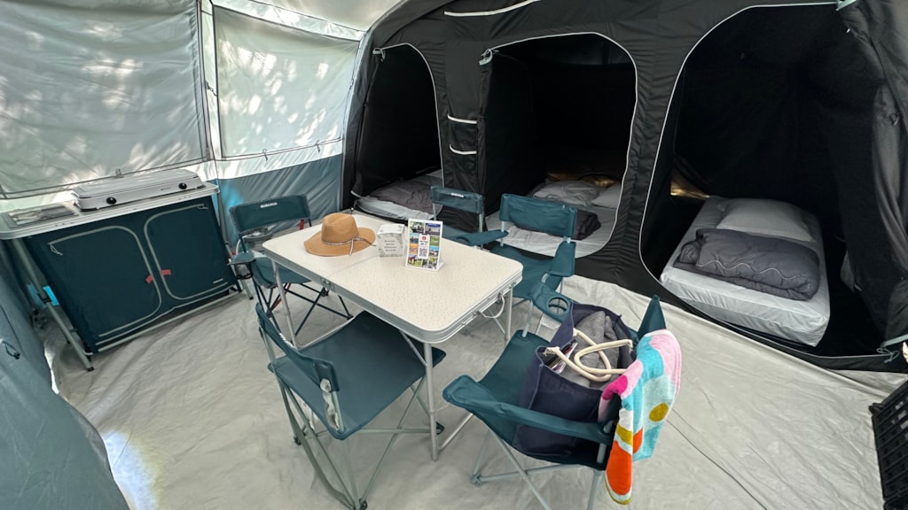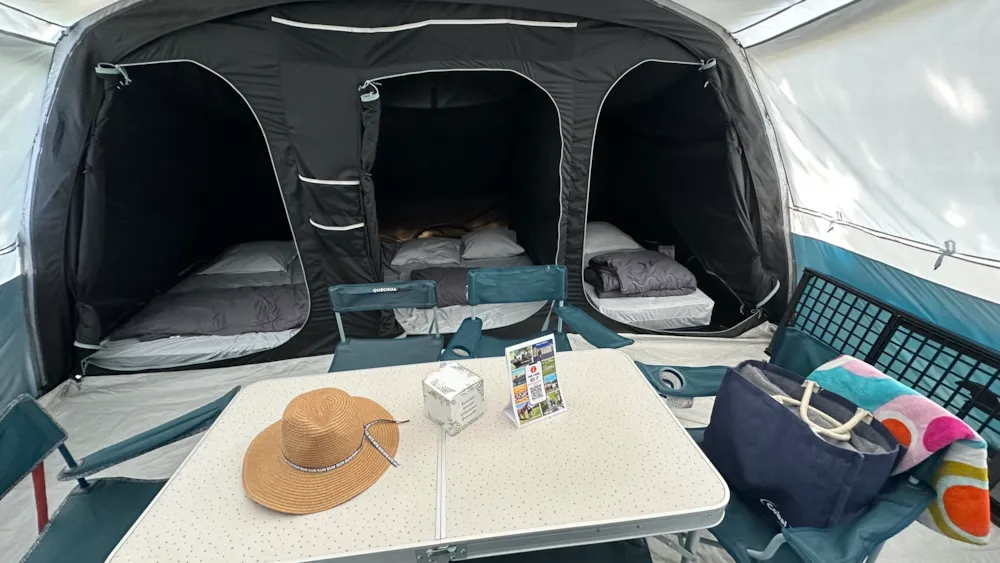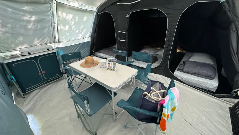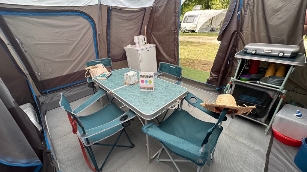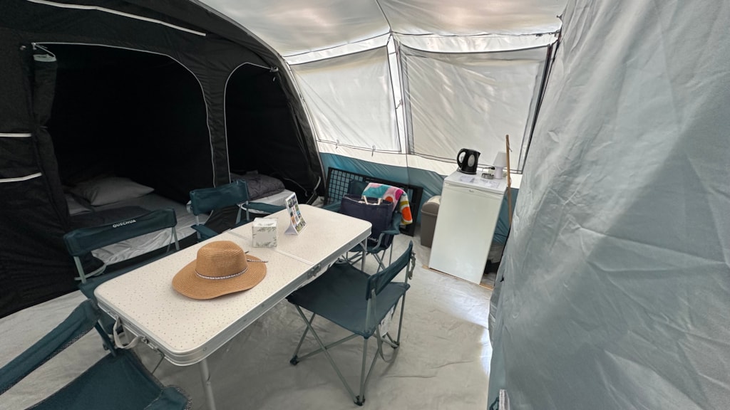 Genießen Sie einen komfortablen Aufenthalt inmitten der Natur: Das Zelt ist aufgebaut, ausgestattet und bereit, Sie für einen entspannten Urlaub willkommen zu heißen.