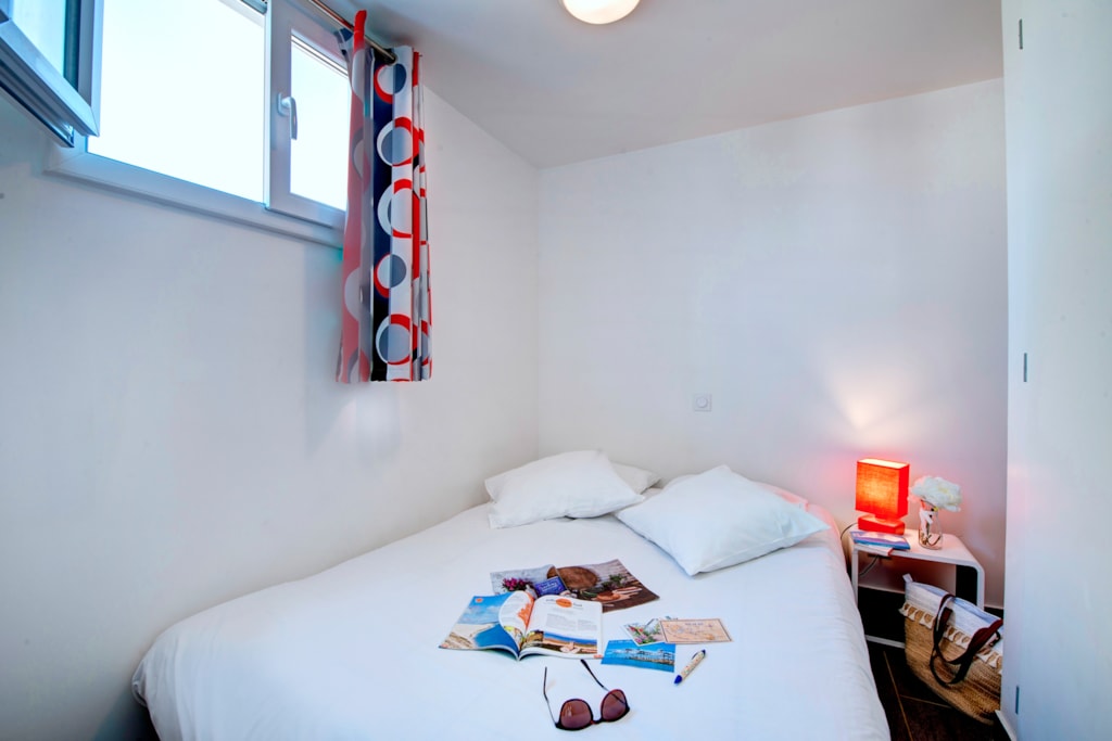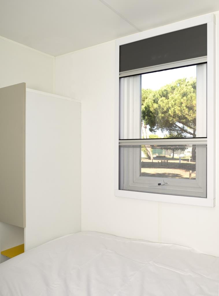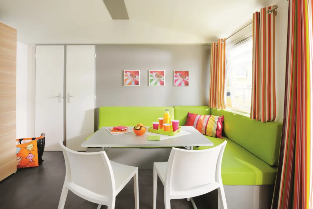 Erstklassige Annehmlichkeiten in unserem Mobilheim Homeflower Premium für 4 Personen für einen idealen Familien- oder Freundeurlaub. Unsere 2 Schlafzimmer (1 Doppelbett 160x200cm, 2 Einzelbetten 80x190cm) sind mit Verdunklungsvorhängen für optimalen Schlaf ausgestattet. Diese Unterkunft bietet auch Moskitonetze, Geschirrspüler, eine große halbüberdachte private Terrasse von über 20m2 und ein Wohnzimmer mit TV. Bettwäsche und Handtücher sind im Preis inbegriffen, damit Sie leicht reisen können!