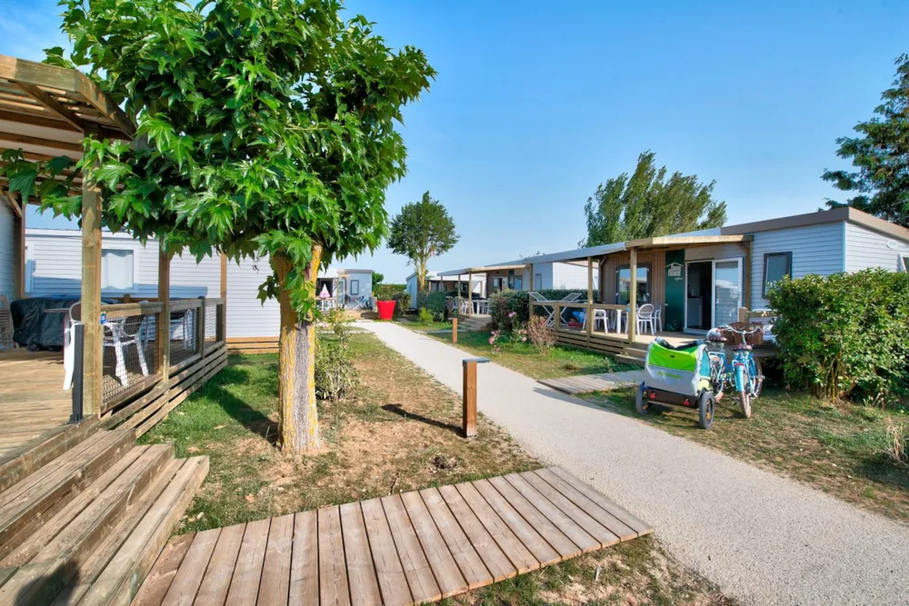 Entdecken Sie unser Premium-Mobilheim von 35m2 mit seinen erstklassigen Dienstleistungen für 6 Personen. Klimaanlage, Verdunkelungsrollos für einen ausgezeichneten Schlaf, Moskitonetze in den 3 Schlafzimmern (4 Einzelbetten 80 x 190 cm, 1 Doppelbett 160 x 200 cm) mit Bettwäsche und Handtüchern, Geschirrspüler, große private halbüberdachte Terrasse von mehr als 20m2, herrliche moderne Einrichtung und ihre aktuelle Dekoration, Wohnzimmer mit TV. Unsere Homeflower wird Ihnen einen unvergesslichen Campingurlaub mit der Familie oder mit Freunden ermöglichen, mit dem Komfort von zu Hause!