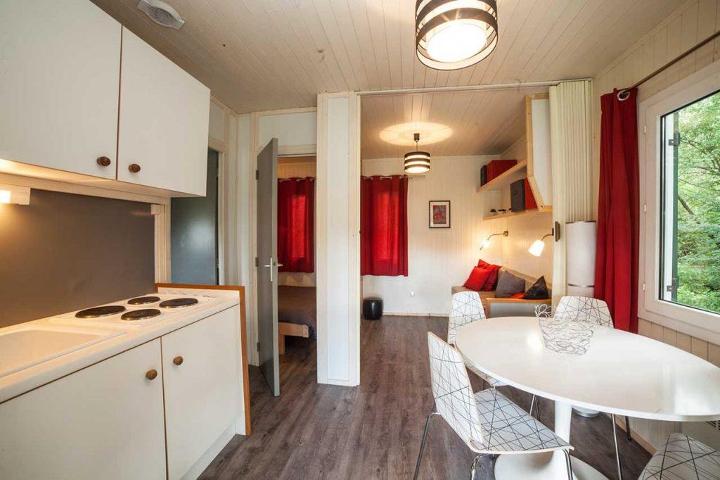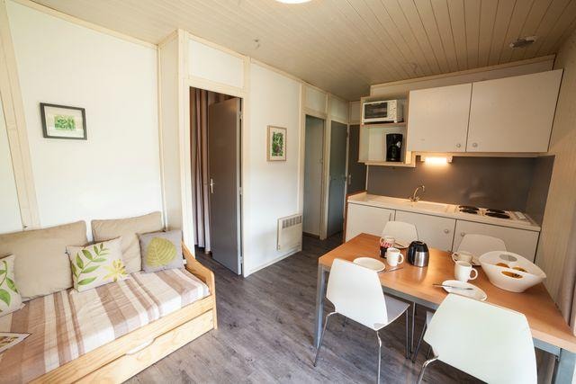 The MAEVA is a 100% wooden chalet fully equipped (air conditioning) for 6 people maximum. The 30 m² air-conditioned interior space is composed of : 1 living room with 1 sofa bed (2 single beds 80×200) / dining room, 1 equipped kitchen (fridge/freezer, 4 burner gas hob, microwave, coffee maker, gas kettle, toaster), 1 bathroom (1 XL shower, 1 washbasin), 1 separate toilet, 2 bedrooms (1 parents' bedroom with 1 double bed 160x190, 1 children's bedroom with 2 single beds 80x190). The 14 m² covered terrace is equipped with : 1 table/chairs, 1 gas plancha, 2 chilian chairs. The MAEVA cottages n°45, 46, 47, 48 are located on the edge of the wooded park in the shade and near the river.You can choose your number free of charge by indicating, in the comments of your reservation, your 3 numbers in order of preference (beforehand, check their availability with the Reception). The CANCELLATION insurance, mandatory to be covered, must be subscribed after your reservation (internet offer of your choice). It is not offered on our reservation site. Animals are accepted (except dangerous dogs of category 1 and 2, bull terrier, pit bull, staff, staffy).