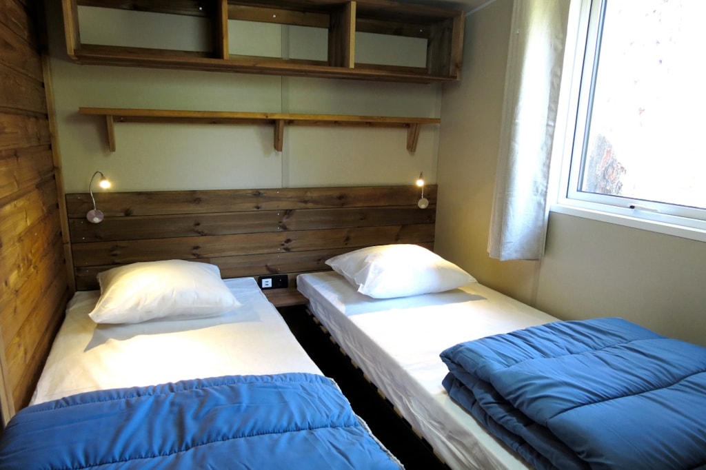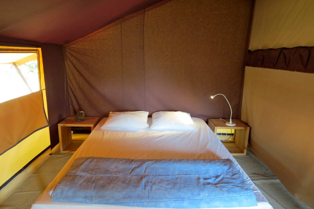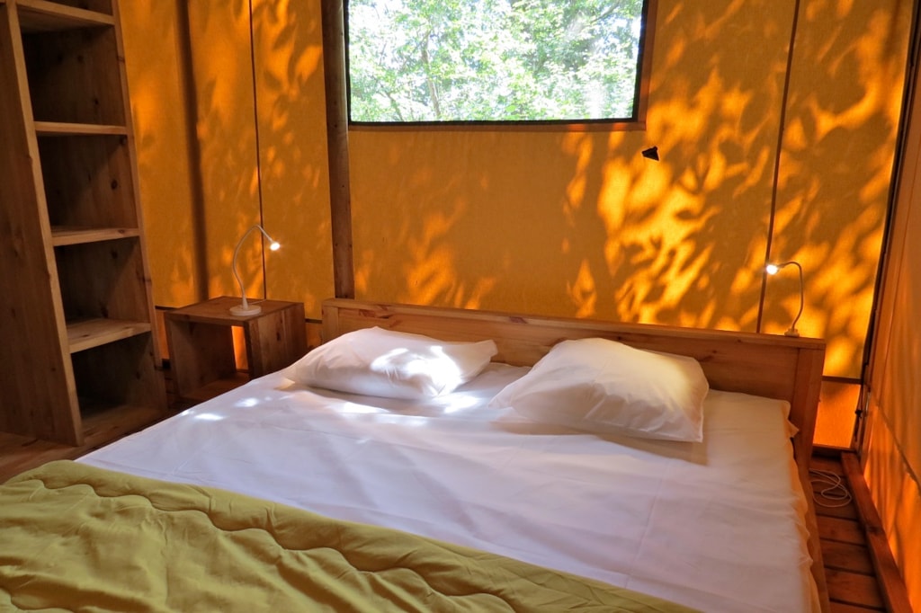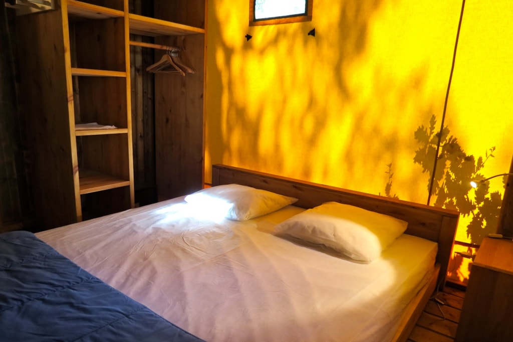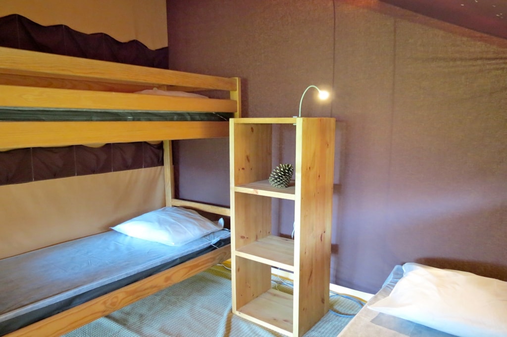 The COTTON is a furnished canvas lodge with a wooden floor for a maximum of 5 people. The interior space of 25 m² is composed of : 1 dining area, 1 equipped kitchen (fridge/freezer, gas stove with 2 burners, no sink but 1 water can 10L, coffee maker, gas kettle), 2 bedrooms (1 parents' bedroom with 1 double bed 140x190, 1 children's bedroom with 1 bunk bed 2 beds 80x190 and 1 single bed 80x190) The COTTON Lodge has NO SANITARY inside but is located near a collective sanitary. The 10 m² covered terrace is equipped with : 1 table/benches, 1 deckchair. The COTTON Lodges n° 69, 71, 72, 75 are located in the heart of the wooded park in the shade and in the first part of the campsite near the activities (water park, animations, games, mini-club, restaurant).You can choose your number free of charge by indicating, in the comments of your reservation, your 3 numbers in order of preference (beforehand, check their availability with the Reception). The CANCELLATION insurance, mandatory to be covered, must be subscribed after your reservation (internet offer of your choice). It is not offered on our reservation site. Animals are accepted (except dangerous dogs of category 1 and 2, bull terrier, pit bull, staff, staffy).