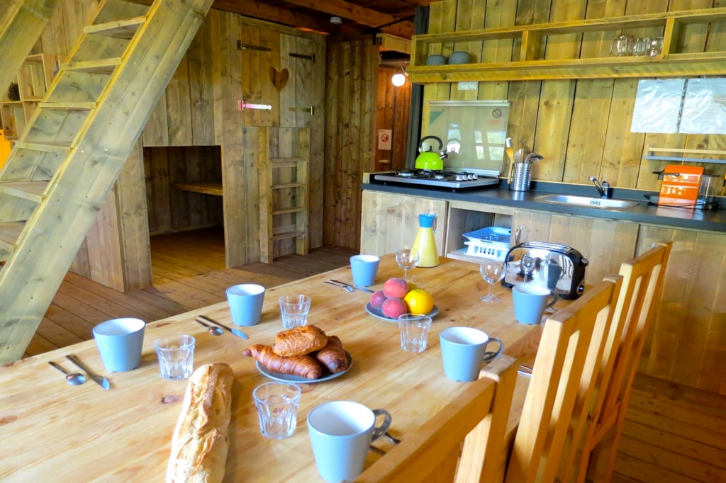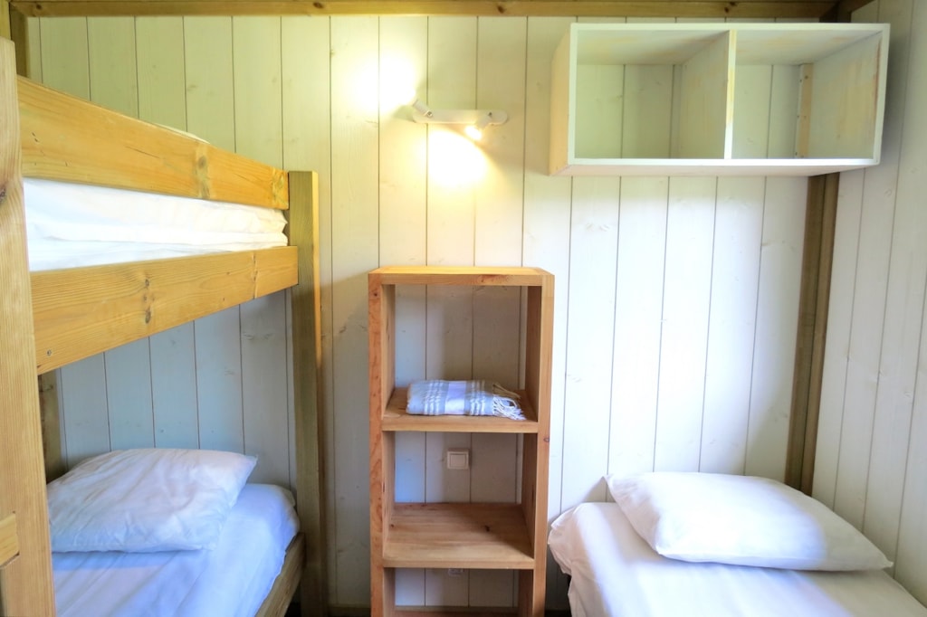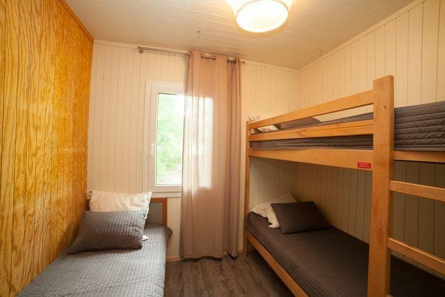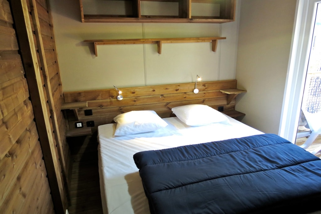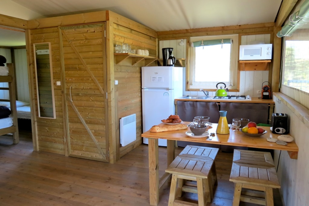 The COTTON is a furnished canvas lodge with a wooden floor for a maximum of 5 people. The interior space of 25 m² is composed of : 1 dining area, 1 equipped kitchen (fridge/freezer, gas stove with 2 burners, no sink but 1 water can 10L, coffee maker, gas kettle), 2 bedrooms (1 parents' bedroom with 1 double bed 140x190, 1 children's bedroom with 1 bunk bed 2 beds 80x190 and 1 single bed 80x190) The COTTON Lodge has NO SANITARY inside but is located near a collective sanitary. The 10 m² covered terrace is equipped with : 1 table/benches, 1 deckchair. The COTTON Lodges n° 69, 71, 72, 75 are located in the heart of the wooded park in the shade and in the first part of the campsite near the activities (water park, animations, games, mini-club, restaurant).You can choose your number free of charge by indicating, in the comments of your reservation, your 3 numbers in order of preference (beforehand, check their availability with the Reception). The CANCELLATION insurance, mandatory to be covered, must be subscribed after your reservation (internet offer of your choice). It is not offered on our reservation site. Animals are accepted (except dangerous dogs of category 1 and 2, bull terrier, pit bull, staff, staffy).