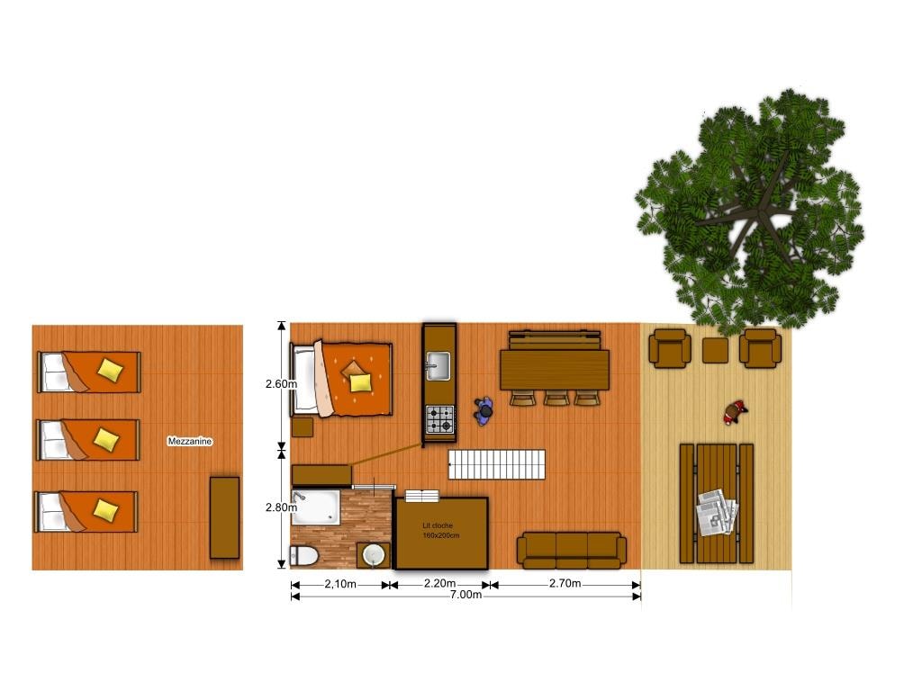 The MAEVA MEZZANINE PREMIUM is a 100% wooden chalet fully equipped (air conditioning) for a maximum of 6 people. The air-conditioned interior space of 30 m² is composed of : a) on the first floor: 1 living room with 1 sofa bed (2 single beds 80×200) / dining room, 1 equipped kitchen (fridge without freezer, gas hob 2 burners, microwave, coffee maker, gas kettle, toaster), 1 bathroom (1 XL shower, 1 washbasin), 1 separate toilet, 1 parents' bedroom with 1 double bed 160x200 b) on the mezzanine (stairs not recommended for young children) 1 children's bedroom with 2 single beds 80x190 The terrace with a sun blind of 14 m² is equipped with : 1 table/chairs, 1 gas plancha, 2 deckchairs. It has a 2nd terrace at the back in the shade common with the Chalet NEVA MEZZANINE PREMIUM n°16. The MAEVA MEZZANINE PREMIUM Chalet n°17 is located on the edge of the wooded park on the south side with a panoramic view of the Vercors mountains and the organic fields.The CANCELLATION insurance, mandatory to be covered, must be subscribed after your reservation (internet offer of your choice). It is not offered on our reservation site. Animals are accepted (except dangerous dogs of category 1 and 2, bull terrier, pit bull, staff, staffy).
