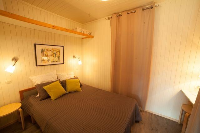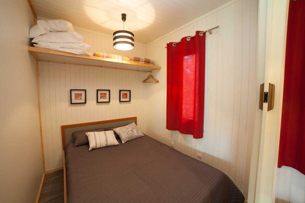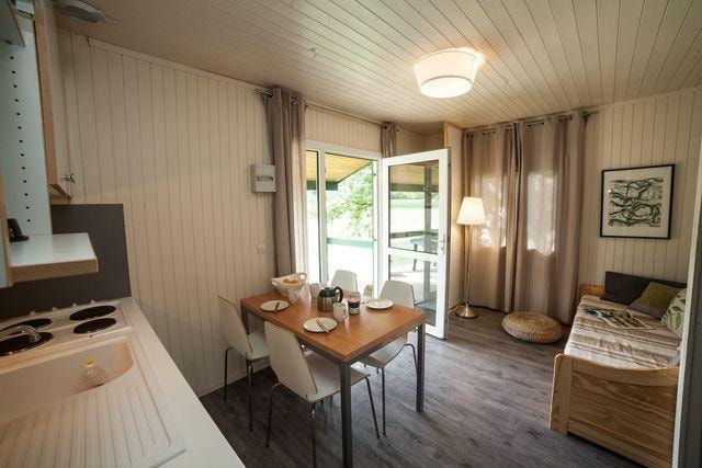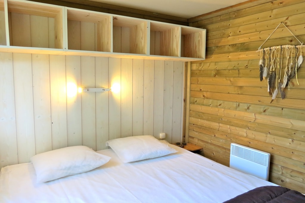 The NEVA is a 100% wooden chalet fully equipped (air conditioning) for 4 people maximum. The interior space of 24 m² is composed of : 1 living room with 1 sofa bed (2 single beds 80×200), 1 dining area, 1 equipped kitchen (fridge/freezer, gas hob with 4 burners, microwave, coffee maker, kettle, toaster), 1 bathroom (1 XL shower, 1 washbasin, 1 toilet), 1 parents' bedroom with 1 double bed 160x200 (modular room with a sliding curtain) The 11 m² covered terrace is equipped with : 1 table/chairs, 1 gas plancha, 2 chilian chairs. The NEVA Chalet n°80 is located in the wooded park in the shade and near the river. The CANCELLATION insurance, mandatory to be covered, must be subscribed after your reservation (internet offer of your choice). It is not offered on our reservation site. Animals are accepted (except dangerous dogs of category 1 and 2, bull terrier, pit bull, staff, staffy).