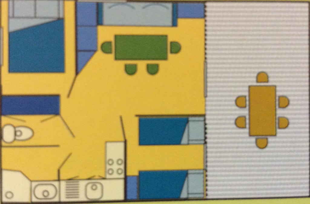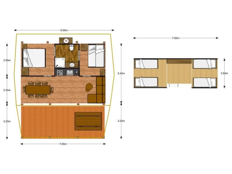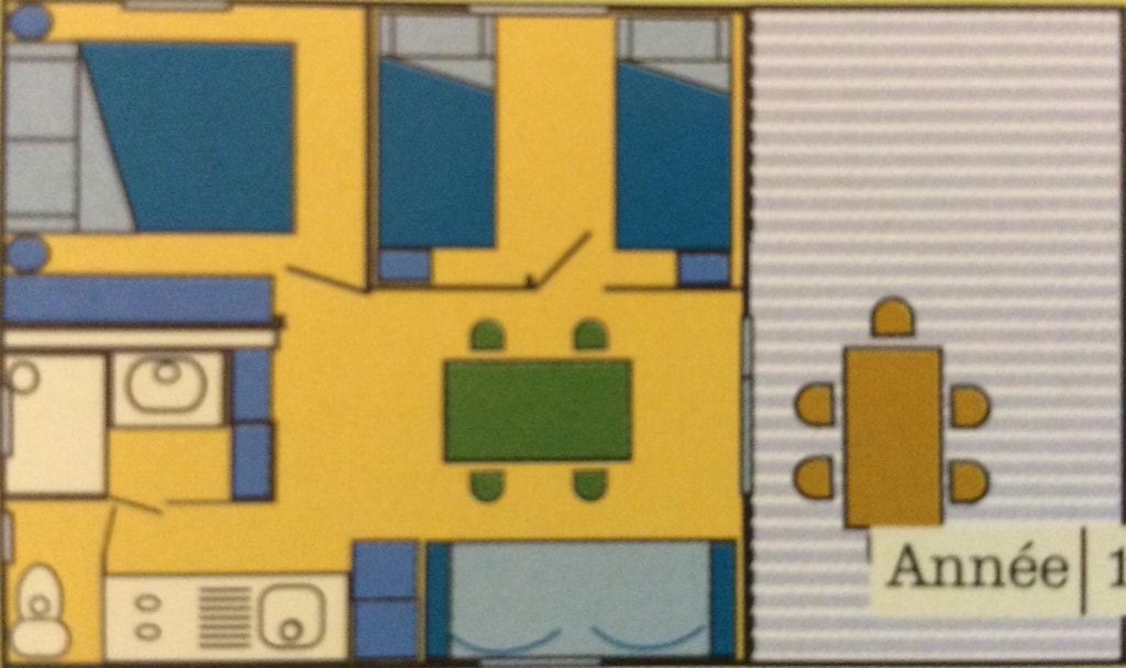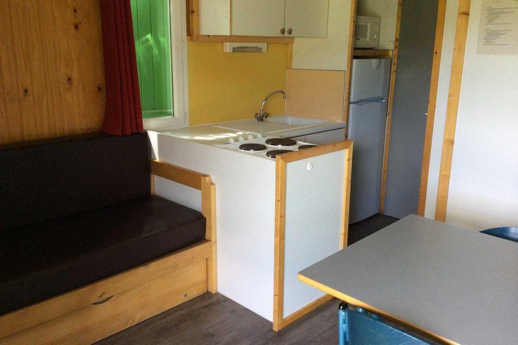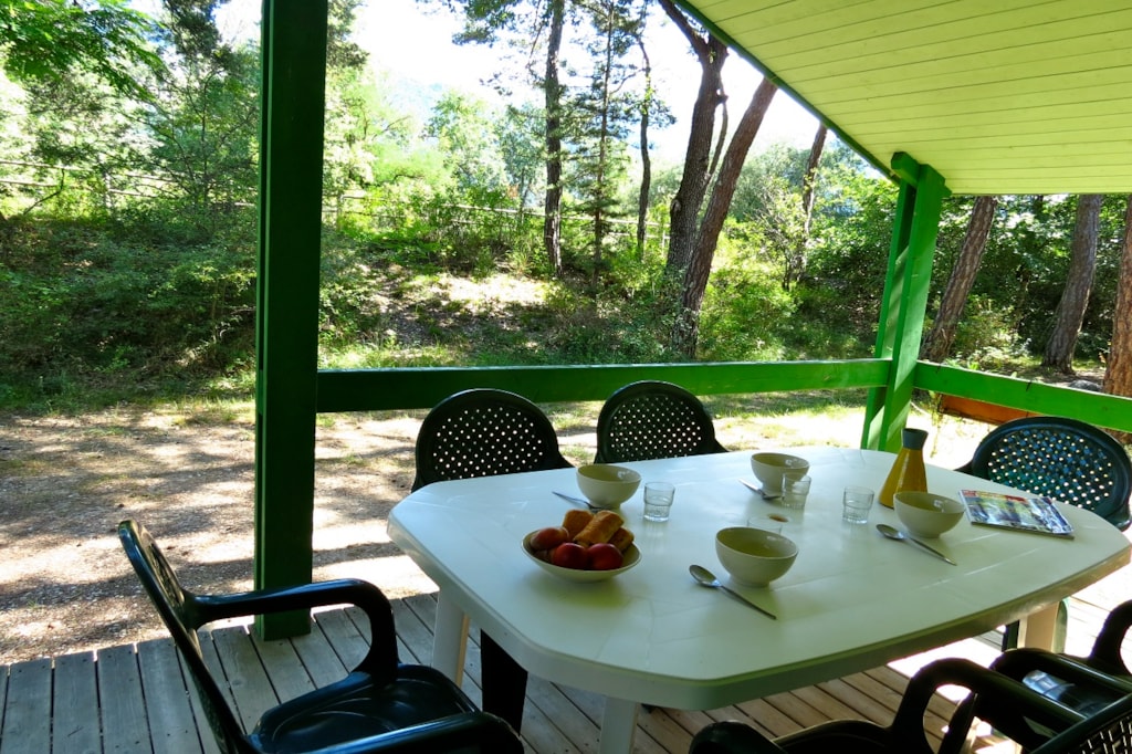 The MAEVA PREMIUM is a 100% wooden chalet fully equipped (air conditioning) for 6 people max. The air-conditioned interior space of 30 m² is composed of: 1 living room with 1 sofa bed (2 single beds 80×200) / dining room, 1 equipped kitchen (fridge/freezer, 4 burner gas hob, microwave, coffee maker, gas kettle, toaster), 1 bathroom (1 XL shower, 1 washbasin), 1 separate toilet, 2 bedrooms (1 parents' bedroom with 1 double bed 160x200, 1 children's bedroom with 2 single beds 80x190 or 1 bunk bed with 2 single beds 80x190 for n°5) The MAEVA PREMIUM n°5 is adapted to people with reduced mobility (PMR) : its kitchen has a lower work surface (gas hob with 2 burners), its bathroom has a shower without partition (but 1 curtain), 1 lower sink, 1 adapted toilet. The 14 m² covered terrace is equipped with : 1 table/chairs, 1 gas plancha, 2 deckchairs The MAEVA PREMIUM n°5, 20, 21 are located on the edge of the wooded park south side with a panoramic view on the Vercors and the organic fields. The MAEVA PREMIUM n°5 is located at the beginning of the campsite near the animations.You can choose your number for free by indicating, in the comments of your reservation, your 3 numbers in order of preference (beforehand, check their availability with the Reception). The CANCELLATION insurance, mandatory to be covered, must be subscribed after your reservation (internet offer of your choice). It is not offered on our reservation site. Animals are accepted (except dangerous dogs of cat 1&2)