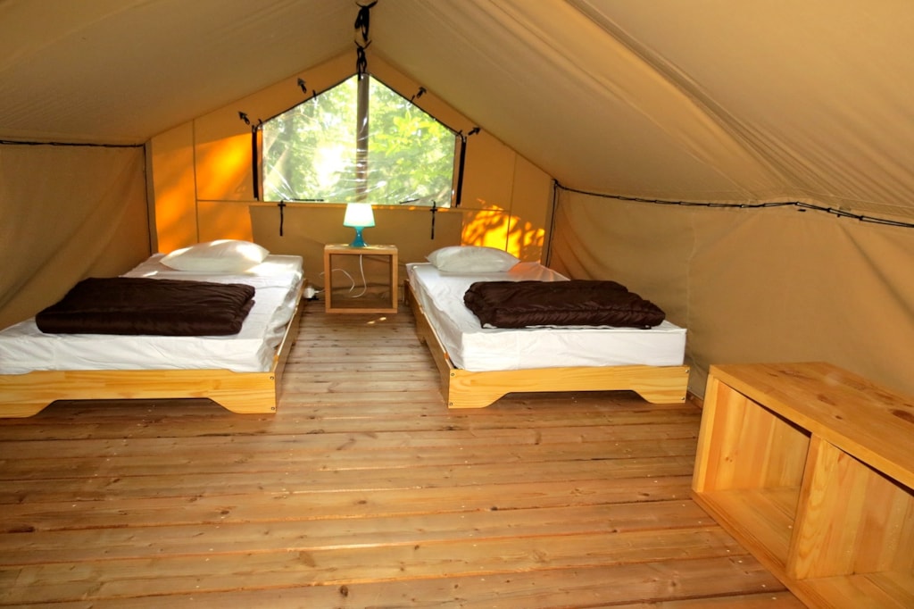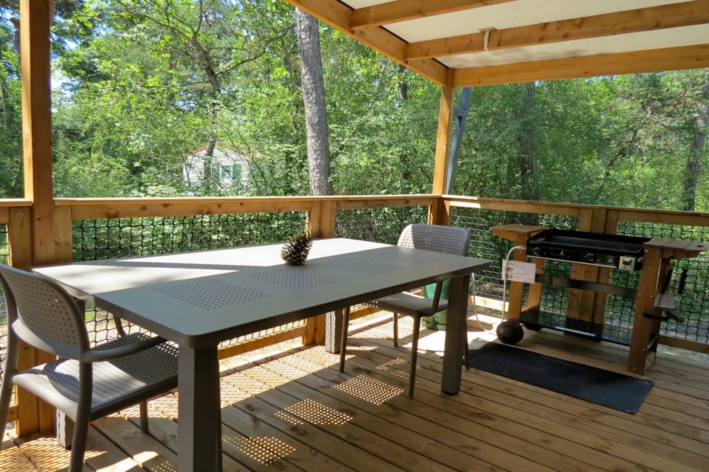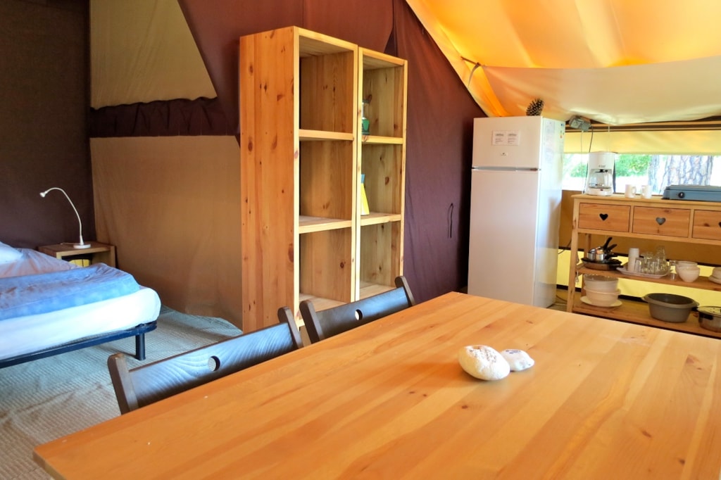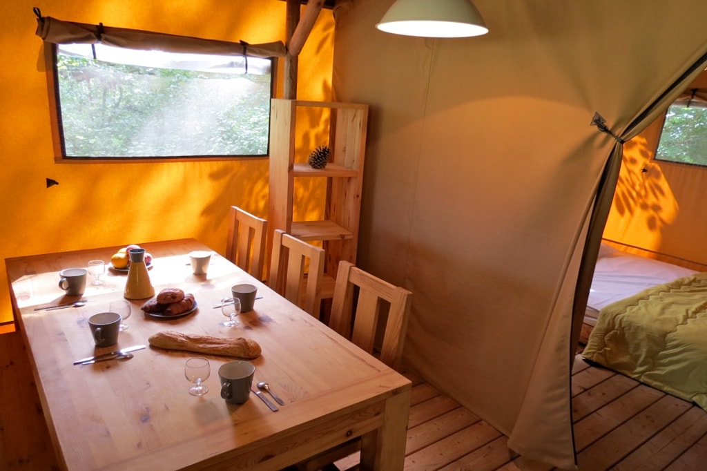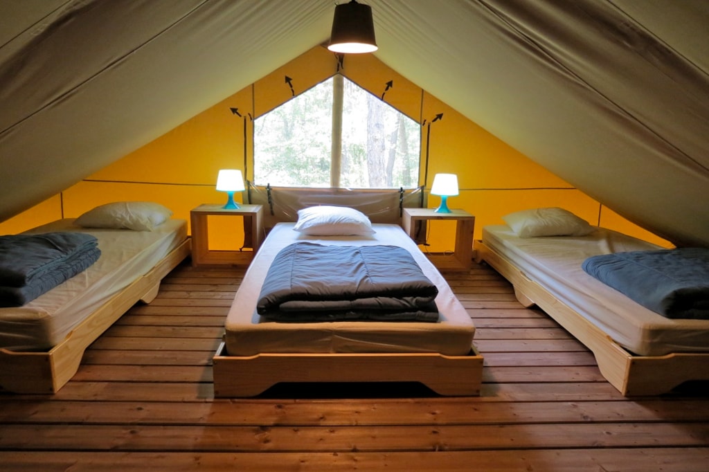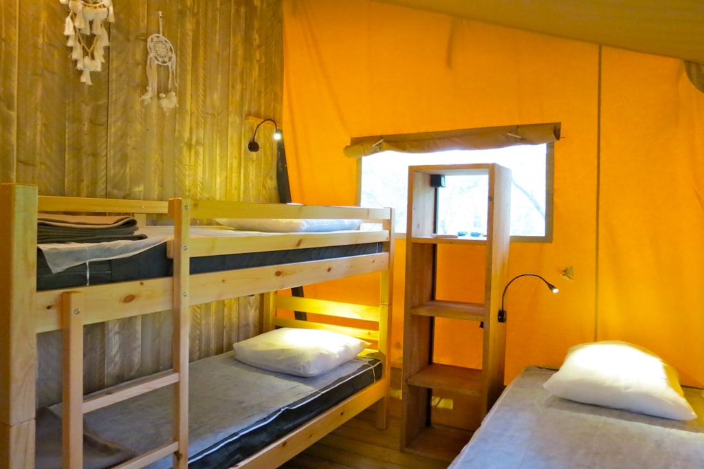 The FOREST is a furnished canvas lodge with wooden floors and partitions for a maximum of 5 people. The interior space of 25 m² with wooden walls is composed of: 1 dining area, 1 equipped kitchen (fridge/freezer, gas stove with 4 burners, sink without running water but with 1 water can 10L, microwave, coffee maker, gas kettle), 2 bedrooms (1 parents' bedroom with 1 double bed 160x200, 1 children's bedroom with 1 bunk bed 2 beds 80x190 and 1 single bed 80x190). The FOREST has NO SANITARY inside but is located near a collective sanitary. The 15 m² covered terrace is equipped with : 1 table/benches, 2 Chilean chairs The FOREST Lodges are located in the heart of the wooded park in the shade (n° 24, 28, 57, 60, 62,108, 126, 166 and 166-1, 179 and 179-1) and in the first part of the campsite near the activities (water park, animations, games, mini-club, restaurant) except for the FOREST n°126, 166 and 166-1, 179 and 179-1.You can choose your number free of charge by indicating, in the comments of your reservation, your 3 numbers in order of preference (beforehand, check their availability with the Reception). The CANCELLATION insurance, mandatory to be covered, must be subscribed after your reservation (internet offer of your choice). It is not offered on our reservation site. Animals are accepted (except dangerous dogs of category 1 and 2, bull terrier, pit bull, staff, staffy).