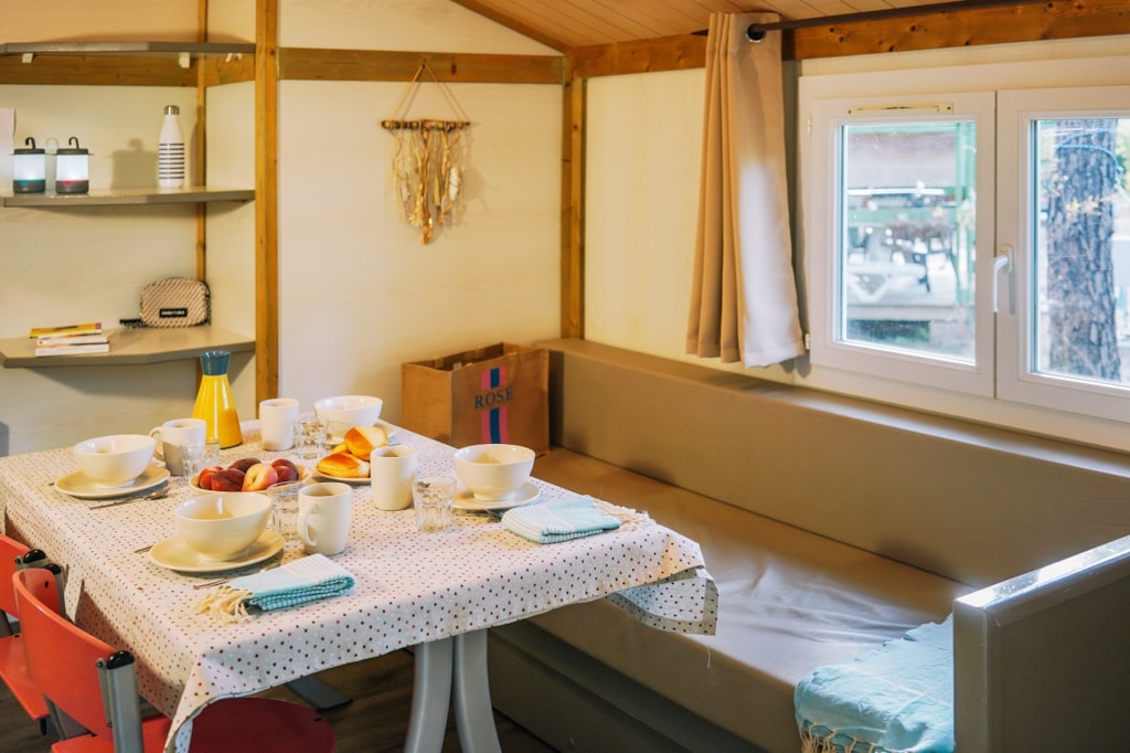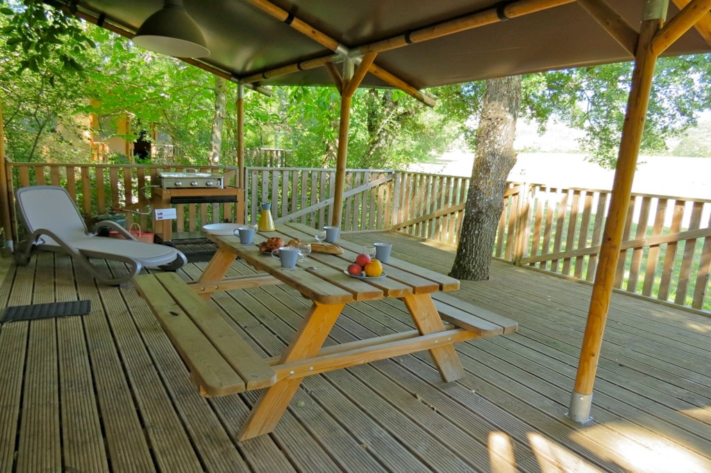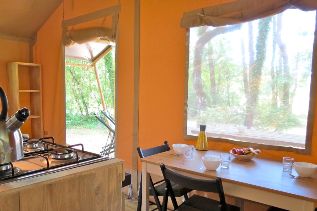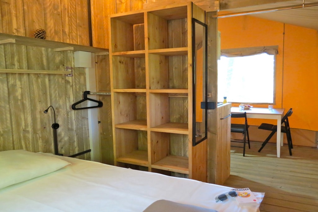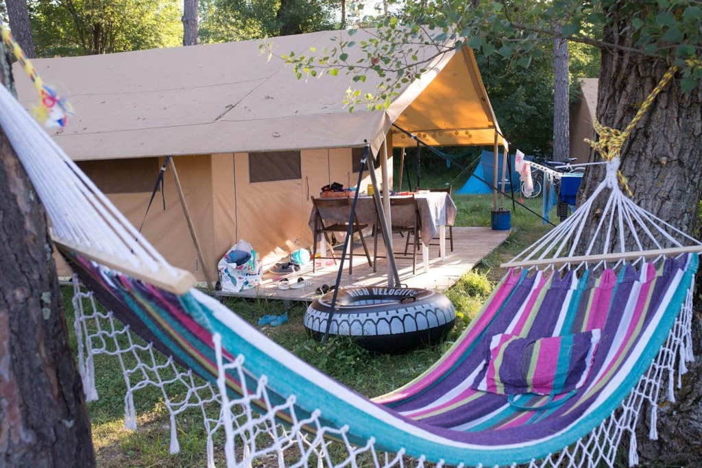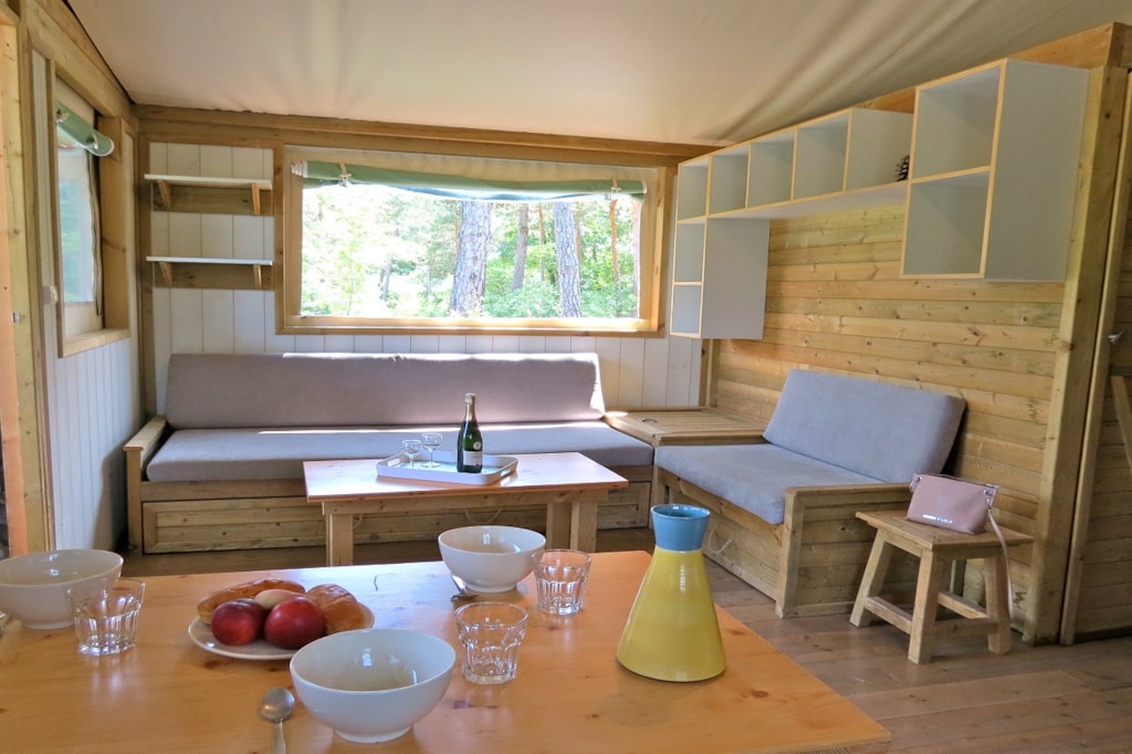 The FOREST is a furnished canvas lodge with wooden floors and partitions for a maximum of 5 people. The interior space of 25 m² with wooden walls is composed of: 1 dining area, 1 equipped kitchen (fridge/freezer, gas stove with 4 burners, sink without running water but with 1 water can 10L, microwave, coffee maker, gas kettle), 2 bedrooms (1 parents' bedroom with 1 double bed 160x200, 1 children's bedroom with 1 bunk bed 2 beds 80x190 and 1 single bed 80x190). The FOREST has NO SANITARY inside but is located near a collective sanitary. The 15 m² covered terrace is equipped with : 1 table/benches, 2 Chilean chairs The FOREST Lodges are located in the heart of the wooded park in the shade (n° 24, 28, 57, 60, 62,108, 126, 166 and 166-1, 179 and 179-1) and in the first part of the campsite near the activities (water park, animations, games, mini-club, restaurant) except for the FOREST n°126, 166 and 166-1, 179 and 179-1.You can choose your number free of charge by indicating, in the comments of your reservation, your 3 numbers in order of preference (beforehand, check their availability with the Reception). The CANCELLATION insurance, mandatory to be covered, must be subscribed after your reservation (internet offer of your choice). It is not offered on our reservation site. Animals are accepted (except dangerous dogs of category 1 and 2, bull terrier, pit bull, staff, staffy).