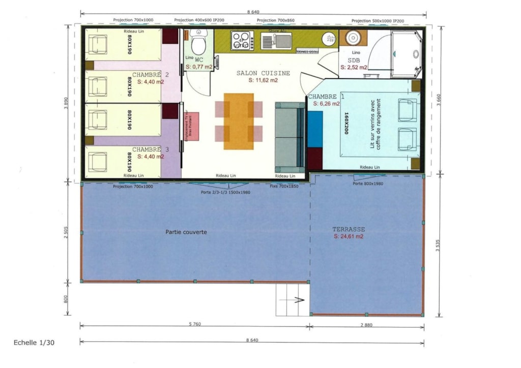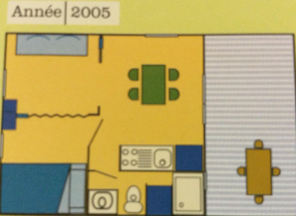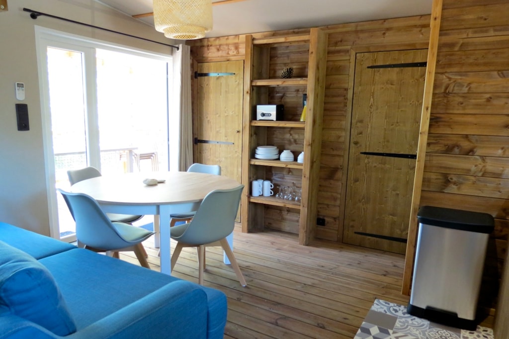 The Marina is a 100% wooden chalet fully equipped (air conditioning) for a maximum of7 people. The interior space of 35 m² is composed of : 1 living room with 1 sofa bed (2 single beds 80×200), 1 dining area, 1 fully equipped kitchen (fridge/freezer, 4 burner gas hob, microwave, coffee maker, gas kettle, toaster), 1 bathroom (1 XL shower, 1 washbasin), 1 separate toilet, 2 bedrooms (1 parents' bedroom with 1 double bed 160x200, 1 children's bedroom with 1 bunk bed 80x190 and 1 single bed 80x190) The 14 m² covered terrace is equipped with : 1 table/chairs, 1 gas plancha, 2 Chilean chairs. The Chalet MARINA n°79 is located in the wooded park in the shade and near the river.The CANCELLATION insurance, mandatory to be covered, must be subscribed after your reservation (internet offer of your choice). It is not offered on our reservation site. Animals are accepted (except dangerous dogs of category 1 and 2, bull terrier, pit bull, staff, staffy).