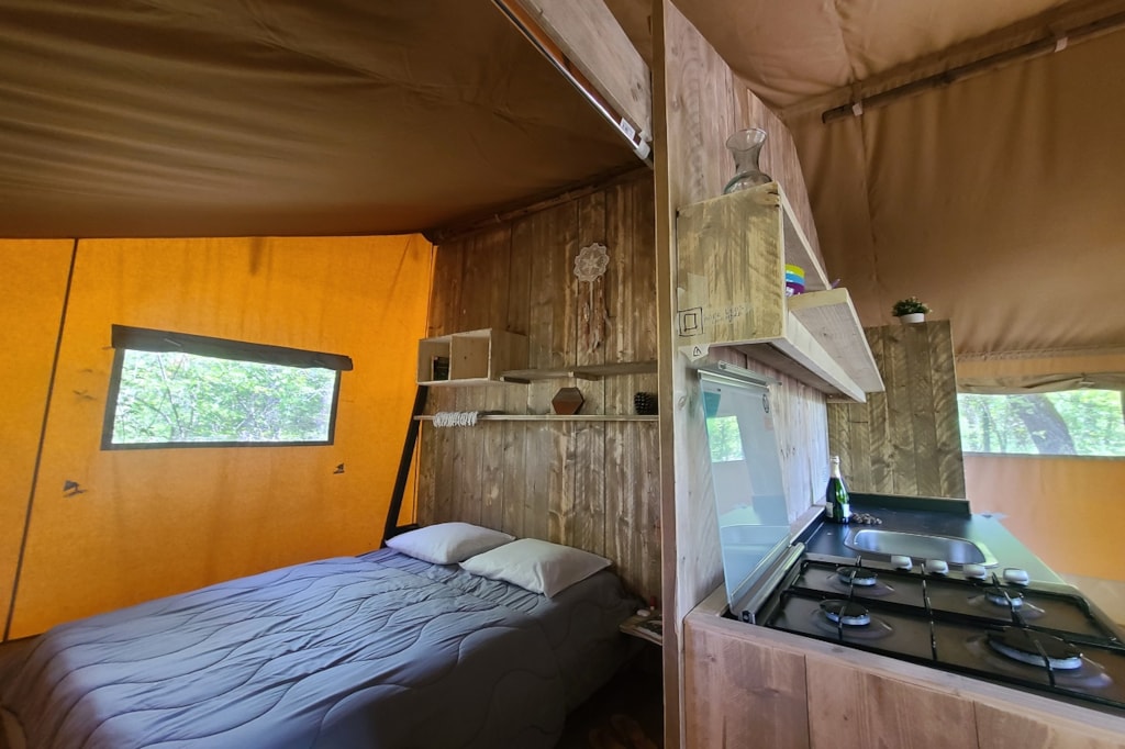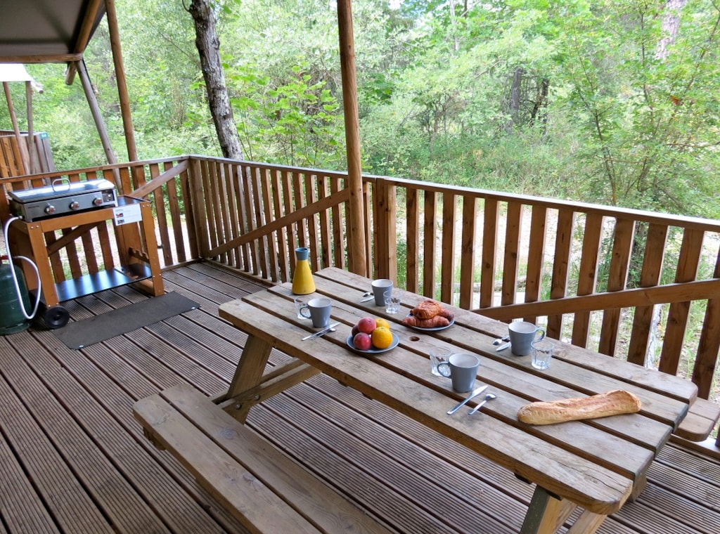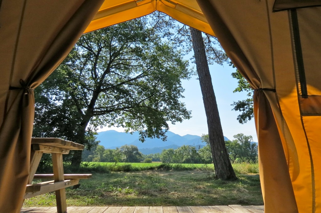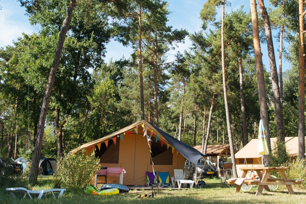 The DELUXE FOREST is a furnished canvas lodge with wooden floors and partitions for a maximum of 5 people. The interior space of 25 m² with wooden walls is composed of: 1 dining area, 1 equipped kitchen (fridge/freezer, gas stove with 4 burners, sink without running water but with 1 water can 10L, microwave, coffee maker, gas kettle), 2 bedrooms (1 parents' bedroom with 1 double bed 160x200, 1 children's bedroom with 1 bunk bed 2 beds 80x190 and 1 single bed 80x190) The DELUXE has a PRIVATE SANITARY which is not in the Lodge but in a building at 10-30m including 1 shower, 1 washbasin, 1 toilet exclusively for your family (1 key is given to you at your arrival). The 15 m² covered terrace is equipped with: 1 table/benches, 1 deckchair. The n°136, 137, 138, 141, 142, 143, 145, 146, 147, 148, 149, 150 are installed in the last part of the campsite on the edge of the wooded park on the south side with an unobstructed view of the Vercors mountains and the organic fields. Take the bikes of your young children.You can choose your number free of charge by indicating, in the comments of your reservation, your 3 numbers in order of preference (beforehand, check their availability with the Reception). The CANCELLATION insurance, mandatory to be covered, must be subscribed after your reservation (internet offer of your choice). It is not offered on our reservation site. Animals are accepted (except dangerous dogs of category 1 and 2, bull terrier, pit bull, staff, staffy).