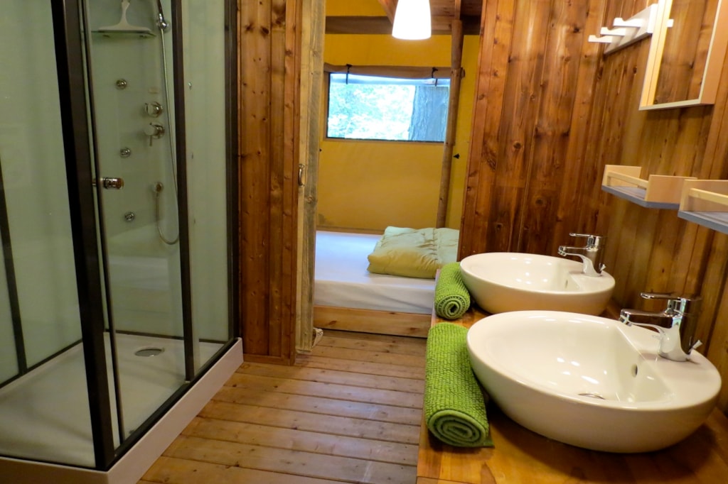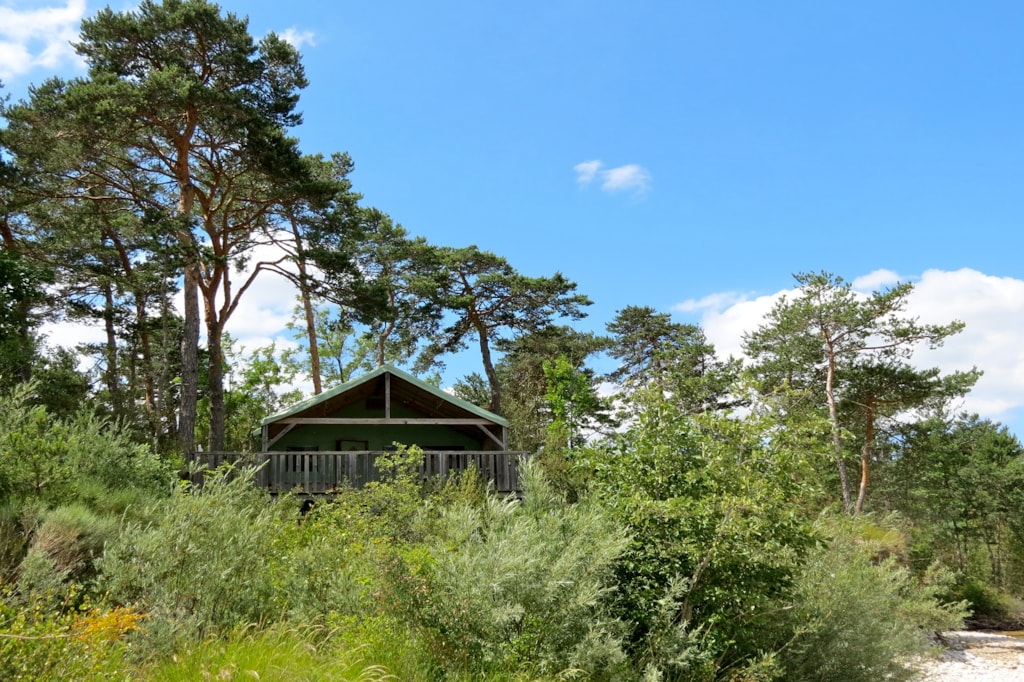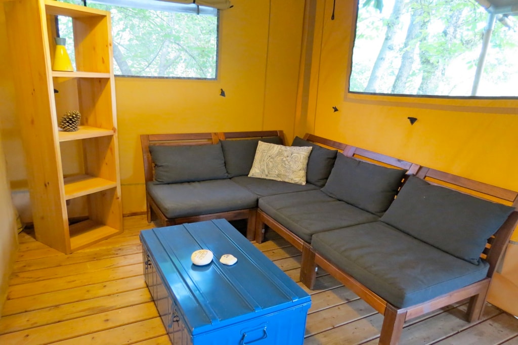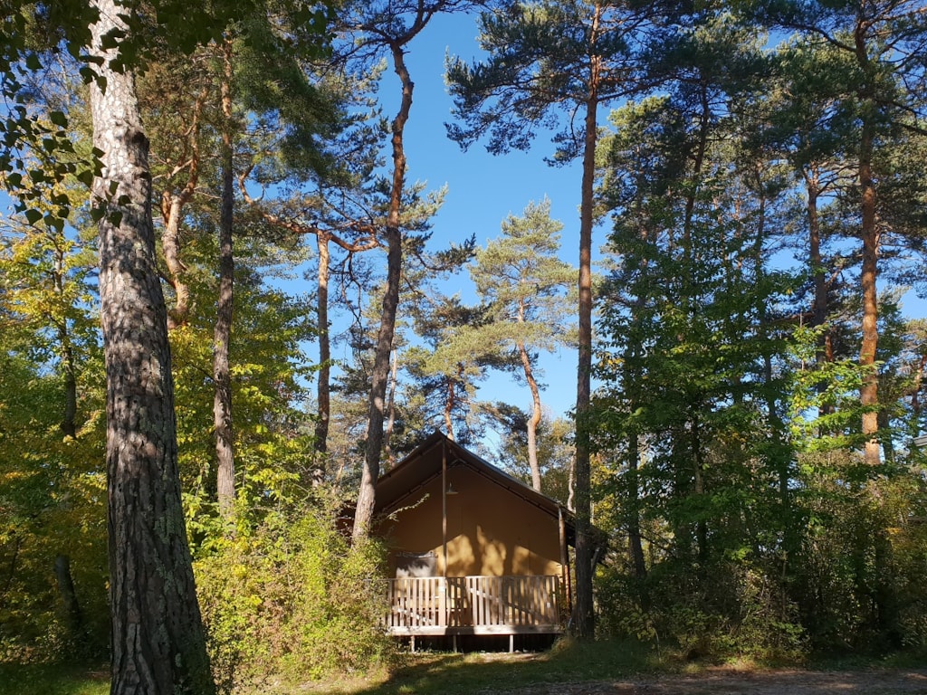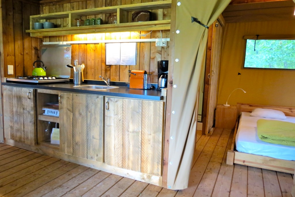 The DELUXE FOREST is a furnished canvas lodge with wooden floors and partitions for a maximum of 5 people. The interior space of 25 m² with wooden walls is composed of: 1 dining area, 1 equipped kitchen (fridge/freezer, gas stove with 4 burners, sink without running water but with 1 water can 10L, microwave, coffee maker, gas kettle), 2 bedrooms (1 parents' bedroom with 1 double bed 160x200, 1 children's bedroom with 1 bunk bed 2 beds 80x190 and 1 single bed 80x190) The DELUXE has a PRIVATE SANITARY which is not in the Lodge but in a building at 10-30m including 1 shower, 1 washbasin, 1 toilet exclusively for your family (1 key is given to you at your arrival). The 15 m² covered terrace is equipped with: 1 table/benches, 1 deckchair. The n°136, 137, 138, 141, 142, 143, 145, 146, 147, 148, 149, 150 are installed in the last part of the campsite on the edge of the wooded park on the south side with an unobstructed view of the Vercors mountains and the organic fields. Take the bikes of your young children.You can choose your number free of charge by indicating, in the comments of your reservation, your 3 numbers in order of preference (beforehand, check their availability with the Reception). The CANCELLATION insurance, mandatory to be covered, must be subscribed after your reservation (internet offer of your choice). It is not offered on our reservation site. Animals are accepted (except dangerous dogs of category 1 and 2, bull terrier, pit bull, staff, staffy).