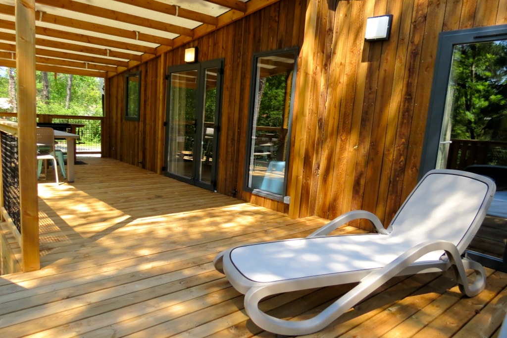 The JADE is a 100% wooden chalet fully equipped (air conditioning) for a maximum of7 people. The interior air-conditioned space of 35 m² is composed of : 1 living room with 1 sofa bed (2 single beds 80×200) / dining room, 1 equipped kitchen (fridge/freezer, 4 burner gas hob, microwave, coffee maker, gas kettle, toaster), 1 shower room (1 XL shower, 1 sink), 1 separate toilet, 2 bedrooms (1 parents' bedroom with 1 double bed 160x200, 1 children's bedroom with 1 bunk bed 80x190 and 1 single bed 80x190 for JADE n°38 or 3 single beds for JADE n°37, 39, 40). The 14 m² covered terrace is equipped with : 1 table/chairs, 1 gas plancha, 2 Chilean chairs. The Chalets JADE n°37, 38, 39, 40 are located at the beginning of the campsite close to the services (water park, animations, games, mini-club, restaurant) at the edge of the wooded park in the shade and near the river. You can choose your number free of charge by indicating, in the comments of your reservation, your 3 numbers in order of preference (beforehand, check their availability with the Reception). The CANCELLATION insurance, mandatory to be covered, must be subscribed after your reservation (internet offer of your choice). It is not offered on our reservation site. Animals are accepted (except dangerous dogs of category 1 and 2, bull terrier, pit bull, staff, staffy).