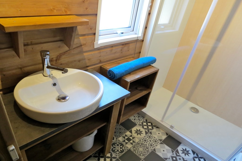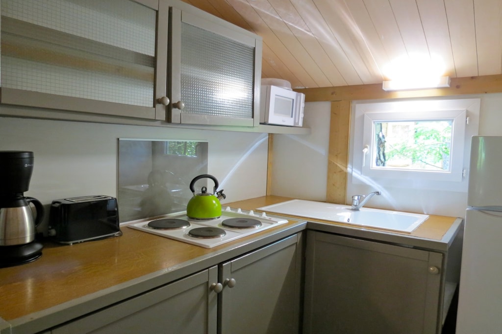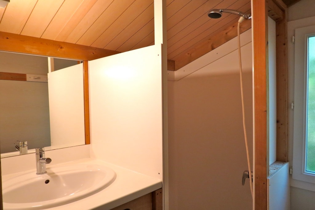 The NEVA PREMIUM is a 100% wooden chalet fully equipped (air conditioning) for 4 people maximum. The interior space of 24 m² is composed of : 1 living room with 1 sofa bed (2 single beds 80×200), 1 dining area, 1 equipped kitchen (fridge/freezer, 4 burner gas hob, microwave, coffee maker, gas kettle, toaster), 1 bathroom (1 XL shower, 1 washbasin, 1 toilet), 1 parents' bedroom with 1 double bed 160x200 (room can be modified with a sliding curtain). The 11 m² covered terrace is equipped with : 1 table/chairs, 1 gas plancha, 2 deckchairs. The NEVA PREMIUM cottages n°8, 18, 19 are located on the edge of the wooded park on the south side with a panoramic view on the Vercors mountains and the organic fields. NEVA PREMIUM n°8 is located at the beginning of the campsite near the services (water park, animations, games, mini-club, restaurant).You can choose your number free of charge by indicating, in the comments of your reservation, your 3 numbers in order of preference (beforehand, check their availability with the Reception). The CANCELLATION insurance, mandatory to be covered, must be subscribed after your reservation (internet offer of your choice). It is not offered on our reservation site. Animals are accepted (except dangerous dogs of category 1 and 2, bull terrier, pit bull, staff, staffy).