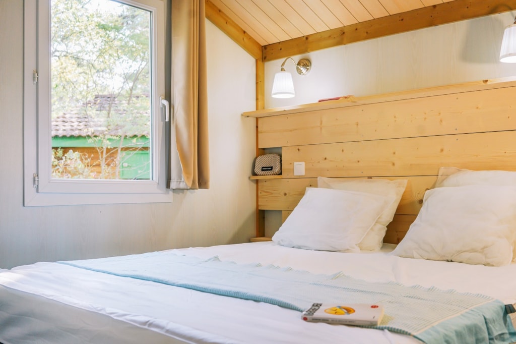 The NATURALIS is a charming cottage 100% wood and fully equipped (dishwasher, air conditioning) for a maximum of 6 people. The 35 m² air-conditioned interior space is composed of: 1 living room / dining room, 1 equipped kitchen (fridge / freezer, gas hob 3 burners, microwave, dishwasher, coffee maker, Nespresso, electric kettle, toaster), 1 bathroom (1 XL shower, 1 washbasin), 1 separate toilet, 3 bedrooms (1 parents' bedroom with 1 double bed 160x200, 2 children's bedrooms with 2 single beds 80x190) The large terrace of 22 m² semi-covered is closed and equipped : 1 table/chairs, 1 gas plancha, 2 deckchairs The NATURALIS cottages are located in the heart of the wooded park (n°9, 12, 13, 14, 15, 26, 27, 29, 30, 31, 32, 33, 35, 36, 49, 50) or on the edge of the wooded park near the river (n°41, 42, 43, 44, 88 2). The NATURALIS n°9, 12, 13, 14, 36 are located at the beginning of the campsite near the services (water park, animations, games, mini-club, restaurant). You can choose your number free of charge by indicating, in the comments of your reservation, your 3 numbers in order of preference (beforehand, check their availability with the Reception). The CANCELLATION insurance, mandatory to be covered, must be subscribed after your reservation (internet offer of your choice). It is not offered on our reservation site. Animals are accepted (except dangerous dogs of category 1 and 2, bull terrier, pit bull, staff, staffy).