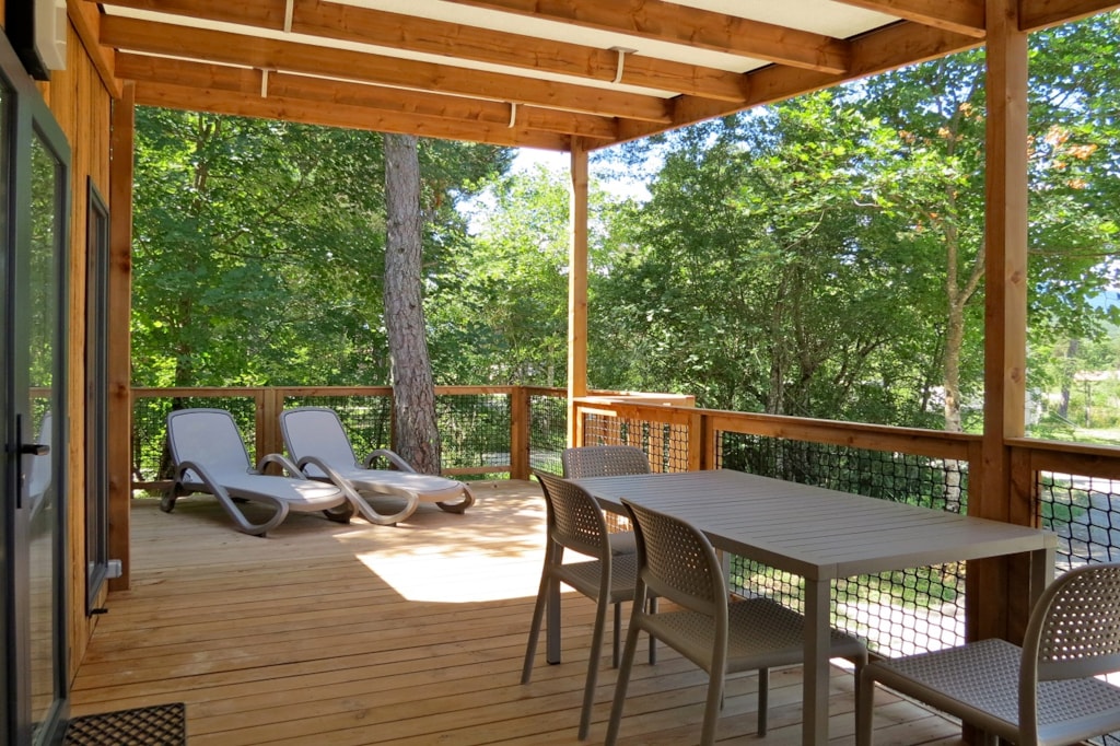 The NATURALIS is a charming cottage 100% wood and fully equipped (dishwasher, air conditioning) for a maximum of 6 people. The 35 m² air-conditioned interior space is composed of: 1 living room / dining room, 1 equipped kitchen (fridge / freezer, gas hob 3 burners, microwave, dishwasher, coffee maker, Nespresso, electric kettle, toaster), 1 bathroom (1 XL shower, 1 washbasin), 1 separate toilet, 3 bedrooms (1 parents' bedroom with 1 double bed 160x200, 2 children's bedrooms with 2 single beds 80x190) The large terrace of 22 m² semi covered is closed and equipped : 1 table/chairs, 1 gas plancha, 2 deckchairs The NATURALIS PREMIUM cottages n°163 and 164 are located in the last part of the campsite, on the edge of the wooded park and the river, with a breathtaking view of the river and the Vercors mountains. Take your young children's bicycles because the NATURALIS PREMIUM cottages are in the last part of the campsite. You can choose your number free of charge by indicating, in the comments of your reservation, your 3 numbers in order of preference (beforehand, check their availability with the Reception). The CANCELLATION insurance, mandatory to be covered, must be subscribed after your reservation (internet offer of your choice). It is not offered on our reservation site. Animals are accepted (except dangerous dogs of category 1 and 2, bull terrier, pit bull, staff, staffy).