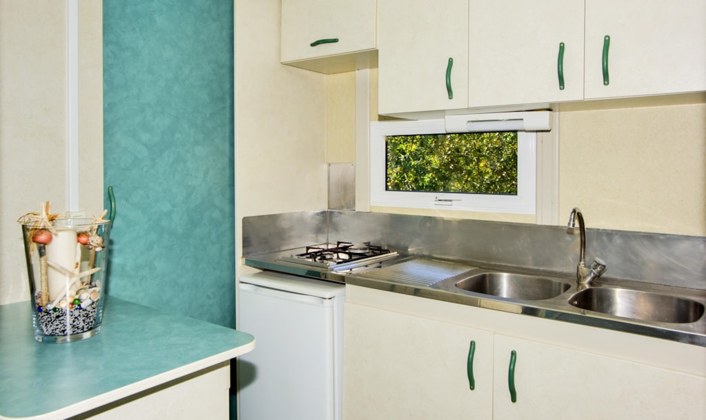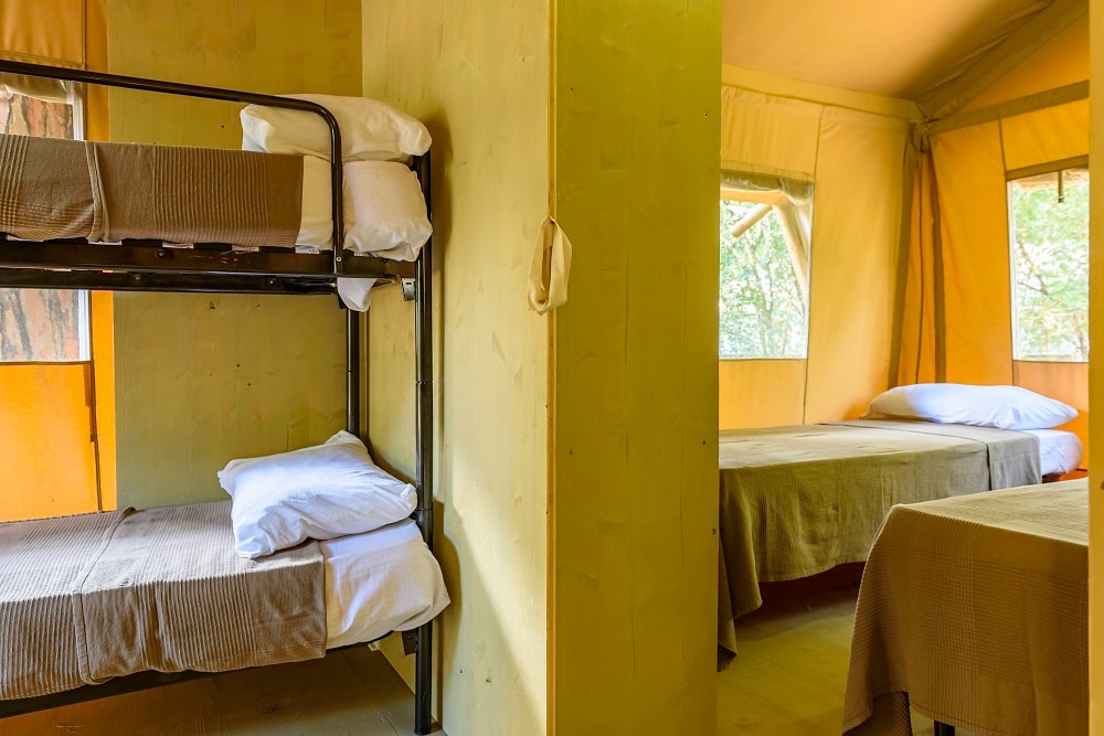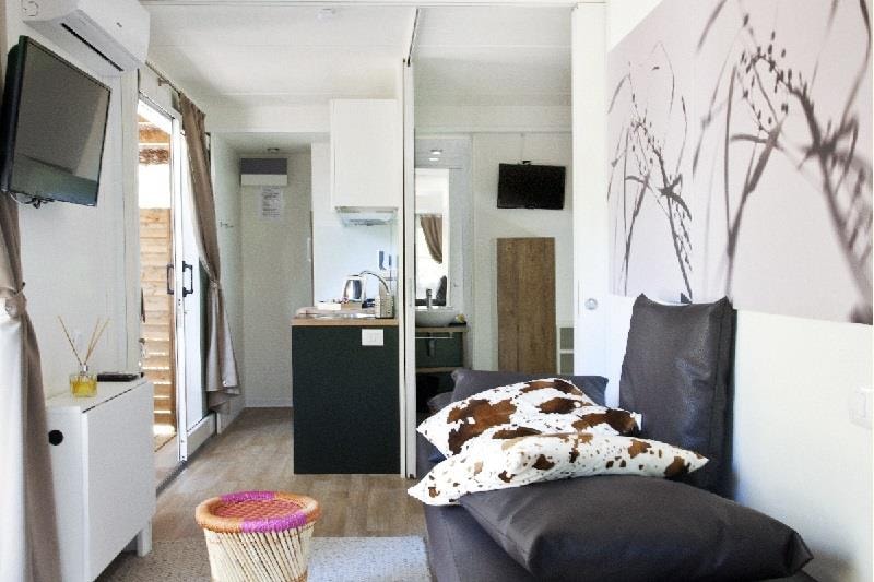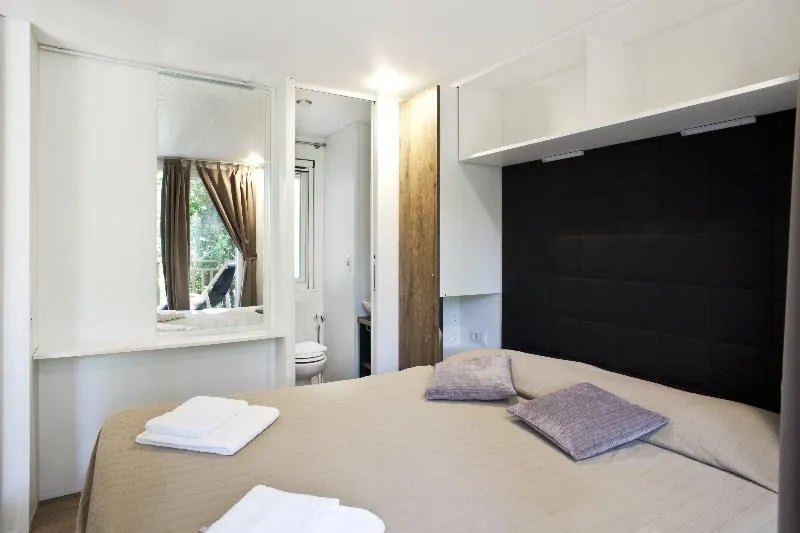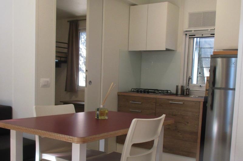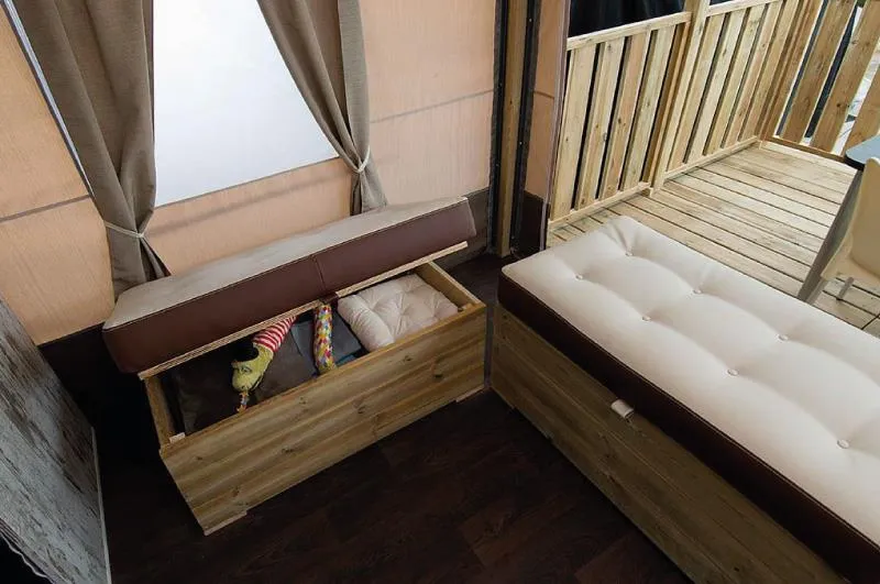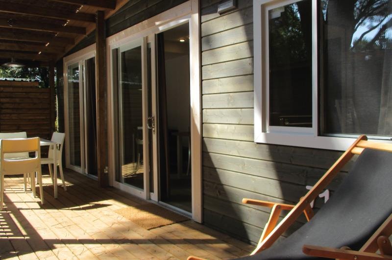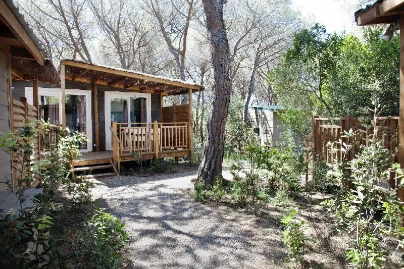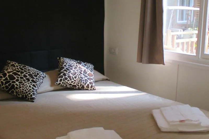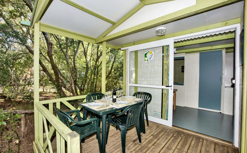COTTAGE CLUB 5 - Holzhäuschen mit 5 Betten. Größe: ca. 35 m2 mit überdachter Veranda. INNEN: Schlafzimmer mit Doppelbett: Bett 140x200, 2 Schränke. Jugendzimmer: 1 Etagenbetten 80x200 + 1 Einzelbett 80x200, 1 Kleiderschrank. Wohnzimmer: eingebaute Bank, Stuhl, Tisch, TV-Schrank. Küche: Spüle aus rostfreiem Stahl, Herd mit 2 Brennern, Kühlschrank 130 l, Schrank, Geschirr, Besteck und Utensilien. Sanitäranlagen: Duschkabine, WC, Waschbecken. AUSSTATTUNG: Warmwasserboiler, Klimatisierung, Beleuchtung mit Scheinwerfern, 220 V Steckdosen, Schwimmweste. AUSSEN: überdachte Veranda mit Tisch + 5 Stühlen.