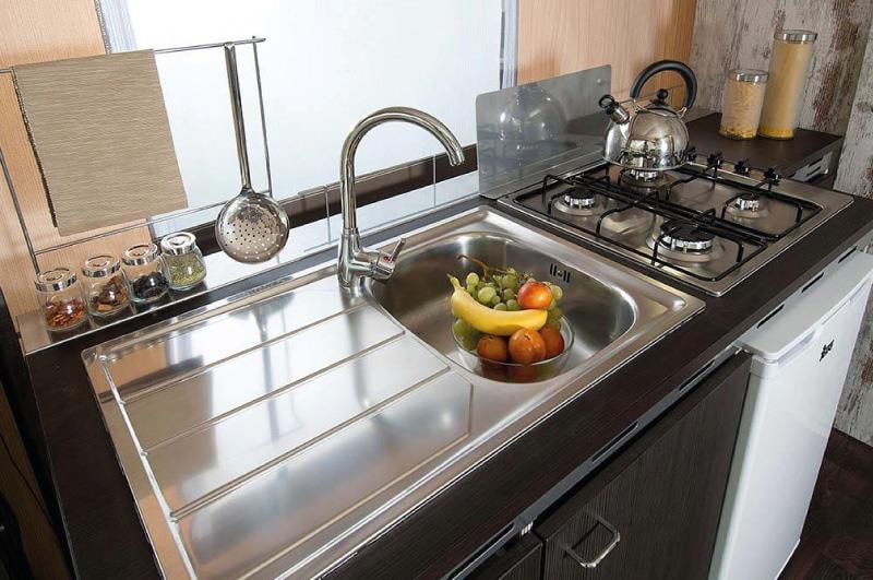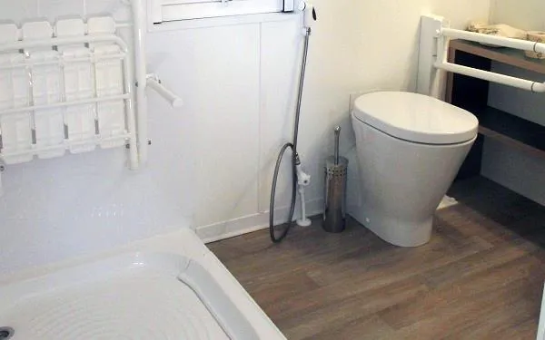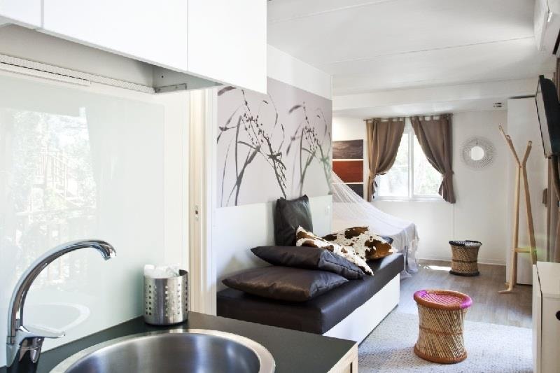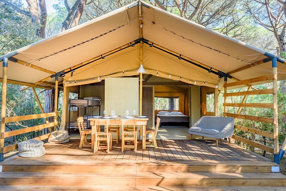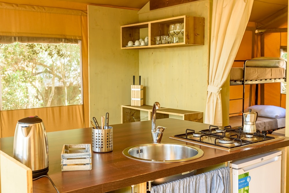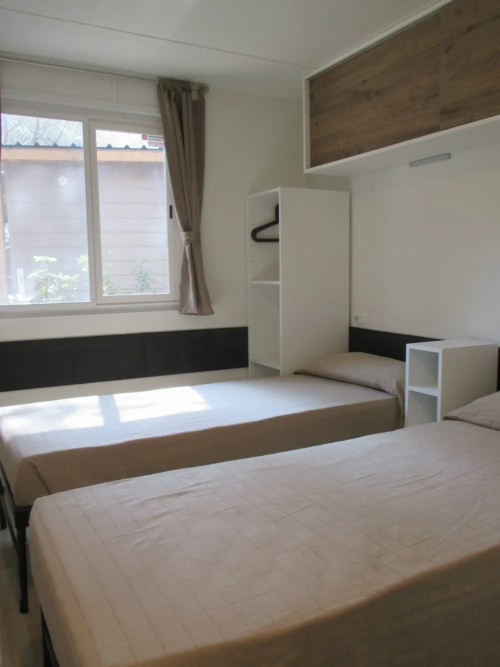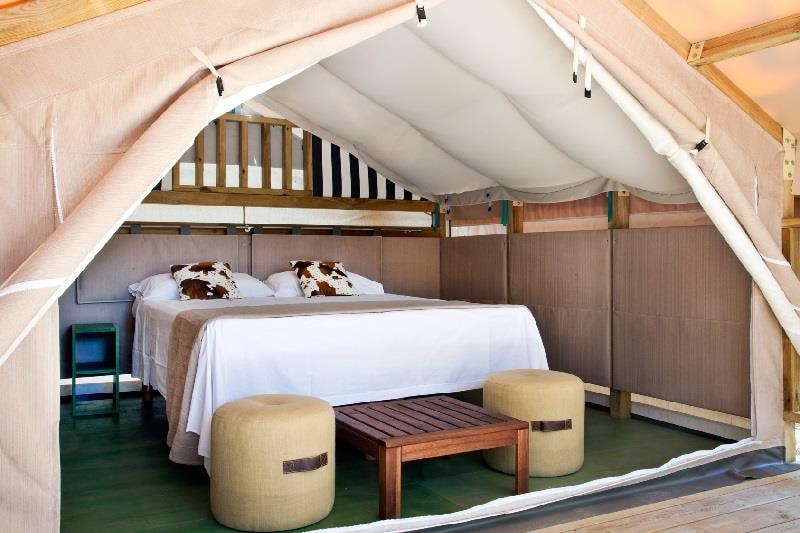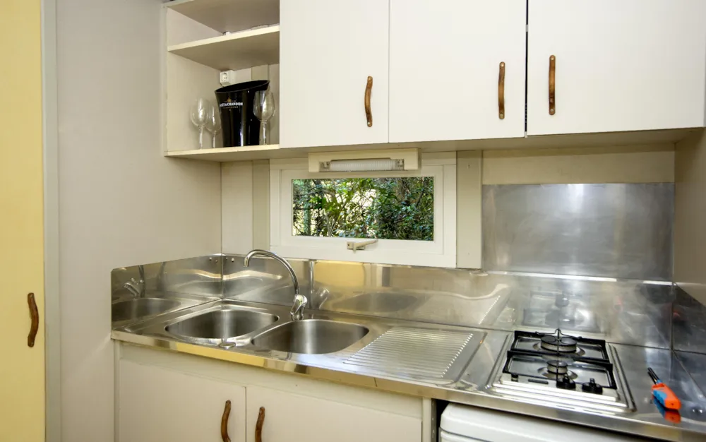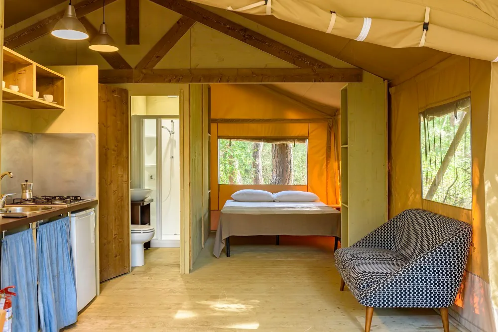 COTTAGE CLUB 5 - Holzhäuschen mit 5 Betten. Größe: ca. 35 m2 mit überdachter Veranda. INNEN: Schlafzimmer mit Doppelbett: Bett 140x200, 2 Schränke. Jugendzimmer: 1 Etagenbetten 80x200 + 1 Einzelbett 80x200, 1 Kleiderschrank. Wohnzimmer: eingebaute Bank, Stuhl, Tisch, TV-Schrank. Küche: Spüle aus rostfreiem Stahl, Herd mit 2 Brennern, Kühlschrank 130 l, Schrank, Geschirr, Besteck und Utensilien. Sanitäranlagen: Duschkabine, WC, Waschbecken. AUSSTATTUNG: Warmwasserboiler, Klimatisierung, Beleuchtung mit Scheinwerfern, 220 V Steckdosen, Schwimmweste. AUSSEN: überdachte Veranda mit Tisch + 5 Stühlen.