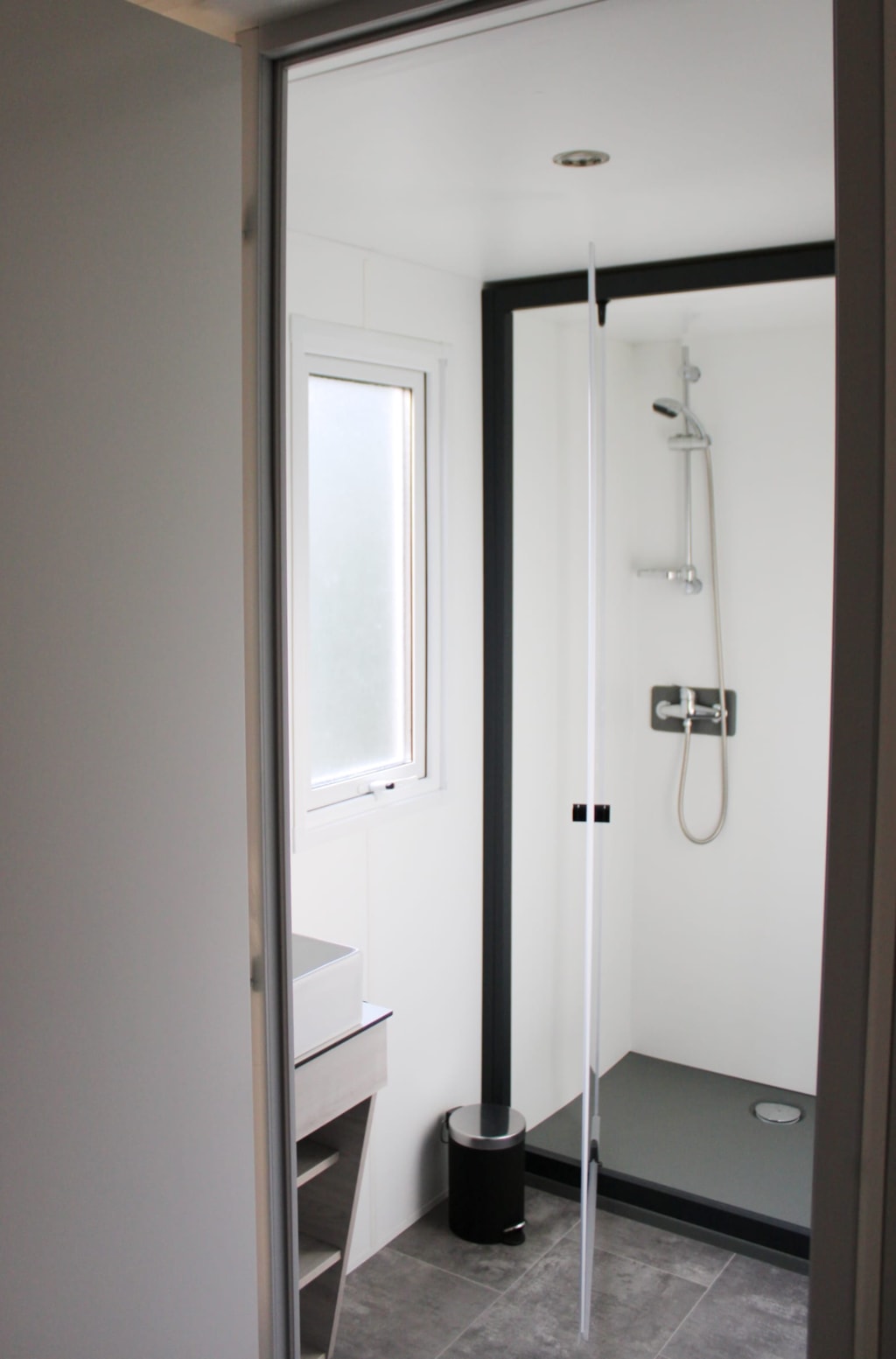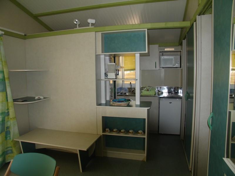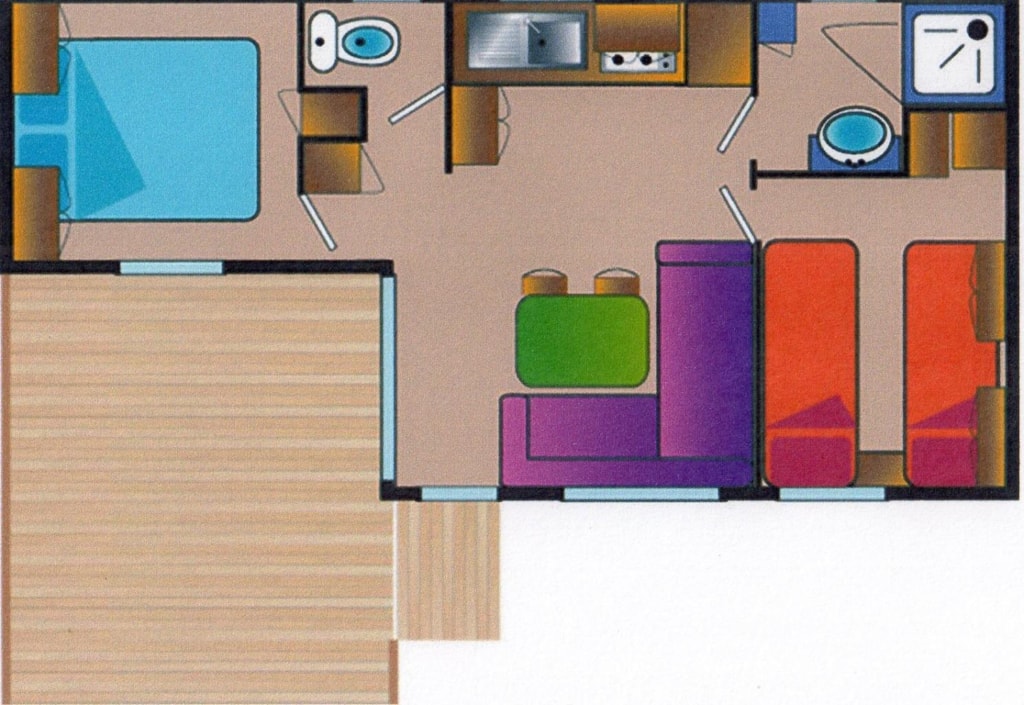 24 m² - 2 Schlafzimmer: 1 Doppelbett (140 x 190), 2 Einzelbetten (90 x 190) - Badezimmer und separates WC - Küchenbereich mit Kühlschrank, Mikrowelle, Herd, elektrische Kaffeemaschine. Wohnbereich mit Sitzbank - Geschirr. Kissen und Bettdecken werden gestellt. Gartenlounge.