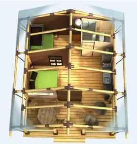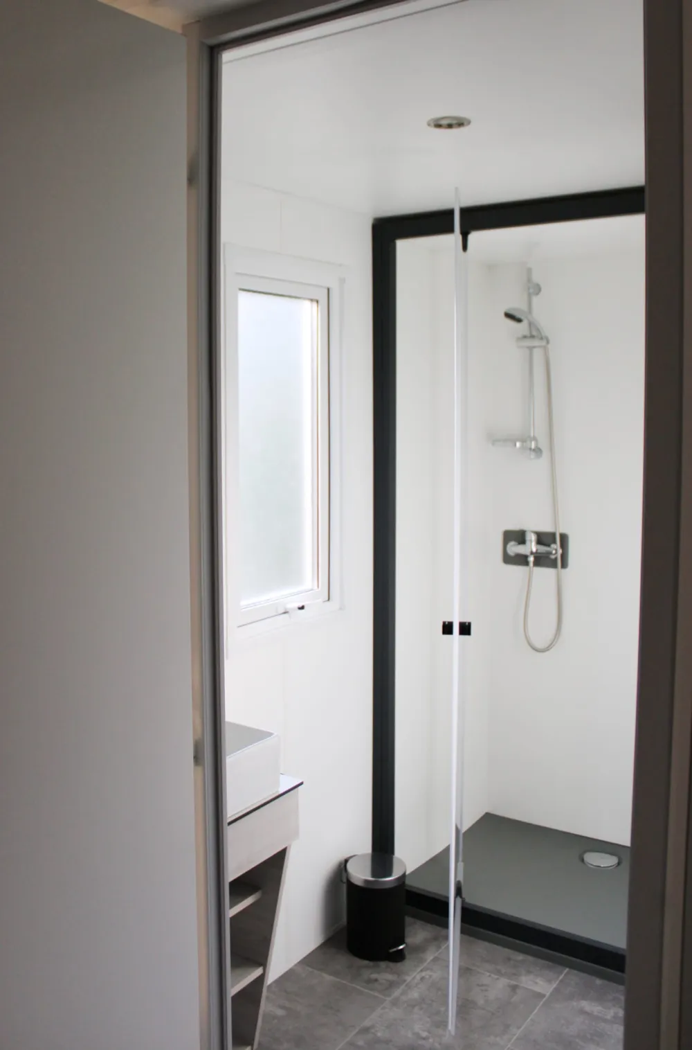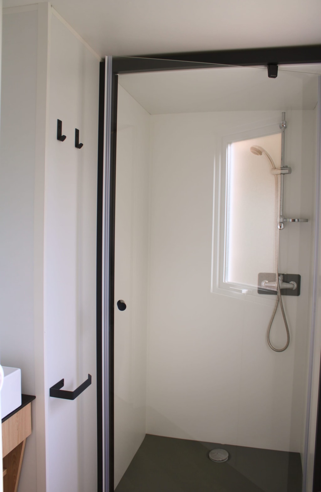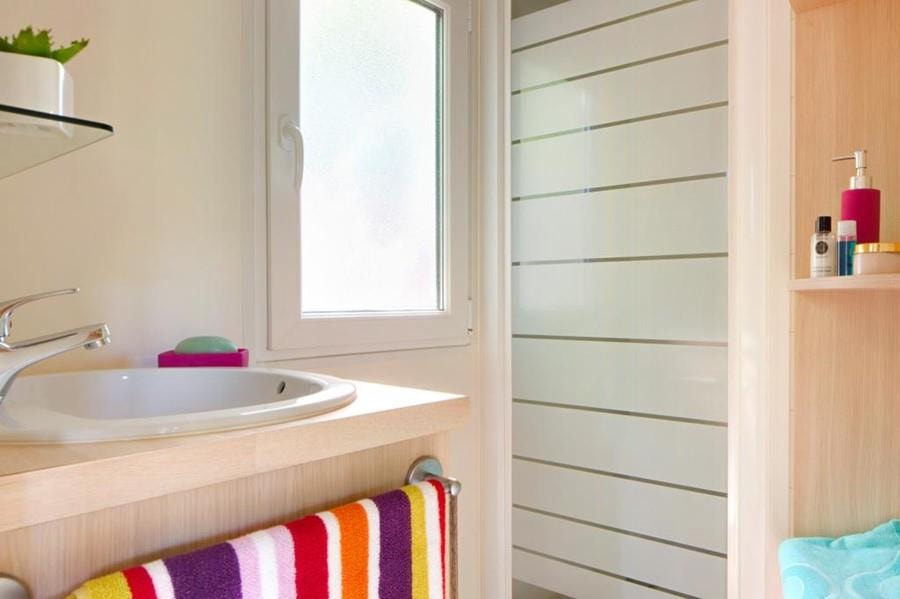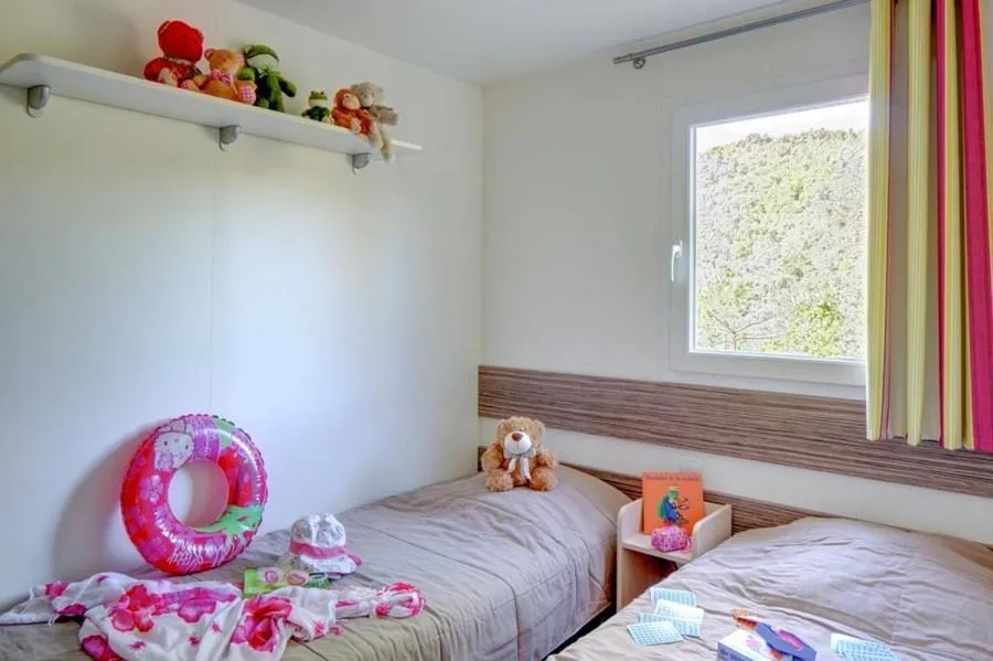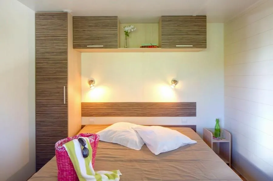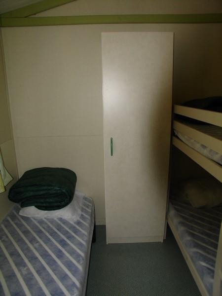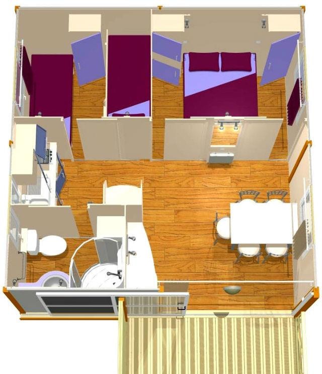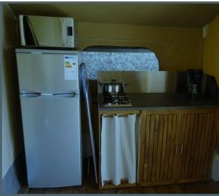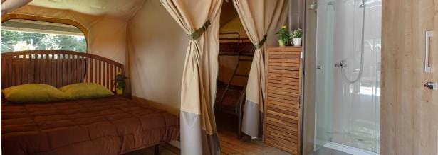 Lodge-Zelt von 34 m²: 2 Schlafzimmer, 1 Doppelbett (140X190), 1 Doppelbett (140X190) + 1 Etagenbett (90X190) - Küche mit Kühlschrank, Mikrowelle, Herd, elektrische Kaffeemaschine - Badezimmer mit Dusche, Waschbecken, WC - Geschirr - Kissen und Bettdecken werden gestellt.