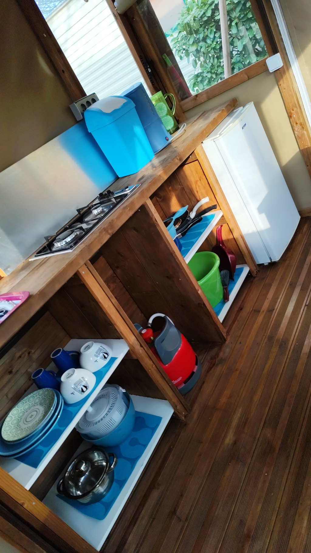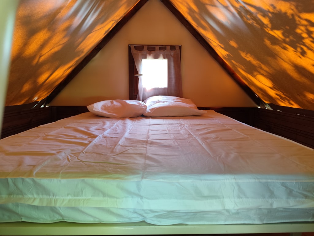 tente perchée, chambre au dessus d'une kitchinette avec lit 2 personnes