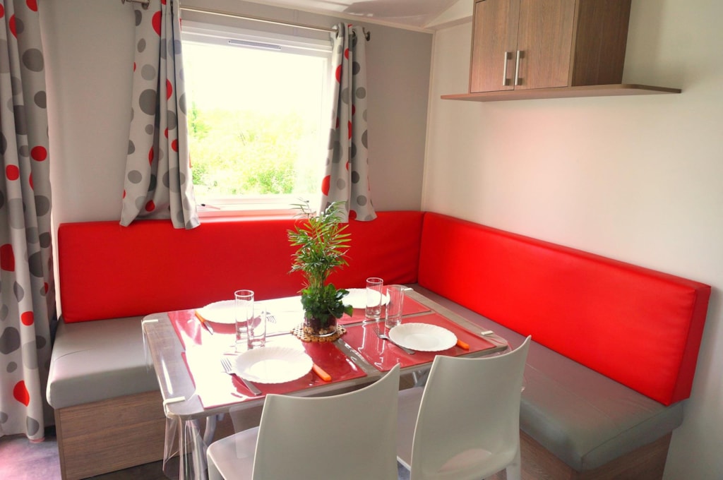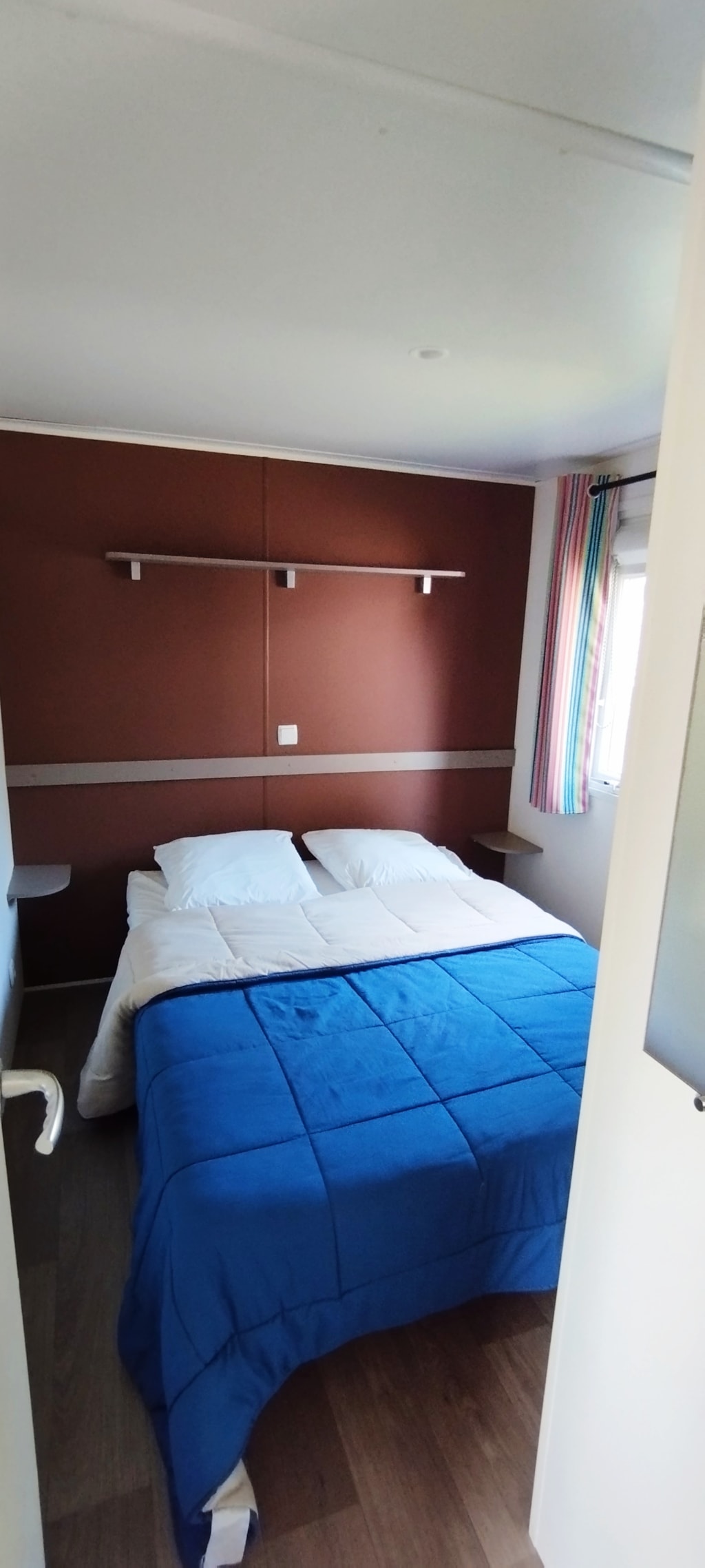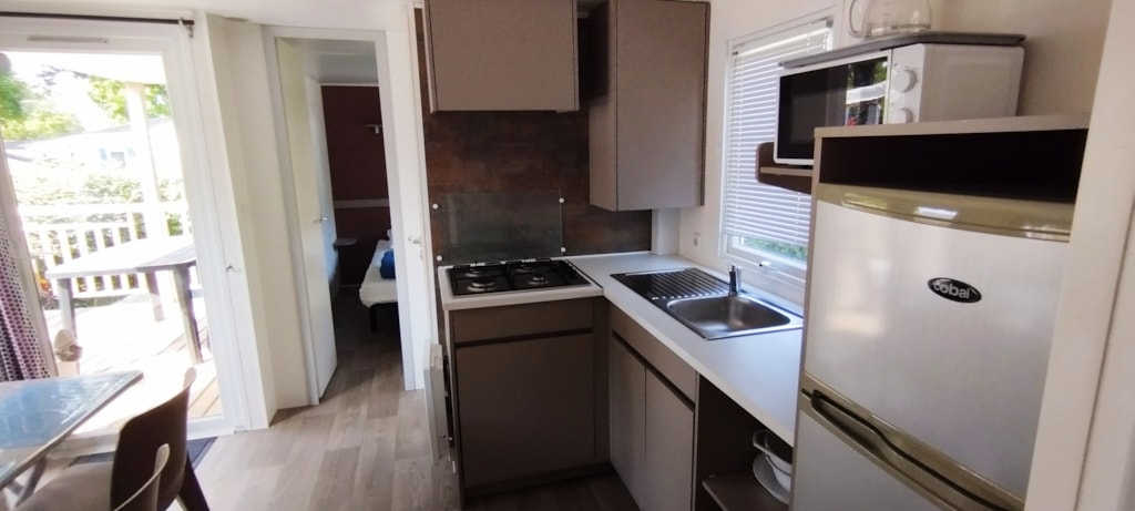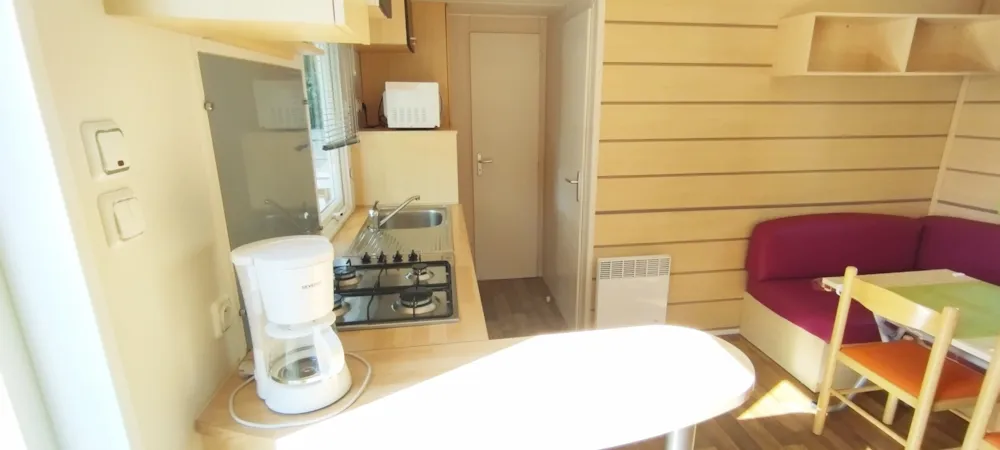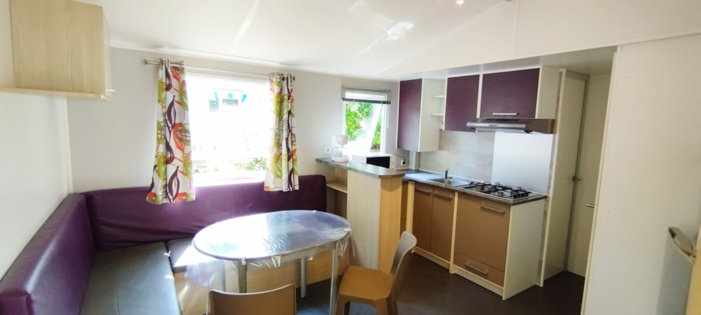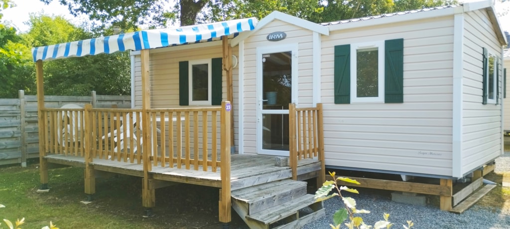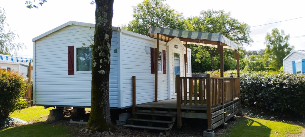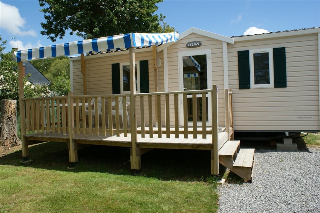 MOBILHEIM OUESSANT von 32 m2 (Modell 2013) mit halbüberdachter Terrasse von 12 m2. Sehr angenehmes Mobilheim in den Farben unserer schönen Südbretagne. Sehr gut ausgestattet und funktional, ideal für einen Urlaub mit Familie oder Freunden.